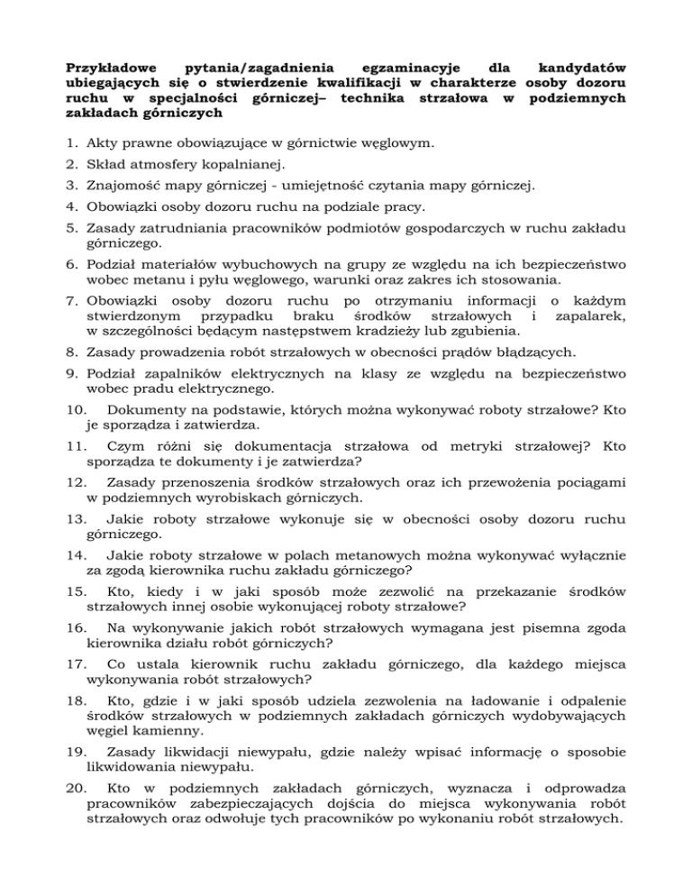 Przykładowe pytania/zagadnienia egzaminacyje dla kandydatów ubiegających się o stwierdzenie kwalifikacji w charakterze osoby dozoru ruchu w specjalności górniczej– technika strzałowa w podziemnych zakładach górniczych 1. Akty prawne obowiązujące w górnictwie węglowym. 2. Skład atmosfery kopalnianej. 3. Znajomość mapy górniczej - umiejętność czytania mapy górniczej. 4. Obowiązki osoby dozoru ruchu na podziale pracy. 5. Zasady zatrudniania pracowników podmiotów gospodarczych w ruchu zakładu górniczego. 6. Podział materiałów wybuchowych na grupy ze względu na ich bezpieczeństwo wobec metanu i pyłu węglowego, warunki oraz zakres ich stosowania. 7. Obowiązki osoby dozoru ruchu po otrzymaniu informacji stwierdzonym przypadku braku środków strzałowych i w szczególności będącym następstwem kradzieŜy lub zgubienia. o kaŜdym zapalarek, 8. Zasady prowadzenia robót strzałowych w obecności prądów błądzących. 9. Podział zapalników elektrycznych na klasy ze względu na bezpieczeństwo wobec pradu elektrycznego. 10. Dokumenty na podstawie, których moŜna wykonywać roboty strzałowe? Kto je sporządza i zatwierdza. 11. Czym róŜni się dokumentacja strzałowa od metryki strzałowej? Kto sporządza te dokumenty i je zatwierdza? 12. Zasady przenoszenia środków strzałowych oraz ich przewoŜenia pociągami w podziemnych wyrobiskach górniczych. 13. Jakie roboty strzałowe wykonuje się w obecności osoby dozoru ruchu górniczego. 14. Jakie roboty strzałowe w polach metanowych moŜna wykonywać wyłącznie za zgodą kierownika ruchu zakładu górniczego? 15. Kto, kiedy i w jaki sposób moŜe zezwolić na przekazanie środków strzałowych innej osobie wykonującej roboty strzałowe? 16. Na wykonywanie jakich robót strzałowych wymagana jest pisemna zgoda kierownika działu robót górniczych? 17. Co ustala kierownik ruchu zakładu górniczego, dla kaŜdego miejsca wykonywania robót strzałowych? 18. Kto, gdzie i w jaki sposób udziela zezwolenia na ładowanie i odpalenie środków strzałowych w podziemnych zakładach górniczych wydobywających węgiel kamienny. 19. Zasady likwidacji niewypału, gdzie naleŜy wpisać informację o sposobie likwidowania niewypału. 20. Kto w podziemnych zakładach górniczych, wyznacza i odprowadza pracowników zabezpieczających dojścia do miejsca wykonywania robót strzałowych oraz odwołuje tych pracowników po wykonaniu robót strzałowych. 21. Do czego słuŜy dziennik strzałowy i kto dokonuje w nim wpisów? 22. Obowiązki osoby dozoru w przypadku zaistnienia wypadku, awarii lub innego niebezpiecznego zdarzenia – procedura postępowania. 23. Jakie czynniki szkodliwe i uciąŜliwe dla zdrowia, występują w zakładach górniczych wydobywających węgiel kamienny? 24. Jakie środki zabezpieczające pracowników przed działaniem czynników szkodliwych lub uciąŜliwych dla zdrowia stosuje się w podziemnych zakładach górniczych wydobywających węgiel kamienny? 25. Jakie czynności powinna podjąć osoba znajdująca się w pobliŜu pracownika który uległ wypadkowi przy pracy lub zachorował ? 26. Czy moŜna zatrudniać pracowników w warunkach przekroczeń najwyŜszych dopuszczalnych stęŜeń dla pyłów szkodliwych dla zdrowia? 27. W jakich przypadkach ze względu na zagroŜenie pyłami szkodliwymi dla zdrowia nie wolno zatrudniać pracowników? 28. Wymienić kategorie zagroŜenia pyłami szkodliwymi dla zdrowia. 29. Czym róŜnią się między sobą półmaski przeciwpyłowe klas P-1, P-2 lub P-3?