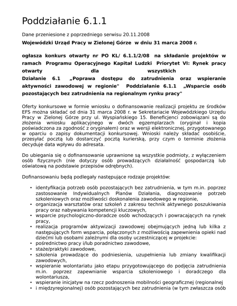 Poddziałanie 6.1.1 Dane przeniesione z poprzedniego serwisu 20.11.2008 Wojewódzki Urząd Pracy w Zielonej Górze w dniu 31 marca 2008 r. ogłasza konkurs otwarty nr PO KL/ 6.1.1/2/08 na składanie projektów w ramach Programu Operacyjnego Kapitał Ludzki Priorytet VI: Rynek pracy otwarty Działanie dla 6.1 „Poprawa wszystkich dostępu aktywności zawodowej w regionie" do zatrudnienia oraz Poddziałanie 6.1.1 wspieranie „Wsparcie osób pozostających bez zatrudnienia na regionalnym rynku pracy" Oferty konkursowe w formie wniosku o dofinansowanie realizacji projektu ze środków EFS można składać od dnia 31 marca 2008 r. w Sekretariacie Wojewódzkiego Urzędu Pracy w Zielonej Górze przy ul. Wyspiańskiego 15. Beneficjenci zobowiązani są do złożenia wniosku aplikacyjnego w dwóch egzemplarzach (oryginał i kopia poświadczona za zgodność z oryginałem) oraz w wersji elektronicznej, przygotowanego w oparciu o zapisy dokumentacji konkursowej. Wnioski należy składać osobiście, przesyłać pocztą lub dostarczyć pocztą kurierską, przy czym o terminie złożenia decyduje data wpływu do adresata. Do ubiegania się o dofinansowanie uprawnione są wszystkie podmioty, z wyłączeniem osób fizycznych (nie dotyczy osób prowadzących działalność gospodarczą lub oświatową na podstawie przepisów odrębnych). Dofinansowaniu będą podlegały następujące rodzaje projektów: • identyfikacja potrzeb osób pozostających bez zatrudnienia, w tym m.in. poprzez zastosowanie Indywidualnych Planów Działania, diagnozowanie potrzeb szkoleniowych oraz możliwości doskonalenia zawodowego w regionie, • organizacja warsztatów oraz szkoleń z zakresu technik aktywnego poszukiwania pracy oraz nabywania kompetencji kluczowych, • wsparcie psychologiczno-doradcze osób wchodzących i powracających na rynek pracy, • realizacja programów aktywizacji zawodowej obejmujących jedną lub kilka z następujących form wsparcia, połączonych z możliwością zapewnienia opieki nad dziećmi lub osobami zależnymi dla osoby uczestniczącej w projekcie: • pośrednictwo pracy i/lub poradnictwo zawodowe, • staże/praktyki zawodowe, • szkolenia prowadzące do podniesienia, uzupełnienia lub zmiany kwalifikacji zawodowych, • wspieranie wolontariatu jako etapu przygotowującego do podjęcia zatrudnienia m.in. poprzez zapewnianie wsparcia szkoleniowego i doradczego dla wolontariusza, • wspieranie inicjatyw na rzecz podnoszenia mobilności geograficznej (regionalnej • i międzyregionalnej) osób pozostających bez zatrudnienia (w tym zwłaszcza osób • • • • • • • zamieszkujących na obszarach wiejskich) m.in. poprzez dofinansowanie przejazdów z miejsca zamieszkania do miejsca pracy oraz zwrot kosztów zakwaterowania, upowszechnianie i promocja alternatywnych i elastycznych form zatrudnienia oraz metod organizacji pracy (w tym m.in. telepraca, praca w niepełnym wymiarze czasu pracy, praca rotacyjna), wsparcie doradczo – szkoleniowe pracownika, który uzyskał zatrudnienie w ramach projektu prowadzące do jego adaptacji w miejscu pracy (wsparcie pomostowe) organizacja kampanii promocyjnych i akcji informacyjnych mających na celu zachęcenie pracodawców do zatrudnienia osób z grup znajdujących się w szczególnej sytuacji na rynku pracy, opracowanie i rozpowszechnianie informacji o ofertach pracy, możliwościach udziału w szkoleniach i stażach oraz innych oferowanych usługach i instrumentach aktywizacji zawodowej, w tym m.in. poprzez zastosowanie nowoczesnych i wielokanałowych technik informacyjnych i komunikacyjnych, szkolenia oraz specjalistyczne doradztwo dla kadr instytucji rynku pracy działających na terenie regionu (z wyłączeniem Publicznych Służb Zatrudnienia), powiązane ze specyfiką zadań realizowanych przez te instytucje na regionalnym rynku pracy, rozwój dialogu, partnerstwa publiczno – społecznego i współpracy na rzecz rozwoju zasobów ludzkich na poziomie regionalnym i lokalnym, - prowadzenie, publikowanie i upowszechnianie badań i analiz dotyczących sytuacji na regionalnym i lokalnym rynku pracy, w tym m.in. tworzenie regionalnych obserwatoriów rynku pracy oraz monitoring migracji zarobkowych na terenie regionu. Złożony przez Beneficjenta wniosek o dofinansowanie realizacji projektu podlega w pierwszej kolejności ocenie pod względem spełniania ogólnych kryteriów formalnych, tj.: • • • • • • • • • • czy wniosek złożono we właściwej instytucji, czy wniosek stanowi odpowiedź na konkurs, czy wniosek został złożony we właściwym terminie, czy wniosek wypełniono w języku polskim, czy wniosek sporządzono na obowiązującym formularzu, czy wniosek jest kompletny (wydruk zawiera wszystkie strony, jest opatrzony pieczęcią wnioskodawcy i podpisany przez upoważnione osoby), czy suma kontrolna papierowej i elektronicznej wersji wniosku jest tożsama na wszystkich stronach wniosku, czy wypełniono wszystkie wymagane pola we wniosku, czy projekt stanowi odpowiedź na konkurs (np. zgodność z programem operacyjnym, z działaniem), czy wnioskodawca jest uprawniony do ubiegania się o dofinansowanie projektu (tzn. czy nie podlega wykluczeniu na podstawie art. 211 ustawy z dnia 30 czerwca 2005 r. o finansach publicznych). W następnym etapie weryfikacji formalnej ocenie podlegają tzw. szczegółowe kryteria dostępu, tj. : • W ramach Poddziałania kwalifikować się będą projekty o minimalnej wartości 50 000 zł. • W ramach Poddziałania kwalifikować się będą projekty realizowane wyłącznie na terenie województwa lubuskiego. • W ramach Poddziałania kwalifikować się będą projekty, których zakładany okres realizacji nie przekracza 2 lat. Kolejnym etapem oceny jest weryfikacja merytoryczna: 1. Ogólnych kryteriów merytorycznych, które obejmują: • kryteria jakości projektu: • uzasadnienie potrzeby realizacji projektu w kontekście celów szczegółowych określonych dla danego 