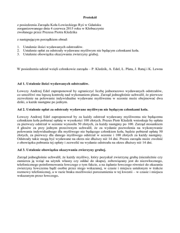 Protokół z posiedzenia Zarządu Koła Łowieckiego Ryś w Gdańsku zorganizowanego dnia 4 czerwca 2015 roku w Kłobuczynie zwołanego przez Prezesa Piotra Kledzika z następującym porządkiem obrad: 1. Ustalenie ilości wydawanych odstrzałów. 2. Ustalenie opłat za odstrzały wydawane myśliwym nie będącym członkami koła. 3. Ustalenie obowiązku okazywania zwierzyny grubej. W posiedzeniu udział wzięli członkowie zarządu – P. Kledzik, A. Edel, Ł. Plata, J. Rataj i K. Lewna Ad 1. Ustalenie ilości wydawanych odstrzałów. Łowczy Andrzej Edel zaproponował by ograniczyć liczbę jednorazowo wydawanych odstrzałów, co umożliwi mu lepszą kontrolę nad wykonaniem planu. Zarząd jednogłośnie uchwalił, że pierwsze zezwolenie na polowanie indywidualne wydawane myśliwemu w sezonie może obejmować dwa dziki, a każde następne po jednym. Ad 2. Ustalenie opłat za odstrzały wydawane myśliwym nie będącym członkami koła. Łowczy Andrzej Edel zaproponował by za każdy odstrzał wydawany myśliwemu nie będącemu członkiem koła pobierać opłatę w wysokości 100 złotych. Prezes Piotr Kledzik wnioskuje by opłata za pierwszy odstrzał w sezonie wynosiła 50 złotych, za każdy następny po 100. Zarząd stosunkiem 4 głosów za przy jednym przeciwnym uchwalił, że za wydanie pozwolenia na wykonywanie polowania indywidualnego dla myśliwego nie będącego członkiem koła, będzie pobierał opłatę 50 złotych, za pierwszy dla danego myśliwego odstrzał w sezonie i 100 złotych za każdy następny. Odstrzały takie mogą być wydawane na okres nie dłuższy niż 14 dni. Prezes zarządu może zwolnić z obowiązku pobrania tej opłaty i zezwolić na wydanie odstrzału na okres dłuższy niż 14 dni. Ad 3. Ustalenie obowiązku okazywania zwierzyny grubej. Zarząd jednogłośnie uchwalił, że każdy myśliwy, który pozyskał zwierzynę grubą (niezależnie czy zamierza ją wziąć na użytek własny czy oddać do skupu), zobowiązany jest do niezwłocznego, telefonicznego poinformowania łowczego o tym fakcie, a na żądanie łowczego również do okazania zwierzyny łowczemu bądź osobie przez niego wskazanej, w czasie i miejscu ustalonym w trakcie rozmowy telefonicznej, a w razie braku możliwości porozumienia w tej kwestii – w czasie i miejscu wskazanym przez łowczego.