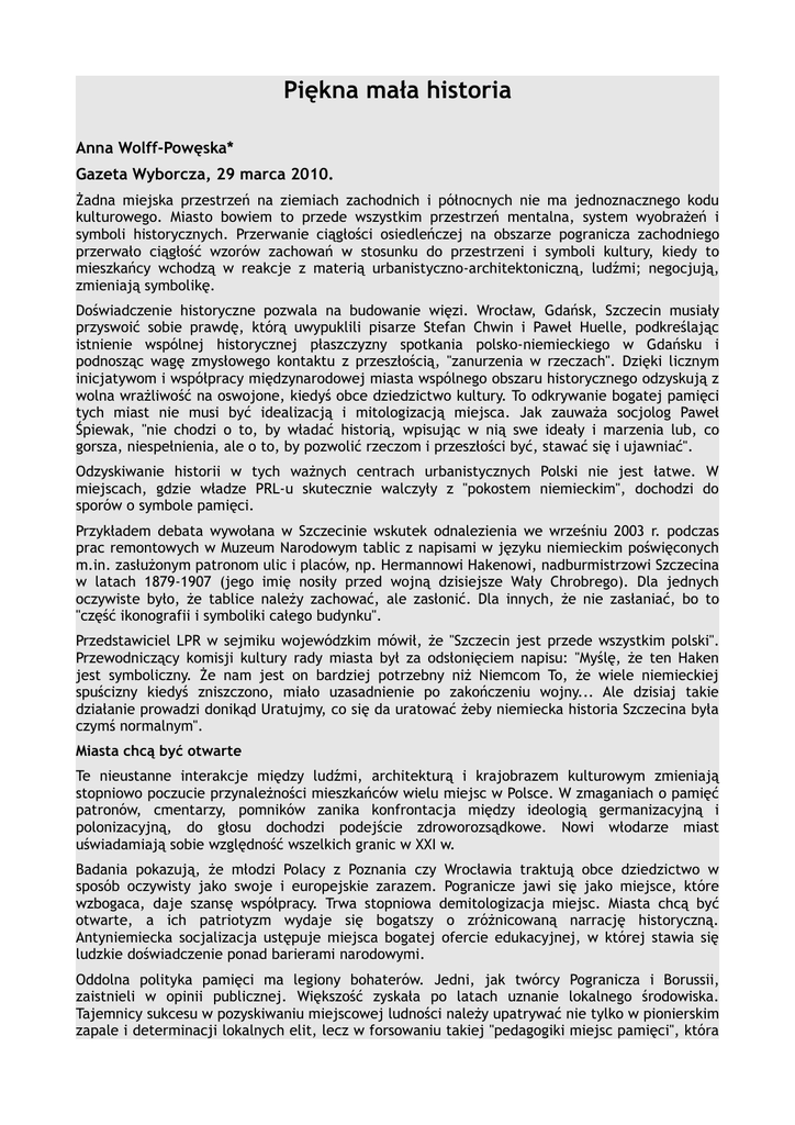 Piękna mała historia Anna Wolff-Powęska* Gazeta Wyborcza, 29 marca 2010. Żadna miejska przestrzeń na ziemiach zachodnich i północnych nie ma jednoznacznego kodu kulturowego. Miasto bowiem to przede wszystkim przestrzeń mentalna, system wyobrażeń i symboli historycznych. Przerwanie ciągłości osiedleńczej na obszarze pogranicza zachodniego przerwało ciągłość wzorów zachowań w stosunku do przestrzeni i symboli kultury, kiedy to mieszkańcy wchodzą w reakcje z materią urbanistyczno-architektoniczną, ludźmi; negocjują, zmieniają symbolikę. Doświadczenie historyczne pozwala na budowanie więzi. Wrocław, Gdańsk, Szczecin musiały przyswoić sobie prawdę, którą uwypuklili pisarze Stefan Chwin i Paweł Huelle, podkreślając istnienie wspólnej historycznej płaszczyzny spotkania polsko-niemieckiego w Gdańsku i podnosząc wagę zmysłowego kontaktu z przeszłością, "zanurzenia w rzeczach". Dzięki licznym inicjatywom i współpracy międzynarodowej miasta wspólnego obszaru historycznego odzyskują z wolna wrażliwość na oswojone, kiedyś obce dziedzictwo kultury. To odkrywanie bogatej pamięci tych miast nie musi być idealizacją i mitologizacją miejsca. Jak zauważa socjolog Paweł Śpiewak, "nie chodzi o to, by władać historią, wpisując w nią swe ideały i marzenia lub, co gorsza, niespełnienia, ale o to, by pozwolić rzeczom i przeszłości być, stawać się i ujawniać". Odzyskiwanie historii w tych ważnych centrach urbanistycznych Polski nie jest łatwe. W miejscach, gdzie władze PRL-u skutecznie walczyły z "pokostem niemieckim", dochodzi do sporów o symbole pamięci. Przykładem debata wywołana w Szczecinie wskutek odnalezienia we wrześniu 2003 r. podczas prac remontowych w Muzeum Narodowym tablic z napisami w języku niemieckim poświęconych m.in. zasłużonym patronom ulic i placów, np. Hermannowi Hakenowi, nadburmistrzowi Szczecina w latach 1879-1907 (jego imię nosiły przed wojną dzisiejsze Wały Chrobrego). Dla jednych oczywiste było, że tablice należy zachować, ale zasłonić. Dla innych, że nie zasłaniać, bo to "część ikonografii i symboliki całego budynku". Przedstawiciel LPR w sejmiku wojewódzkim mówił, że "Szczecin jest przede wszystkim polski". Przewodniczący komisji kultury rady miasta był za odsłonięciem napisu: "Myślę, że ten Haken jest symboliczny. Że nam jest on bardziej potrzebny niż Niemcom To, że wiele niemieckiej spuścizny kiedyś zniszczono, miało uzasadnienie po zakończeniu wojny... Ale dzisiaj takie działanie prowadzi donikąd Uratujmy, co się da uratować żeby niemiecka historia Szczecina była czymś normalnym". Miasta chcą być otwarte Te nieustanne interakcje między ludźmi, architekturą i krajobrazem kulturowym zmieniają stopniowo poczucie przynależności mieszkańców wielu miejsc w Polsce. W zmaganiach o pamięć patronów, cmentarzy, pomników zanika konfrontacja między ideologią germanizacyjną i polonizacyjną, do głosu dochodzi podejście zdroworozsądkowe. Nowi włodarze miast uświadamiają sobie względność wszelkich granic w XXI w. Badania pokazują, że młodzi Polacy z Poznania czy Wrocławia traktują obce dziedzictwo w sposób oczywisty jako swoje i europejskie zarazem. Pogranicze jawi się jako miejsce, które wzbogaca, daje szansę współpracy. Trwa stopniowa demitologizacja miejsc. Miasta chcą być otwarte, a ich patriotyzm wydaje się bogatszy o zróżnicowaną narrację historyczną. Antyniemiecka socjalizacja ustępuje miejsca bogatej ofercie edukacyjnej, w której stawia się ludzkie doświadczenie ponad barierami narodowymi. Oddolna polityka pamięci ma legiony bohaterów. Jedni, jak twórcy Pogranicza i Borussii, zaistnieli w opinii publicznej. Większość zyskała po latach uznanie lokalnego środowiska. Tajemnicy sukcesu w pozyskiwaniu miejscowej ludności należy upatrywać nie tylko w pionierskim zapale i determinacji lokalnych elit, lecz w forsowaniu takiej "pedagogiki miejsc pamięci", która nie antagonizuje, a to, co lokalne, przekłada na język uniwersalny. Andrzej Cechnicki, psychiatra z Krakowa, koordynator ogólnopolskiego projektu "Schizofrenia: otwórzcie drzwi", zainicjował utworzenie Polsko-Niemieckiego Towarzystwa Zdrowia Psychicznego. Razem z niemieckimi lekarzami konfrontuje się z najbardziej tragicznym rozdziałem historii, zbrodnią nazistów popełnioną na ludziach psychicznie chorych. Pierwszym krokiem była podróż 30-osobowej grupy niemieckich psychiatrów w maju 1987 r. - pielgrzymka śladem miejsc kaźni. Przybyli pełni obaw, ale też nadziei na oczyszczenie przez wspólną refleksję; pozostali do dziś przyjaciółmi. Ponad 50 partnerstw łączących psychiatrów, pacjentów i ich rodziny, wspólne wydawnictwa, dziesiątki konferencji i warsztatów, skupiających obok Polaków i Niemców - Żydów i Ukraińców, to świadectwo kultury pamięci, która łączy. Teatr w stodole Lokalne metamorfozy dokonały się najskuteczniej tam, gdzie historię pobudzano do życia przez teatr, muzykę czy tekst literacki. "Lęk naszej kultury przed obcymi jest oznaką jej słabości i niedojrzałości zakompleksionych użytkowników - pisze w wydanej przez Pogranicze książce "Warto zapytać o kulturę" Jan Kamiński, nauczyciel z Białegostoku, jeden z redaktorów pisma "Kartki". Wolontariusze rozsiani po odległych zakątkach Podlasia przekonują, że kultury mocno osadzone w tradycji w zetknięciu z innymi krzepną. Irena Grablunas z Burbiszek nad jeziorem Gaładuś, która od dziecka spotykała się ze środowiskiem wielokulturowym, czuje się wyróżniona poprzez pokonywanie różnych granic - bo "kultura nabiera wyrazu, istniejąc obok innej". Polska pamięć historyczna wiele zawdzięcza Bożenie Szroeder, współtwórczyni Pogranicza. To z jej inicjatywy tutejsze dzieci zapukały do drzwi domów starych ludzi, by opowiedzieli swą historię i historię miejsca. Spisały, namalowały na płótnie, wypisały nazwi