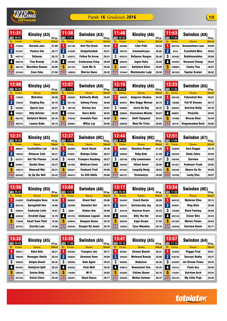 16 11:31 05-01 11:38 Kinsley (A3) 462 17-01 213544 Barnish Jaxx 27.90 341126 412161 Punters Gal 28.17 442114 Tellymac 28.15 2016 11:46 Swindon (A3) 480 05-02 Arnt You Great 29.50 655266 412236 Aintgottwobob 29.31 543315 Follow De Arrow 29.41 1/5 11:53 Kinsley (A6) 462 Lilac Path 28.54 342152 Ivenewsforyou 655513 Ballymac Keegan 17-02 Swindon (A8) 480 624122 Grenanstown Lass 29.99 28.62 2415 Crossfield Minx 30.03 28.46 523423 Bubblesnrubies 29.68 436146 Fine Brandy 27.95 232363 Coolavanny Crisp 29.49 563242 Jogon Duke 28.65 444454 Harwood Champ 29.82 463132 Marathon Runner 28.06 241154 Cash Me In 29.40 254421 Battyford Silver 28.69 236663 Caulry Tina 30.07 531454 Cnoc Eske 27.98 145634 Warrior Gwen 29.32 315444 Westminster Lady 28.58 361224 Topstar Scolari 30.02 12:00 05-03 12:07 Kinsley (A4) 462 113532 Metroline 123442 324362 17-03 12:16 Swindon (A8) 480 05-04 12:23 Kinsley (A6) 462 17-04 Swindon (A5) 480 28.20 423223 Ballinulty Molly 29.83 332325 Ashgrove Shadow 28.58 655156 Fahrenheit Ben Cloghog Boy 28.18 521135 Ashway Penny 30.06 655641 Wee Doggy Woman 28.72 136366 Full Of Dreams 29.72 Sparta Lynx 28.27 162146 Beckey Ace 29.91 636663 Jacks De Boy 28.42 636253 Suirview Batty 29.76 145321 Billy Butcher 28.29 615341 Barro Belle 30.02 226664 Clounamon Master 28.67 566651 Pinarello 29.82 652145 Battyford Maisie 28.16 316242 Arondale Flyer 30.06 446654 Swift Topspeed 28.54 141666 Beccas Rose 29.48 463141 Leonas Babe 28.13 556561 Wiliss Lay 29.98 256535 Must Be Trixie 28.62 164131 Kingsmeadow Rock 29.60 12:31 05-05 12:37 Kinsley (A5) 462 17-05 Swindon (HC) 480 12:44 05-06 12:51 Kinsley (HC) 650 17-06 29.67 Swindon (A7) 480 366321 Castledillon Lad 28.42 454563 Uncle Donal 30.36 653662 Shanless Draper 41.20 323636 Aero Reggie 29.76 142533 Kilmacar Cain 28.41 615641 Bishops Collar 30.37 435533 Baby Bale 41.58 324423 Slade Zebra 29.93 521311 Got The Flavour 28.40 441622 Trumpers Headwig 30.27 232136 Lilly Lawnmower 41.27 432442 Suirview 29.62 344621 Double Diner 28.47 251565 Mohican Ennis 29.87 234455 Velvet Annie 40.86 221221 Fealesuir Frank 29.95 145514 Almoradi Mai 28.31 545341 Fealesuir Fred 29.80 541224 Longslip Benjy 40.83 242343 Ahsure Go On 29.80 625442 Ay Up Our Nell 28.42 454414 Cu Sith Ghille 29.86 642121 Terminatryx 40.86 124162 Lucky Elsa 29.97 12:58 05-07 13:08 Kinsley (D3) 268 17-07 13:17 Swindon (A6) 480 05-08 13:24 Kinsley (A4) 462 17-08 Swindon (HC) 480 514252 Cooltemples Boss 16.58 565655 Orient Razl 29.98 244442 Czech Hunter 28.08 646133 Mohican Elise 29.74 625153 Springfield Hen 16.66 232563 Rastafari Girl 29.75 243131 Gurtnacrehy Joy 28.29 544621 Bing Dixie 29.68 422644 Cashcube Lotto 16.61 22661 Hedsor Baz 29.99 434144 Hanoras Grace 28.23 142266 Blaze Fantasy 29.60 445343 Brickhill Zippy 16.70 241315 Inishowen Legend 30.00 332536 Billy The Kid 28.03 552143 Clover Blitz 29.53 112646 Small Town Thief 16.56 545645 Dunquin House 29.70 655342 Cape Dream 27.93 651325 Maries Flower 29.63 321612 Scarthy Lass 16.56 653535 Steeple Rd Jewel 29.79 153524 Tyrur Mandela 28.10 242246 Suirview Route 29.17 13:33 05-09 13:39 Kinsley (A5) 462 17-09 13:47 Swindon (A5) 480 05-10 13:57 Kinsley (A5) 462 17-10 164411 Koka Kola 28.21 255422 Trumpers Jon 29.71 322361 Geneva Bonnie 28.51 124225 136246 Honeygar Abella 28.44 443634 Airmount Gene 29.68 424224 Melwood Beauty 28.60 335522 Unique Denzil 28.42 226365 Bale Again 29.45 563365 Radancer 28.38 624353 Battyford Split 28.25 422333 Posh Moll 29.35 555613 Newmarket Tom 28.45 532544 Sonias Baby 28.38 116364 Wi Fi 29.62 254325 Eskimo Queen 28.19 551434 Velvet Chico 28.36 433451 Ghost Dance 29.77 242526 Welton Autumn 28.37 Swindon (A4) 480 Peggys Fred 29.61 616132 Darceys Bobby 29.57 543353 Jet Stream Power 29.45 134141 Pauls Ace 29.50 115451 Suirview Arch 29.54 252124 My Little Flojo 29.46 16 14:04 05-11 14:11 Kinsley (D4) 268 17-11 2016 14:19 Swindon (A3) 480 05-12 2/5 462 Newlodge Caitlin 16.98 353535 Jet Stream Haze 29.43 643213 Russanda Rory 515236 Honey Trap 16.85 366611 Aero Frenzy 29.60 332643 365646 Barnish Gareth 16.87 344514 Leigh Vicky 29.60 142353 165666 Morell Mikey 16.83 131425 Rathnasare Hero 29.34 414233 666233 Jell On Rich 16.83 624163 Suirview Ber 29.48 515246 525645 Isabella Clare 16.77 654422 Shaws Madam 29.26 443111 456664 14:33 05-13 14:44 Kinsley (A7) 462 656231 Corach Charlie 336541 451462 17-13 Swindon (HC) 480 14:49 05-14 28.72 236121 Touch On Rodney 29.91 221151 Knockmant Hunter 28.83 441542 Droumeragh Lucy 29.83 Ballymac Shadow 28.87 653643 Teresas Gem 29.85 655333 Ellens Lady 28.89 446532 Killacolla Lord 152663 Battyford Queen 28.91 351513 444625 Brykar Earl 28.45 321151 15:08 04-01 15:18 Hove (A10) 515 06-01 14:27 Kinsley (A4) 17-12 451311 Ardrahan Zeann 29.21 Barefoot Giada 28.02 223216 Jet Stream Flash 29.27 Local Whistler 28.16 164154 Wise Choice 29.16 Derryhogan Leo 28.07 412453 Fridays Wispa 29.01 Rigger Jake 28.21 442533 Portmagee Bound 28.98 Cissies Bell 28.19 163125 Jet Stream Lilly 29.31 14:58 Kinsley (D2) 268 17-14 16.37 245653 415511 Bantam Beau 16.38 235142 Old Fort Spice 16.39 29.37 226215 Shedan Sunrise Eclipse 29.29 112114 Suirview Pink 29.18 543252 480 15:27 04-02 480 28.30 Howya Mags Monmore (A5) Swindon (A2) Swindon (A3) 480 Fleetwood Sailor 29.32 111332 Westwell Alfie 29.44 415241 Suirview Jordan 29.42 16.39 232112 Ballymac Magic 29.44 Copper Coated 16.43 115441 Alarming Khaos 29.42 Glenvale Rickie 16.22 254163 Smokestack Levi 29.38 15:37 Hove (A5) 515 06-02 Monmore (A7) 480 261556 Ellaha Diamond 30.85 3 Pakkashilly 29.15 262331 Honeygar Jade 30.50 455343 Positive Dream 29.55 3 Ballymac Barnes 31.37 123523 Rushmoor Leroy 29.14 222131 Who Needs Chaos 30.61 124555 Landown Amazem 29.21 6 Anelda 31.27 546316 El Gondo 29.03 541364 Punk Rock Prince 30.56 342 Tudor Dynasty 29.68 465451 Miny Mo 30.94 413544 Colarhouse Hope 29.06 456153 Daylens Volcano 30.35 626615 Clemmas Ares 29.43 242414 Droopys Zip 31.22 424626 Blue Freedom 28.95 325156 Droopys Cyric 30.34 452563 Gerrards Girl 29.23 133235 Rockmount Katie 