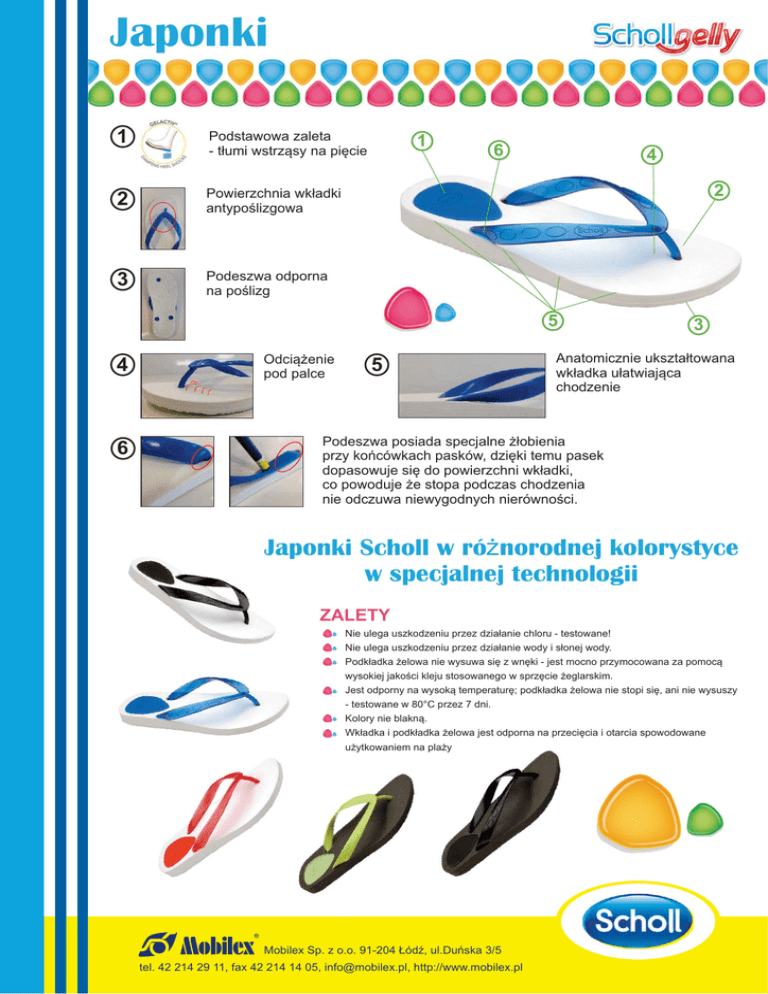 Japonki 1 Podstawowa zaleta - tłumi wstrząsy na pięcie 2 Powierzchnia wkładki antypoślizgowa 3 Podeszwa odporna na poślizg 1 6 4 2 5 4 6 Odciążenie pod palce 5 3 Anatomicznie ukształtowana wkładka ułatwiająca chodzenie Podeszwa posiada specjalne żłobienia przy końcówkach pasków, dzięki temu pasek dopasowuje się do powierzchni wkładki, co powoduje że stopa podczas chodzenia nie odczuwa niewygodnych nierówności. Japonki Scholl w różnorodnej kolorystyce w specjalnej technologii ZALETY Nie ulega uszkodzeniu przez działanie chloru - testowane! Nie ulega uszkodzeniu przez działanie wody i słonej wody. Podkładka żelowa nie wysuwa się z wnęki - jest mocno przymocowana za pomocą wysokiej jakości kleju stosowanego w sprzęcie żeglarskim. Jest odporny na wysoką temperaturę; podkładka żelowa nie stopi się, ani nie wysuszy - testowane w 80°C przez 7 dni. Kolory nie blakną. Wkładka i podkładka żelowa jest odporna na przecięcia i otarcia spowodowane użytkowaniem na plaży Mobilex Sp. z o.o. 91-204 Łódź, ul.Duńska 3/5 tel. 42 214 29 11, fax 42 214 14 05, [email protected], http://www.mobilex.pl