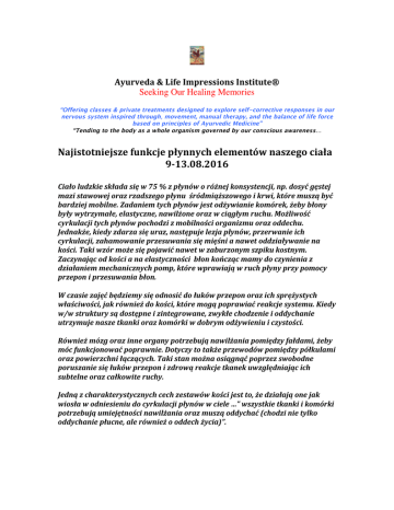Ayurveda & Life Impressions Institute® Seeking Our Healing Memories “Offering classes & private treatments designed to explore self-corrective responses in our nervous system inspired through, movement, manual therapy, and the balance of life force based on principles of Ayurvedic Medicine” “Tending to the body as a whole organism governed by our conscious awareness… Najistotniejsze funkcje płynnych elementów naszego ciała 9-‐13.08.2016 Ciało ludzkie składa się w 75 % z płynów o różnej konsystencji, np. dosyć gęstej mazi stawowej oraz rzadszego płynu śródmiąższowego i krwi, które muszą być bardziej mobilne. Zadaniem tych płynów jest odżywianie komórek, żeby błony były wytrzymałe, elastyczne, nawilżone oraz w ciągłym ruchu. Możliwość cyrkulacji tych płynów pochodzi z mobilności organizmu oraz oddechu. Jednakże, kiedy zdarza się uraz, następuje lezja płynów, przerwanie ich cyrkulacji, zahamowanie przesuwania się mięśni a nawet oddziaływanie na kości. Taki wzór może się pojawić nawet w zaburzonym szpiku kostnym. Zaczynając od kości a na elastyczności błon kończąc mamy do czynienia z działaniem mechanicznych pomp, które wprawiają w ruch płyny przy pomocy przepon i przesuwania błon. W czasie zajęć będziemy się odnosić do łuków przepon oraz ich sprężystych właściwości, jak również do kości, które mogą poprawiać reakcje systemu. Kiedy w/w struktury są dostępne i zintegrowane, zwykłe chodzenie i oddychanie utrzymuje nasze tkanki oraz komórki w dobrym odżywieniu i czystości. Również mózg oraz inne organy potrzebują nawilżania pomiędzy fałdami, żeby móc funkcjonować poprawnie. Dotyczy to także przewodów pomiędzy półkulami oraz powierzchni łączących. Taki stan można osiągnąć poprzez swobodne poruszanie się łuków przepon i zdrową reakcje tkanek uwzględniając ich subtelne oraz całkowite ruchy. Jedną z charakterystycznych cech zestawów kości jest to, że działają one jak wiosła w odniesieniu do cyrkulacji płynów w ciele …” wszystkie tkanki i komórki potrzebują umiejętności nawilżania oraz muszą oddychać (chodzi nie tylko oddychanie płucne, ale również o oddech życia)”. Ayurveda & Life Impressions Institute® Seeking Our Healing Memories “Offering classes & private treatments designed to explore self-corrective responses in our nervous system inspired through, movement, manual therapy, and the balance of life force based on principles of Ayurvedic Medicine” “Tending to the body as a whole organism governed by our conscious awareness… Równoważenie cylindrów i rękawów 16-‐20.08.2016 Mamy trzy strukturalne cylindry (więcej informacji można przeczytać w mojej książce dotyczącej cylindrów) pomiędzy którymi znajdują się warstwy zawierające płyny, które „pływają” oddziaływując na siebie wzajemnie. Jest ważne, żebyśmy świadomie odnosili się do tych trzech cylindrów. Na przykład: jeżeli mamy do czynienia z problemem dotyczącym żeber a wewnętrzny cylinder ramienia nie jest włączony do zabiegu, nadwyrężony wzór może nie ulec poprawie, a nawet może się pogłębić. W czasie zajęć będziemy badać metody pozwalające systemowi, żeby „upłynnił” warstwy w cylindrach, tworząc nowe relacje pomiędzy nimi, które to zmiany osobiście zainicjowane przez klienta, są wspierane przez terapeutę. Będziemy badać: rękawy tkanek, rękawy powięzi, rękaw okołokostnowy, kości i szpik kostny. Na przykład: dotkliwie skręcona kostka przytrzymana miejscowo w okolicy skręcenia, podczas gdy pracujemy nad klarownością w cylindrach harmonizując warstwy odnosząc się do napięcia w całej nodze, biodrze, bocznych żebrach oraz czaszce. Taki zabieg może przynieść ulgę. W niektórych przypadkach przemiany mogą występować w głównym cylindrze ciała, w kręgosłupie. Kiedy prowadzimy zabieg warstwy w rękawie promieniujące na zewnątrz mogą być zaburzone i nie reagować. Na przykład: upadek na kość krzyżową, -‐ uraz może być zlokalizowany w zewnętrznych warstwach kości miednicy, bioder i tkanek, które mają za zadanie chronienie. Dlatego trzeba wyklarować trzy cylindry, żeby miały płynność i zlokalizowały warstwy tkanki, które utrzymują uraz.