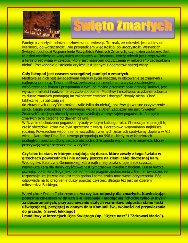 Pamięć o zmarłych odróżnia człowieka od zwierząt. To znak, że człowiek jest zdolny do wierności, do wdzięczności. Nie przypadkiem więc Kościół po uroczystości Wszystkich Świętych obchodzi Wspomnienie Wszystkich Wiernych Zmarłych, czyli dzień zaduszny. Jest to dzień modlitwy za wszystkich wierzących w Chrystusa, którzy odeszli już z tego świata, a teraz przebywają w czyśćcu, który jest miejscem oczyszczenia w miłości i "przedsionkiem nieba". Przekonanie o istnieniu czyśćca jest jednym z dogmatów naszej wiary. Cały listopad jest czasem szczególnej pamięci o zmarłych. Modlitwa za nich jest świadectwem wiary w życie wieczne, w obcowanie ze zmarłymi i najlepszą pomocą. Taka modlitwa, zwłaszcza na cmentarzu, wyrywa z szaleństwa współczesnego świata i przypomina o tym, co można przenieść poza granicę śmierci, jest wyrazem miłości i nadziei na przyszłe spotkanie. Modlitwy i możliwość uzyskania odpustu za dusze zmarłych pomagają im zakończyć czyściec i dostąpić chwały nieba. Choć faktycznie już zaliczają się do zbawionych (z czyśćca można trafić tylko do nieba), przeżywają własne oczyszczenie serca. Ciągle potrzebują modlitewnego wsparcia.Dzień Zaduszny nie jest "Świętem Zmarłych", ale jego obchody po części wynikają ze zwyczajów pogańskich. Pamięć o zmarłych była czczona od dawien dawna. W Rzymie obchodzono pogańskie rytuały w lutym każdego roku. Chrześcijanie przejęli tę cześć obrzędów, która nie była sprzeczna z wiarą. Początkowo wspominano najbliższą rodzinę. Powszechne wspomnienie wszystkich wiernych zmarłych spotykamy dopiero w VII wieku. Narodziny Dnia Zadusznego przypadają na 998 r., kiedy to w klasztorach podległych opactwu Cluny zaczęto obchodzić 2 listopada wspomnienie zmarłych, którzy przeżywają swoje oczyszczenie w czyśćcu. Czyściec to stan, w którym znajdują się dusze, które zeszły z tego świata w grzechach powszednich i nie odbyły jeszcze na ziemi całej doczesnej kary. Według św. Katarzyny Genueńskiej, która najtrafniej pisała o tajemnicy czyśćca, największą karą dla duszy czyśćcowej jest tymczasowa rozłąka z Bogiem. Dusza ludzka poznając po śmierci Boga jako pełnię miłości pragnie zjednoczenia z Nim, a równocześnie rozpoznaje, że jeszcze nie jest tego godna i sama szuka możliwości oczyszczenia. Bóg odpowiada na to pragnienie duszy poprzez czyściec, dlatego też jest on dziełem miłosierdzia Boskiego. W związku z Dniem Zadusznym można uzyskać odpusty dla zmarłych. Nawiedzając pobożnie cmentarz w dniach 2-8 listopada i modląc się "choćby tylko w myśli" za dusze zmarłych, przy zachowaniu stałych warunków odpustu: stanu łaski uświęcającej, przyjętej w danym dniu Komunii św., wolności od przywiązania do grzechu (nawet lekkiego) i modlitwy w intencjach Ojca Świętego (np. "Ojcze nasz" i "Zdrowaś Mario").