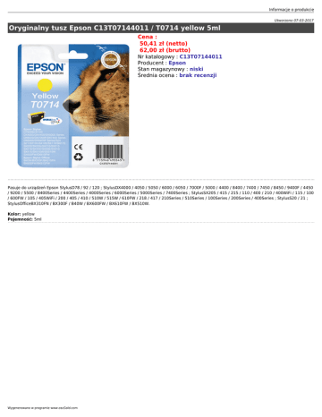 Informacje o produkcie Utworzono 07-03-2017 Oryginalny tusz Epson C13T07144011 / T0714 yellow 5ml Cena : 50,41 zł (netto) 62,00 zł (brutto) Nr katalogowy : C13T07144011 Producent : Epson Stan magazynowy : niski Średnia ocena : brak recenzji Pasuje do urządzeń Epson StylusD78 / 92 / 120 ; StylusDX4000 / 4050 / 5050 / 6000 / 6050 / 7000F / 5000 / 4400 / 8400 / 7400 / 7450 / 8450 / 9400F / 4450 / 9200 / 5500 / 8400Series / 4400Series / 4000Series / 6000Series / 5000Series / 7400Series ; StylusSX205 / 415 / 215 / 110 / 400 / 210 / 400WiFi / 115 / 100 / 600FW / 105 / 405WiFi / 200 / 405 / 410 / 510W / 515W / 610FW / 218 / 417 / 210Series / 510Series / 100Series / 200Series / 400Series ; StylusS20 / 21 ; StylusOfficeBX310FN / BX300F / B40W / BX600FW / BX610FW / BX510W. Kolor: yellow Pojemność: 5ml Wygenerowano w programie www.oscGold.com
