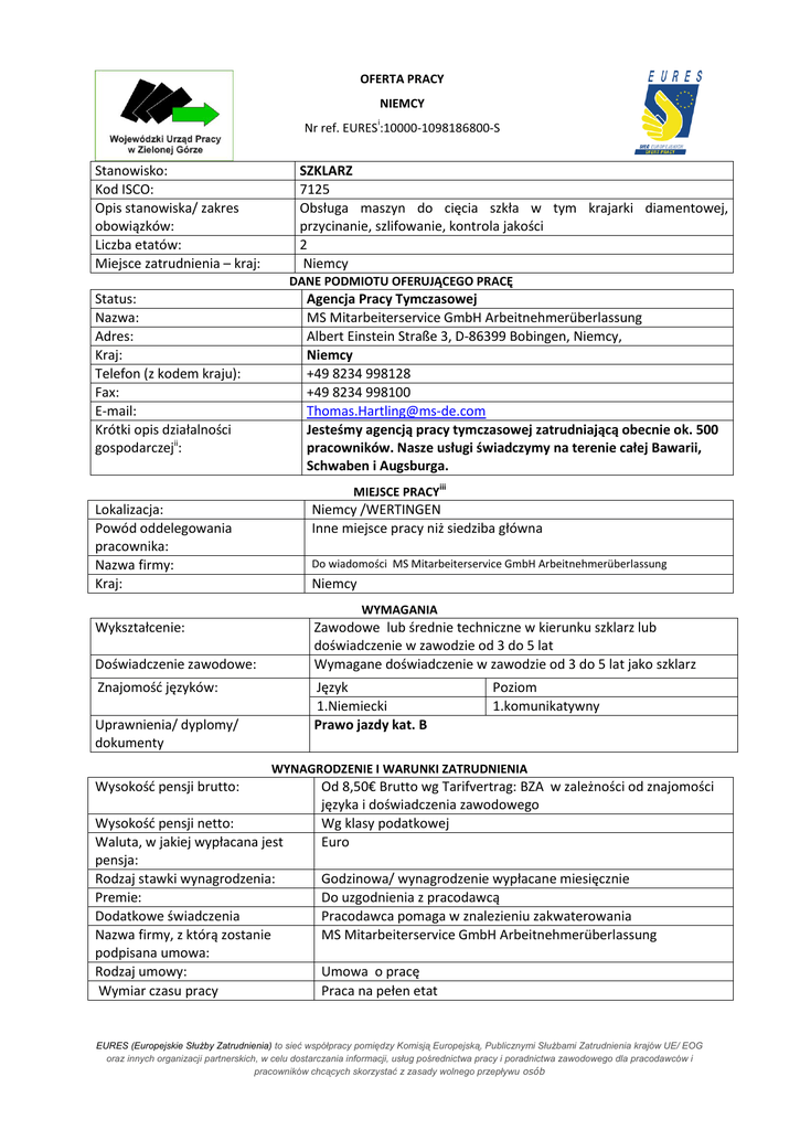 OFERTA PRACY NIEMCY i Nr ref. EURES :10000-1098186800-S Stanowisko: Kod ISCO: Opis stanowiska/ zakres obowiązków: Liczba etatów: Miejsce zatrudnienia – kraj: SZKLARZ 7125 Obsługa maszyn do cięcia szkła w tym krajarki diamentowej, przycinanie, szlifowanie, kontrola jakości 2 Niemcy DANE PODMIOTU OFERUJĄCEGO PRACĘ Status: Nazwa: Adres: Kraj: Telefon (z kodem kraju): Fax: E-mail: Krótki opis działalności gospodarczejii: Agencja Pracy Tymczasowej MS Mitarbeiterservice GmbH Arbeitnehmerüberlassung Albert Einstein Straße 3, D-86399 Bobingen, Niemcy, Niemcy +49 8234 998128 +49 8234 998100 [email protected] Jesteśmy agencją pracy tymczasowej zatrudniającą obecnie ok. 500 pracowników. Nasze usługi świadczymy na terenie całej Bawarii, Schwaben i Augsburga. MIEJSCE PRACY iii Lokalizacja: Powód oddelegowania pracownika: Nazwa firmy: Kraj: Niemcy /WERTINGEN Inne miejsce pracy niż siedziba główna Wykształcenie: Zawodowe lub średnie techniczne w kierunku szklarz lub doświadczenie w zawodzie od 3 do 5 lat Wymagane doświadczenie w zawodzie od 3 do 5 lat jako szklarz Do wiadomości MS Mitarbeiterservice GmbH Arbeitnehmerüberlassung Niemcy WYMAGANIA Doświadczenie zawodowe: Znajomość języków: Język 1.Niemiecki Prawo jazdy kat. B Uprawnienia/ dyplomy/ dokumenty Poziom 1.komunikatywny WYNAGRODZENIE I WARUNKI ZATRUDNIENIA Wysokość pensji brutto: Wysokość pensji netto: Waluta, w jakiej wypłacana jest pensja: Rodzaj stawki wynagrodzenia: Premie: Dodatkowe świadczenia Nazwa firmy, z którą zostanie podpisana umowa: Rodzaj umowy: Wymiar czasu pracy Od 8,50€ Brutto wg Tarifvertrag: BZA w zależności od znajomości języka i doświadczenia zawodowego Wg klasy podatkowej Euro Godzinowa/ wynagrodzenie wypłacane miesięcznie Do uzgodnienia z pracodawcą Pracodawca pomaga w znalezieniu zakwaterowania MS Mitarbeiterservice GmbH Arbeitnehmerüberlassung Umowa o pracę Praca na pełen etat EURES (Europejskie Służby Zatrudnienia) to sieć współpracy pomiędzy Komisją Europejską, Publicznymi Służbami Zatrudnienia krajów UE/ EOG oraz innych organizacji partnerskich, w celu dostarczania informacji, usług pośrednictwa pracy i poradnictwa zawodowego dla pracodawców i pracowników chcących skorzystać z zasady wolnego przepływu osób Czas trwania umowy: Liczba godzin tygodniowo: Zmiany i praca w dni wolne: nieokreślony 40H tygodniowo Praca na jedna zmianę Data rozpoczęcia: Jak najszybciej SPOSÓB SKŁADANIA WNIOSKU Wymagane dokumenty CV w języku niemieckim Język, w którym muszą być sporządzone przedkładane dokumenty: Do kogo należy wysłać dokumenty: niemiecki Gdzie należy wysłać dokumenty: Dane teleadresowe doradcy EURES lub przedstawiciela pracodawcy: UWAGA! Data publikacji: Do WUP Zielona Góra W tytule maila proszę uzupełnić stanowisko i numer referencyjny 10000-1098186800-S Drogą elektroniczną na adres: [email protected] Agata Bajon – [email protected] Tel.: 68 456 77 07 Wojewódzki Urząd Pracy w Zielonej Górze Ul. Wyspiańskiego 15 Zielona Góra Znajomość języka niemieckiego na poziomie umożliwiającym kontakt telefoniczny. Istnieje możliwość komunikacji z agencją przez Skype z Panem Thomas Hartling- adres skype MS Mitarbeiter Service GmbH. Uwaga! Rozmowy odbywają się tylko w języku niemieckim. WAŻNOŚĆ 26.04.2013 Termin przedkładania podań o odwołania pracę / zakończenia ważności oferty: Agencja Pracy Tymczasowej MS Mitarbeiterservice GmbH Arbeitnehmerüberlassung oświadcza, że działa zgodnie z prawem obowiązującym na terenie Niemiec. Uprzejmie informujemy, że skontaktujemy się wyłącznie z wybranymi kandydatami. UWAGA: Umowa z zagranicznym pracodawcą zostanie zawarta zgodnie z prawem kraju zatrudnienia. Oznacza to, że wszystkie roszczenia odnośnie do warunków, które obejmuje umowa, można kierować wyłącznie do odpowiedniego sądu w kraju zatrudnienia. Publiczne służby zatrudnienia (EURES) nie mogą pośredniczyć ani reprezentować pracownika w sądzie kraju zatrudnienia w przypadku sporu z pracodawcą. Publiczne służby zatrudnienia (EURES) dokładają wszelkich starań, aby zapewnić rzetelność i wiarygodność ofert pracy zgłoszonych w lokalnym urzędzie pracy. Należy wyjaśnić, że oferta pracy została zgłoszona przez stronę trzecią i EURES nie odpowiada za ewentualne rozbieżności między warunkami pracy określonymi w ofercie pracy i warunkami oferowanymi przez potencjalnego pracodawcę. Publiczne służby zatrudnienia (EURES) informują, że będą zbierać, przetwarzać i przekazywać potencjalnym pracodawcom zgodnie z przepisami dotyczącymi ochrony danych osobowych wszystkie dane osobowe dostarczone przez osoby poszukujące pracy. i Nr ref. na portalu EURES www.eures.europa.eu . Dotyczy ofert pracy publicznych służb zatrudnienia, których bazy danych ofert pracy nie są połączone z portalem EURES. ii Informacje o firmie, takie jak: status prawny, sektor, typ działalności, rodzaj produktów lub świadczonych usług, data rozpoczęcia działalności gospodarczej, liczba pracowników itp. iii Miejsce, w którym będzie wykonywana praca. Należy wypełnić w przypadku gdy: 1) miejsce wykonywania pracy jest inne niż siedziba podmiotu oferującego pracę, 2) pracę oferuje agencja pośrednictwa pracy/ agencja pracy tymczasowej. EURES (Europejskie Służby Zatrudnienia) to sieć współpracy pomiędzy Komisją Europejską, Publicznymi Służbami Zatrudnienia krajów UE/ EOG oraz innych organizacji partnerskich, w celu dostarczania informacji, usług pośrednictwa pracy i poradnictwa zawodowego dla pracodawców i pracowników chcących skorzystać z zasady wolnego przepływu osób