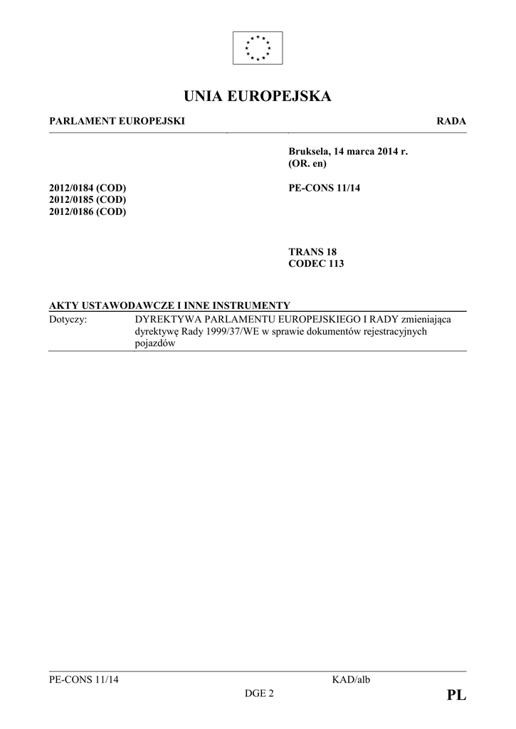 UNIA EUROPEJSKA PARLAMENT EUROPEJSKI RADA Bruksela, 14 marca 2014 r. (OR. en) PE-CONS 11/14 2012/0184 (COD) 2012/0185 (COD) 2012/0186 (COD) TRANS 18 CODEC 113 AKTY USTAWODAWCZE I INNE INSTRUMENTY Dotyczy: DYREKTYWA PARLAMENTU EUROPEJSKIEGO I RADY zmieniająca dyrektywę Rady 1999/37/WE w sprawie dokumentów rejestracyjnych pojazdów PE-CONS 11/14 KAD/alb DGE 2 PL DYREKTYWA PARLAMENTU EUROPEJSKIEGO I RADY 2014/.../UE z dnia zmieniająca dyrektywę Rady 1999/37/WE w sprawie dokumentów rejestracyjnych pojazdów PARLAMENT EUROPEJSKI I RADA UNII EUROPEJSKIEJ, uwzględniając Traktat o funkcjonowaniu Unii Europejskiej, w szczególności jego art. 91, uwzględniając wniosek Komisji Europejskiej, po przekazaniu projektu aktu ustawodawczego parlamentom narodowym, uwzględniając opinię Europejskiego Komitetu Ekonomiczno-Społecznego 1, po konsultacji z Komitetem Regionów, stanowiąc zgodnie ze zwykłą procedurą ustawodawczą 2, 1 2 Dz.U. C 44 z 15.2.2013, s. 128. Stanowisko Parlamentu Europejskiego z dnia 11 marca 2014 r. (dotychczas nieopublikowane w Dzienniku Urzędowym) oraz decyzja Rady z dnia … PE-CONS 11/14 KAD/alb DGE 2 1 PL a także mając na uwadze, co następuje: (1) Badania zdatności do ruchu drogowego stanowią część szerszego systemu zapewniającego utrzymywanie pojazdów w bezpiecznym i akceptowalnym z punktu widzenia środowiska stanie w trakcie ich użytkowania. System ten powinien przewidywać przeprowadzanie regularnych badań zdatności do ruchu drogowego pojazdów oraz drogowe kontrole techniczne pojazdów wykorzystywanych do celów komercyjnych w transporcie drogowym, a także procedury rejestracji pojazdów umożliwiające zatrzymanie dopuszczenia pojazdu do ruchu drogowego, w przypadku gdy pojazd stanowi bezpośrednie zagrożenie dla bezpieczeństwa drogowego. (2) Rejestracja pojazdu zapewnia administracyjne upoważnienie na dopuszczenie go do ruchu drogowego. Dyrektywa Rady 1999/37/WE 1 ma zastosowanie jedynie do dokonywania rejestracji pojazdów. Jednakże, w szczególności w przypadkach, gdy użytkowanie z pojazdu na drogach publicznych stanowiłoby zagrożenie ze względu na jego stan techniczny, należy umożliwić czasowe zatrzymanie dopuszczenia takiego pojazdu do ruchu. Aby zmniejszyć obciążenie administracyjne wynikające z zatrzymania, po zniesieniu zatrzymania nie należy wymagać przejścia nowego procesu rejestracji. (3) Należy wprowadzić obowiązek stałego wyrejestrowania pojazdu zgłoszonego jako pojazd wycofany z eksploatacji zgodnie z dyrektywą 2000/53/WE Parlamentu Europejskiego i Rady 2. Państwa członkowskie mają możliwość określenia w prawie krajowym innych podstaw wyrejestrowania pojazdu. 1 2 Dyrektywa Rady 1999/37/WE z dnia 29 kwietnia 1999 r. w sprawie dokumentów rejestracyjnych pojazdów (Dz.U. L 138 z 1.6.1999, s. 57). Dyrektywa 2000/53/WE Parlamentu Europejskiego i Rady z dnia 18 września 2000 r. w sprawie pojazdów wycofanych z eksploatacji (Dz.U. L 269 z 21.10.2000, s. 34). PE-CONS 11/14 KAD/alb DGE 2 2 PL (4) Nawet w przypadku gdy pojazd został wyrejestrowany, powinno być możliwe zachowanie informacji o niej w ewidencji. (5) Aby zmniejszyć obciążenie administracyjne i ułatwić wymianę informacji między państwami członkowskimi, informacje dotyczące pojazdów należy ewidencjonować elektronicznie. (6) Niniejsza dyrektywa nie powinna uniemożliwiać państwu członkowskiemu uznawania elektronicznego zbioru danych będącego w posiadaniu właściwych organów za główne źródło informacji o pojazdach zarejestrowanych na jego terytorium. W celu ułatwienia wymiany informacji państwa członkowskie powinny mieć możliwość wykorzystywania sieci elektronicznych obejmujących dane z krajowych elektronicznych baz danych. (7) W przypadkach, gdy podczas badania zdatności do ruchu drogowego wykryto niebezpieczne usterki i dopuszczenie pojazdu do ruchu na drogach publicznych zatrzymano, zatrzymanie to powinno pozostawać w ewidencji do czasu przeprowadzenia nowego badania zdatności do ruchu drogowego. PE-CONS 11/14 KAD/alb DGE 2 3 PL (8) W celu aktualizacji pkt II.4, tiret drugie i pkt III.1 sekcja A lit. b) obydwu załączników I oraz II do dyrektywy 1999/37/WE w przypadku rozszerzenia Unii, a także aktualizacji pkt II.6 załącznika I w odniesieniu do elementów nieobowiązkowych w przypadku zmian definicji lub treści świadectw zgodności w odpowiednich przepisach Unii dotyczących homologacji typu, należy przekazać Komisji uprawnienia do przyjmowania aktów zgodnie z art. 290 Traktatu o funkcjonowaniu Unii Europejskiej. Szczególnie ważne jest, aby w czasie prac przygotowawczych Komisja prowadziła stosowne konsultacje, w tym na poziomie ekspertów. Przygotowując i opracowując akty delegowane, Komisja powinna zapewnić jednoczesne, terminowe i odpowiednie przekazywanie stosownych dokumentów Parlamentowi Europejskiemu i Radzie. (9) Należy zatem odpowiednio zmienić dyrektywę 1999/37/WE, PRZYJMUJĄ NINIEJSZĄ DYREKTYWĘ: PE-CONS 11/14 KAD/alb DGE 2 4 PL Artykuł 1 Zmiany w dyrektywie 1999/73/WE W dyrektywie 1999/37/WE wprowadza się następujące zmiany: 1) w art. 1 zdanie pierwsze otrzymuje brzmienie: „Niniejsza dyrektywa ma zastosowanie do wydawanych przez państwa członkowskie dokumentów rejestracyjnych pojazdów.”; 2) w art. 2 dodaje się litery w brzmieniu: „e) »zatrzymanie« oznacza ograniczony okres, w którym pojazd nie jest dopuszczony do ruchu drogowego przez państwo członkowskie, przy czym po upływie tego okresu – pod warunkiem że powód zatrzymania wygasł – możliwe jest ponowne uzyskanie dopuszczenia pojazdu do ruchu, bez konieczności nowego procesu rejestracji; f) »wyrejestrowanie« oznacza anulowanie wydanego przez państwo członkowskie dopuszczenia pojazdu do ruchu drogowego.”; PE-CONS 11/14 KAD/alb DGE 2 5 PL 3) w art. 3 dodaje się ustępy w brzmieniu: „4. Państwa członkowskie ewidencjonują elektronicznie dane dotyczące wszystkich pojazdów zarejestro