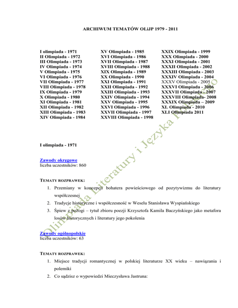 ARCHIWUM TEMATÓW OLiJP 1979 - 2011 I olimpiada - 1971 II Olimpiada - 1972 III Olimpiada - 1973 IV Olimpiada - 1974 V Olimpiada - 1975 VI Olimpiada - 1976 VII Olimpiada - 1977 VIII Olimpiada - 1978 IX Olimpiada - 1979 X Olimpiada - 1980 XI Olimpiada - 1981 XII Olimpiada - 1982 XIII Olimpiada - 1983 XIV Olimpiada - 1984 XV Olimpiada - 1985 XVI Olimpiada - 1986 XVII Olimpiada - 1987 XVIII Olimpiada - 1988 XIX Olimpiada - 1989 XX Olimpiada - 1990 XXI Olimpiada - 1991 XXII Olimpiada - 1992 XXIII Olimpiada - 1993 XXIV Olimpiada - 1994 XXV Olimpiada - 1995 XXVI Olimpiada - 1996 XXVII Olimpiada - 1997 XXVIII Olimpiada - 1998 XXIX Olimpiada - 1999 XXX Olimpiada - 2000 XXXI Olimpiada - 2001 XXXII Olimpiada - 2002 XXXIII Olimpiada - 2003 XXXIV Olimpiada - 2004 XXXV Olimpiada - 2005 XXXVI Olimpiada - 2006 XXXVII Olimpiada - 2007 XXXVIII Olimpiada- 2008 XXXIX Olimpiada – 2009 XL Olimpiada - 2010 XLI Olimpiada 2011 I olimpiada - 1971 Zawody okręgowe liczba uczestników: 860 TEMATY ROZPRAWEK: 1. Przemiany w koncepcji bohatera powieściowego od pozytywizmu do literatury współczesnej 2. Tradycje historyczne i współczesność w Weselu Stanisława Wyspiańskiego 3. Śpiew z pożogi – tytuł zbioru poezji Krzysztofa Kamila Baczyńskiego jako metafora losów historycznych i literatury jego pokolenia Zawody ogólnopolskie liczba uczestników: 63 TEMATY ROZPRAWEK: 1. Miejsce tradycji romantycznej w polskiej literaturze XX wieku – nawiązania i polemiki 2. Co sądzisz o wypowiedzi Mieczysława Jastruna: „Sztuka musi godzić ustawicznie sprzeczne żywioły: bunt przeciw zastanym formom z pewną tolerancją dla przeszłości” 3. „Język” literatury a „język” filmu – określ na przykładach środków artystycznych tych dwóch dziedzin sztuki Lub Analiza wybranego utworu: 1. Juliusz Słowacki, Bo to jest wieszcza najjaśniejsza chwała 2. Cyprian Kamil Norwid, Omyłka 3. Tadeusz Różewicz, Kto jest poetą II Olimpiada - 1972 Zawody okręgowe liczba uczestników: 769 TEMATY ROZPRAWEK: 1. Co zawdzięczam lekturze nowel Henryka Sienkiewicza i Bolesława Prusa? 2. Bohaterowie literatury współczesnej polskiej i obcej w poszukiwaniu istotnych wartości i sensu życia (na wybranych przykładach) 3. Jakie refleksje budzi w tobie strofa z wiersza Władysława Broniewskiego: Człowiek jest dobry, mądry, spokojny, pola chce orać piękne i żyzne, głodu, powietrza, ognia i wojny nie chce i w siebie wierzy: w Ojczyznę. (Grób Tamerlana) Zawody ogólnopolskie liczba uczestników: 81 TEMATY ROZPRAWEK: 1. Dokonaj interpretacji wypowiedzi Jerzego Andrzejewskiego: „Pisarz stwarza wizję życia, czytelnik morze ją przyjąć lub odrzucić, pokochać lub znienawidzić, jedna obojętność niesie książce śmierć” 2. Które powieści lat międzywojennych należałoby wznawiać ze względu na ich treść i walory artystyczne? Uzasadnij swój wybór. 3. Polska liryka współczesna wobec tradycji literackich. Lub Analiza wybranego utworu: 1. Wiktor Gomulicki, Ex libris 2. Władysław Broniewski, Moja biblioteka 3. Jarosław Iwaszkiewicz, Do czytelnika 4. Zbigniew Herbert, Poległym poetom III Olimpiada - 1973 Zawody okręgowe liczba uczestników: 891 TEMATY ROZPRAWEK: 1. Co łączy i co różni bohaterów twórczości Mickiewicza, Słowackiego i Krasińskiego? 2. Który ze znanych Ci pisarzy najlepiej realizuje Twój ideał twórcy? 3. Jakie filmu współczesne cenisz najwyżej? Uzasadnij swój wybór na przykładach. Zawody ogólnopolskie liczba uczestników: 101 TEMATY ROZPRAWEK: 1. Literacki wyraz buntowniczej postawy młodych w różnych epokach kultury polskiej. 2. Dzieło literackie jako sposób przekazywania wiedzy o psychice człowieka. 3. Jak rozumiesz słowa Juliana Przybosia, że „ nowoczesna poezja to wynalazcze laboratorium coraz sprawniejszych sposobów ekspresji językowej?. Lub Analiza wybranego utworu: 1. Adam Mickiewicz, Te rozkwitłe świeżo drzewa 2. Kazimierz Wierzyński, Ojczyzna chochołów 3. Stanisław Grochowiak, Kanon IV Olimpiada - 1974 Zawody okręgowe liczba uczestników: 1023 TEMATY ROZPRAWEK: 1. Uzasadnij historyczne znaczenie twórczości poetyckiej Jana Kochanowskiego wskaż podstawy trwałości jego dorobku w literaturze narodowej. 2. W jakich dziełach literatury współczesnej i dawnej odnajdujesz własne problemy i pytania? 3. Jakie indywidualności twórcze wśród poetów, prozaików i dramaturgów z okresu Polskiej Rzeczpospolitej :udowej i lat okupacji uważasz za najwybitniejsze? Uzasadnij swój pogląd. (Można wybrać kilku lub jednego autora) Zawody ogólnopolskie liczba uczestników: 101 TEMATY ROZPRAWEK: 1. Sytuacje i konflikty tragiczne w literaturze dawnej i współczesnej. 2. Sprawy polskie w prozie XXX-lecia. Wskazówka: Sproblematyzować na wybranych przykładach. Lub interpretacja porównawcza wybranego zestawu utworów: 1. Zbigniew Herbert, Pieśń o bębnie Cyprian Kamil Norwid, Bema pamięci żałobny – rapsod 2. Bolesław Leśmian, W polu Jan Andrzej Morsztyn, Przechadzka V Olimpiada - 1975 Zawody okręgowe liczba uczestników: 1028 TEMATY ROZPRAWEK: 1. Komedia w literaturze polskiej. Największe osiągnięcia i pełnione funkcje. 2. Jakie utwory we współczesnej prozie narracyjnej uważasz za najbardziej interesujące. Uzasadnij swój wybór. Scharakteryzuj problematykę i poetykę utworów. 3. Wybitne pisarki polskie XX wieku (proza, poezja, dramat). Scharakteryzuj twórczość jednej z nich na wybranych przykładach. Zawody ogólnopolskie liczba uczestników: 106 TEMATY ROZPRAWEK: 1. Bohater tragiczny w literaturze antycznej, romantycznej i współczesnej. 2. Trzy spojrzenia na historię: Trylogia – Popioły – Kordian i cham. Lub interpretacja porównawcza wybranego zestawu utworów: 1. Adam Mickiewicz, Gdy tu mój trup... Kazimierz Wierzyński, Ktokolwiek jesteś bez ojczyzny 2. Jan Kochanowski, Pieśń XXIV Ksiąg wtórych – „Niezwykłym i nie lada piórem...” Adam Mickiewicz, Wizyta pana Franciszka Grzymały VI Olimpiada