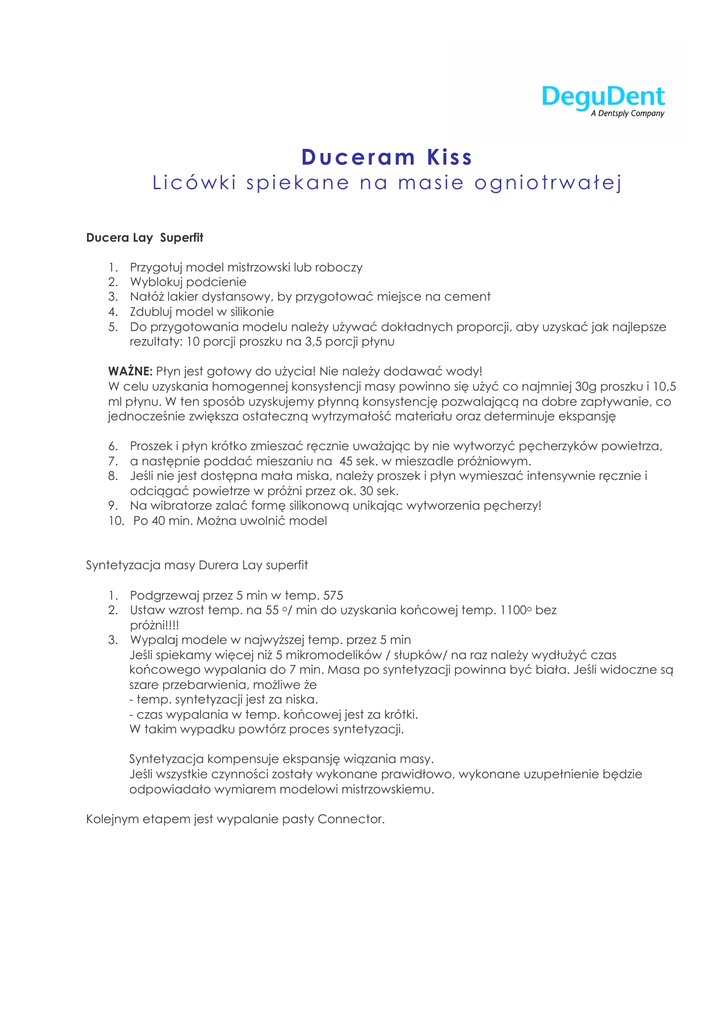 Duceram Kiss Licówki spiekane na masie ogniotrwałej Ducera Lay Superfit 1. 2. 3. 4. 5. Przygotuj model mistrzowski lub roboczy Wyblokuj podcienie Nałóż lakier dystansowy, by przygotować miejsce na cement Zdubluj model w silikonie Do przygotowania modelu należy używać dokładnych proporcji, aby uzyskać jak najlepsze rezultaty: 10 porcji proszku na 3,5 porcji płynu WAŻNE: Płyn jest gotowy do użycia! Nie należy dodawać wody! W celu uzyskania homogennej konsystencji masy powinno się użyć co najmniej 30g proszku i 10,5 ml płynu. W ten sposób uzyskujemy płynną konsystencję pozwalającą na dobre zapływanie, co jednocześnie zwiększa ostateczną wytrzymałość materiału oraz determinuje ekspansję 6. Proszek i płyn krótko zmieszać ręcznie uważając by nie wytworzyć pęcherzyków powietrza, 7. a następnie poddać mieszaniu na 45 sek. w mieszadle próżniowym. 8. Jeśli nie jest dostępna mała miska, należy proszek i płyn wymieszać intensywnie ręcznie i odciągać powietrze w próżni przez ok. 30 sek. 9. Na wibratorze zalać formę silikonową unikając wytworzenia pęcherzy! 10. Po 40 min. Można uwolnić model Syntetyzacja masy Durera Lay superfit 1. Podgrzewaj przez 5 min w temp. 575 2. Ustaw wzrost temp. na 55 o/ min do uzyskania końcowej temp. 1100o bez próżni!!!! 3. Wypalaj modele w najwyższej temp. przez 5 min Jeśli spiekamy więcej niż 5 mikromodelików / słupków/ na raz należy wydłużyć czas końcowego wypalania do 7 min. Masa po syntetyzacji powinna być biała. Jeśli widoczne są szare przebarwienia, możliwe że - temp. syntetyzacji jest za niska. - czas wypalania w temp. końcowej jest za krótki. W takim wypadku powtórz proces syntetyzacji. Syntetyzacja kompensuje ekspansję wiązania masy. Jeśli wszystkie czynności zostały wykonane prawidłowo, wykonane uzupełnienie będzie odpowiadało wymiarem modelowi mistrzowskiemu. Kolejnym etapem jest wypalanie pasty Connector. Program wypalania masy Ducera Lay Temperatura wstępna Suszenie Wygrzewanie Przyrost o /min Temp. Końcowa Wypalanie 570oC 3 min 2 min 55oC 1100o C 5 min bez próżni (przetrzymywanie w temp. końcowej) Uwaga!: jeśli jednorazowo jest więcej niż 5 słupków, należy wydłużyć przetrzymywanie do 7 min. Program wypalania - Connector Paste Temperatura wstępna Suszenie Podgrzewanie Przyrost o /min Włącz próżnię Wyłącz próżnię Wartość próżni Temp. końcowa Wypalanie 620oC 1 min 3 min 55oC/min 620oC 970oC 50 hPa 970oC 1 min (przetrzymywanie w temp. końcowej) Wypalając Duceram Kiss należy podwyższyć temperatury końcowe o 30oC a przyrost do min 99oC/min (optymalnie do 120oC). Zalecamy przyrost temp. na min. - przy wszystkich paleniach 130 o/min!!! Najlepiej syntetyzować słupki natychmiast po uwolnieniu z silikonu, co przeciwdziała powstawaniu cieniutkiej pudrowej warstwy, która może (nie musi) wpłynąć niekorzystnie na efekt końcowy. Producent: DeguDent GmbH Rodenbacher Chaussee 4 63457 Hanau Wolfgang Informacje: DeguDent Tel. 022 825 72 08 [email protected] www.degudent.pl www.degudent.de www.degudent.com