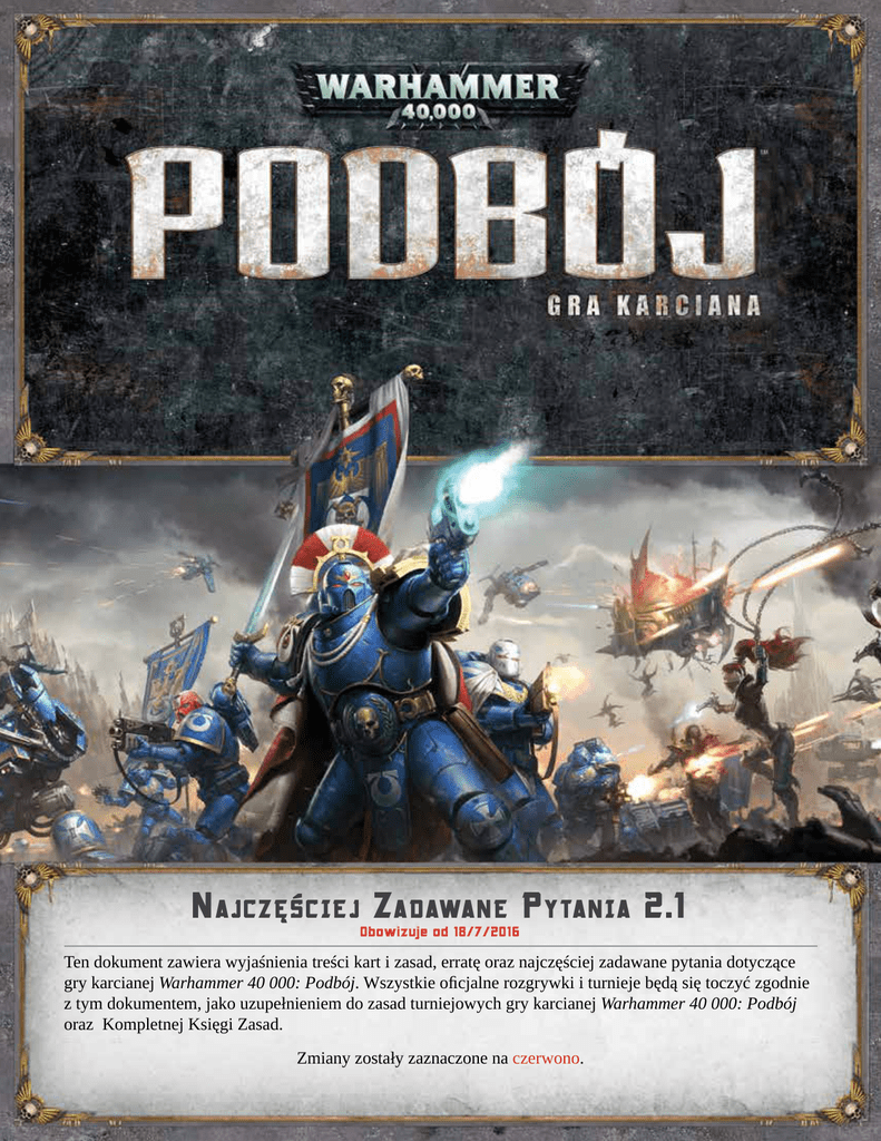 Najczęściej Zadawane Pytania 2.1 Obowizuje od 18/7/2016 Ten dokument zawiera wyjaśnienia treści kart i zasad, erratę oraz najczęściej zadawane pytania dotyczące gry karcianej Warhammer 40 000: Podbój. Wszystkie oficjalne rozgrywki i turnieje będą się toczyć zgodnie z tym dokumentem, jako uzupełnieniem do zasad turniejowych gry karcianej Warhammer 40 000: Podbój oraz Kompletnej Księgi Zasad. Zmiany zostały zaznaczone na czerwono. E rrata Z asad W yjaśnienie Z asad Kompletna Księga Zasad 1. Dobieranie, Ujawnianie, Wyszukiwanie Sekcja 3.2.10 (p. 26) (1.1) Dobieranie wielu kart Pierwsze zdanie powinno brzmieć: „Jeśli na początku tury walki gracz kontroluje co najmniej jedną przygotowaną jednostkę w bitwie…” Kiedy gracz dobiera wiele kart (np. dobiera dwie karty podczas fazy sztabu), dobiera je jednocześnie. Jest to ważne dla efektów, które mogą aktywować się przez dobieranie kart. E rrata K art Jeżeli obaj gracze muszą dobrać wszystkie karty pozostałe w talii w tym samym czasie, gra kończy się remisem, nawet jeżeli jeden z graczy posiada mniej kart pozostałych w talii. Szlachetny Czyn (CL008) Treść powinna brzmieć: „Akcja: Poświęć jednostkę [AM], aby zadać obrażenia równe jej wydrukowanej wartości ATK wskazanej wrogiej jednostce armii na tej samej planecie.” (1.2) Podczas „Ujawnienia” Kiedykolwiek karta zostaje ujawniona, pozostaje ona jawna, aż do momentu, w którym nie trafi ona do ostatecznego miejsca sprecyzowanego przez efekt, który spowodował, że została odkryta, albo aż do momentu, w którym efekt karty zostanie całkowicie rozpatrzony. Cuchnąca Mgła (CL027) Treść powinna brzmieć: „Akcja Walki: Usuń wszystkie obrażenia ze wskazanej kontrolowanej przez ciebie jednostki Nurgle. Następnie zmuś swojego przeciwnika do zadania niebezpośrednich obrażeń, w liczbie równej liczbie usuniętych obrażeń, kontrolowanym przez niego jednostkom armii na tej samej planecie.” (1.3) Wynik Wyszukiwania Podczas rozpatrzenia efektu, który wyszukuje karty w talii, lub w jego części, gracz nie jest zobowiązany do znalezienia obiektu wyszukiwania. Chimera Stalowego Legionu (CL075) Treść powinna brzmieć: „Reakcja: Po tym, jak kontrolowanej przez ciebie jednostce nie-Pojazdu na tej planecie zostaną przypisane obrażenia z ataku, zapobiegnij 1 z tych obrażeń.” 2. Rozgrywka (2.1) Nieskończone pętle Może się tak zdarzyć, że przy pomocy określonej kombinacji kart gracz stworzy „nieskończoną pętlę”. Podczas rozgrywania nieskończonej pętli gracz musi postępować zgodnie z dwoma poniższymi krokami: Uświęcone Librarium (CL123) Treść powinna brzmieć: „Akcja: Wyczerp to wsparcie, aby zmusić wskazaną jednostkę na planecie bez wrogiego lidera do otrzymania -2 ATK do końca fazy.” 1. Musi w wyraźny sposób wskazać przeciwnikowi nieskończoną pętlę (i sędziemu turniejowemu, jeśli przeciwnik sobie tego zażyczy). W tym celu musi zaprezentować, przy pomocy wszystkich odpowiednich kart, jeden cykl nieskończonej pętli. Weteran Barbrus (WP050) Treść powinna brzmieć: Straż Śmierci (zamiast Gwardia Śmierci) Pomiot Genokradów Treść powinna brzmieć: „Reakcja: Po tym, jak wystawisz tę jednostkę, wyszukaj w 6 wierzchnich kartach swojej talii kartę z cechą Genokrad. Ujawnij ją, dodaj do swojej ręki, a pozostałe karty odłóż na spód swojej talii w dowolnej kolejności.” 2. Musi wskazać, ile razy chce skorzystać z tej pętli. Na przykład może powiedzieć „teraz korzystam z tej pętli siedemnaście milionów razy”. Następnie natychmiast rozgrywa pętlę wskazaną liczbę razy. Jeśli jej rozegranie sprawi, ze gracz osiąga zwycięstwo, gra się kończy, a gracz wygrywa. Nieskończone pętle nigdy nie powinny być wykorzystywane do spowolnienia gry. 1 (2.2) Własność kart „poza grą” Kiedy efekt jest anulowany, kroki 1-5 z procesu Inicjowanie zdolności/Wystawianie kart (Kompletna Księga Zasad, s.4) są wciąż podejmowane. Jedyna część, która jest zablokowana, to krok 6 – rozpatrywanie efektu. To oznacza, że wszystkie koszty są wciąż płacone, niezależnie od anulacji. Karta zawsze musi być umieszczona w wyznaczonym obszarze poza grą jej właściciela. Jeżeli karta należąca do jednego gracza miałaby być kiedykolwiek umieszczona w obszarze „poza grą” przeciwnika, jest umieszczana w odpowiednim obszarze jej właściciela (ręką, talia lub stos kart odrzuconych). Pozostałe zdolności nie mogą wpływać na to, w którym obszarze poza grą karta jest umieszczana. (3.2) Stos kart odrzuconych (2.4) Koszty Nie można zmieniać kolejności kart w żadnym ze stosów kart odrzuconych. Każdy ze stosów kart odrzuconych można przeglądać w dowolnym momencie. Jeżeli wiele kart jednocześnie miałoby trafić na stos kart odrzuconych, właściciel tych kart decyduje, w jakiej kolejności będą one umieszczone. Jeżeli jakakolwiek część zapłacenia kosztów jest niemożliwa, wszystkie koszty, które mogą zostać zapłacone, zostają zapłacone, a proces inicjowania zdolności lub wystawiania/zagrywania karty zostaje natychmiast zakończony bez dalszych rozwiązań. (Karty pozostają niezagrane na ręce właściciela). (3.3) Poruszanie i przydzielanie Kiedy jednostka jest przydzielana do planety, jest ona poruszana do tej planety. Jednak jednostka, która jest poruszana na planetę, nie jest przydzielana do tej planety. (2.5) Zwycięskie ustawienie Rozbicie, odwrót oraz wystawianie nie jest rozpatrywane jako poruszanie. (2.3) Liderzy na końcu Fazy Bitwy W ostatnim kroku, przed zakończeniem fazy bitwy, jeżeli lider jest jeszcze na planecie z jakiegokolwiek powodu, wraca do sztabu, zachowując swój stan. Karty w zwycięskim ustawieniu gracza nie mogą opuścić tego ustawienia. (3.4) Zdolności kart wydarzeń Zdolności kart wydarzeń z natury są wykorzystywane z obszaru poza grą i są inicjowane, kiedy karta wydarzeń jest zagrywana z r