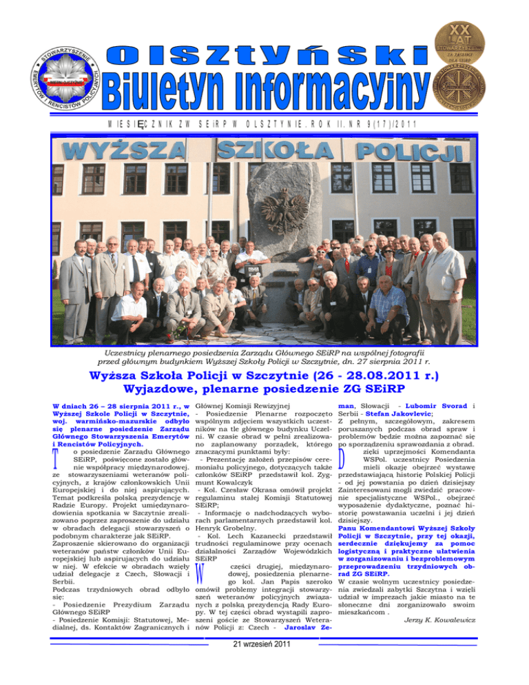 MIESI CZNIK ZW SEiRP W OLSZTYNIE. ROK II. NR 9(17)/2011 Uczestnicy plenarnego posiedzenia Zarz du G ównego SEiRP na wspólnej fotografii przed g ównym budynkiem Wy szej Szko y Policji w Szczytnie, dn. 27 sierpnia 2011 r. Wy sza Szko a Policji w Szczytnie (26 - 28.08.2011 r.) Wyjazdowe, plenarne posiedzenie ZG SEiRP W dniach 26 – 28 sierpnia 2011 r., w Wy szej Szkole Policji w Szczytnie, woj. warmi sko-mazurskie odby o si plenarne posiedzenie Zarz du ównego Stowarzyszenia Emerytów i Rencistów Policyjnych. o posiedzenie Zarz du G ównego SEiRP, po wi cone zosta o g ównie wspó pracy mi dzynarodowej. ze stowarzyszeniami weteranów policyjnych, z krajów cz onkowskich Unii Europejskiej i do niej aspiruj cych. Temat podkre la polsk prezydencj w Radzie Europy. Projekt umi dzynarodowienia spotkania w Szczytnie zrealizowano poprzez zaproszenie do udzia u w obradach delegacji stowarzysze o podobnym charakterze jak SEiRP. Zaproszenie skierowano do organizacji weteranów pa stw cz onków Unii Europejskiej lub aspiruj cych do udzia u w niej. W efekcie w obradach wzi y udzia delegacje z Czech, S owacji i Serbii. Podczas trzydniowych obrad odby o si : - Posiedzenie Prezydium Zarz du ównego SEiRP - Posiedzenie Komisji: Statutowej, Medialnej, ds. Kontaktów Zagranicznych i T ównej Komisji Rewizyjnej - Posiedzenie Plenarne rozpocz to wspólnym zdj ciem wszystkich uczestników na tle g ównego budynku Uczelni. W czasie obrad w pe ni zrealizowano zaplanowany porz dek, którego znacz cymi punktami by y: - Prezentacj za przepisów ceremonia u policyjnego, dotycz cych tak e cz onków SEiRP przedstawi kol. Zygmunt Kowalczyk - Kol. Czes aw Okrasa omówi projekt regulaminu sta ej Komisji Statutowej SEiRP; - Informacj o nadchodz cych wyborach parlamentarnych przedstawi kol. Henryk Grobelny. - Kol. Lech Kazanecki przedstawi trudno ci regulaminowe przy ocenach dzia alno ci Zarz dów Wojewódzkich SEiRP cz ci drugiej, mi dzynarodowej, posiedzenia plenarnego kol. Jan Papis szeroko omówi problemy integracji stowarzysze weteranów policyjnych zwi zanych z polsk prezydencj Rady Europy. W tej cz ci obrad wyst pili zaproszeni go cie ze Stowarzysze Weteranów Policji z: Czech - Jaroslav Ze- W 21 wrzesie 2011 man, S owacji - Lubomir Svorad i Serbii - Stefan Jakovlevic; Z pe nym, szczegó owym, zakresem poruszanych podczas obrad spraw i problemów b dzie mo na zapozna si po sporz dzeniu sprawozdania z obrad. zi ki uprzejmo ci Komendanta WSPol. uczestnicy Posiedzenia mieli okazj obejrze wystaw przedstawiaj histori Polskiej Policji - od jej powstania po dzie dzisiejszy Zainteresowani mogli zwiedzi pracownie specjalistyczne WSPol., obejrze wyposa enie dydaktyczne, pozna histori powstawania uczelni i jej dzie dzisiejszy. Panu Komendantowi Wy szej Szko y Policji w Szczytnie, przy tej okazji, serdecznie dzi kujemy za pomoc logistyczn i praktyczne u atwienia w zorganizowaniu i bezproblemowym przeprowadzeniu trzydniowych obrad ZG SEiRP. W czasie wolnym uczestnicy posiedzenia zwiedzali zabytki Szczytna i wzi li udzia w imprezach jakie miasto na te oneczne dni zorganizowa o swoim mieszka com . Jerzy K. Kowalewicz D 2 Olszty ski Biuletyn Informacyjny nr 9(17) Podczas szczególnie uroczystej cz ci posiedzenia prezes Zarz du G ównego Henryk Borowi ski odznaczy krzy em „Za wybitne osi gni cia dla SEiRP” (na foto od lewej): pana inspektora Jana Chojnowskiego, Kanclerza WSPol w Szczytnie; pani podinspektor El biet Sadowsk -Naczelnik Wydzia u ywno ciowego WSPol. w Szczytnie; kol. Jerzego K. Kowalewicza - prezesa ZW SEiRP w Olsztynie; kol. Bohdana Makowskiego - prezesa Ko a SEiRP w Gi ycku; kol. Boles awa winarowicza - prezesa Ko a SEiRP w W gorzewie; kol. Jana Dominika - prezesa Ko a SEiRP przy KPP w Szczytnie; kol. Lucjana Fiedorowicza - prezesa Ko a SEiRP w Lidzbarku Warm. Po prawej stronie foto. prezes ZW SEiRP w Zielonej Górze Jan Papis - moderator posiedzenia. W imieniu odznaczonych podzi kowa za uznanie insp. Jan Chojnowski. Migawki z sali obrad i spoza niej. 21 wrzesie 2011 Olszty ski Biuletyn Informacyjny nr 9(17) Tutaj spali my i tutaj nas karmiono 21 wrzesie 2011 3 4 Olszty ski Biuletyn Informacyjny nr 9(17) Cz mi dzynarodow posiedzenia prowadzi Jan Papis, którego interesuj ce wyst pienie publikujemy poni ej. Za sto em prezydialnym zasiedli: Wice przewodnicz cy NSZZ Policjantów Tomasz Krzemi ski, szef delegacji Czech Jaroslav Zeman; Jan Papis; prezes ZG Henryk Borowi ski, delegat ze S owacji Lubomir Svarod; przedstawiciel weteranów Serbii - Stefan Jakovlevic. Poni ej publikujemy tekst wyst pienia kol. Jana Papisa przygotowanego na t okazj . Integracja organizacji i stowarzysze emerytów policyjnych w Europie. W trakcie przygotowa do dzisiejszego posiedzenia, temat wiod cy formu owano ró nie. Przytocz tylko te z pierwszego etapu przygotowa . W zwi zku z Prezydencj Polski w Radzie Unii Europejskiej Stowarzyszenie Emerytów i Rencistów Policyjnych zamierza odby posiedzenie Zarz du G ównego, po wi cone tematyce wspó pracy mi dzynarodowej organizacji pokrewnych ze szczególnym uwzgl dnieniem zbli enia wspó pracy ze wschodem Europy. Temat posiedzenia doprecyzowano i zapisano e b dzie to; „Wymiana do wiadcze na temat integracji organizacji i stowarzysze emerytów policyjnych i milicyjnych w Europie ”. W za eniach organizacyjnych temat zosta zapisany – „ Wspó praca mi dzynarodowa stowarzysze weteranów policyjnych w zwi zku z Prezydencj Polski w Radzie Europy ”. Optymistycznie zak adali my, e tematyka ta zainteresuje organizacje pokrewne pa stw s siaduj cych i na spotkanie przyb delegacje: Bia orusi, Czech, Estonii, Litwy, otwy, Mo dawii, Rosji, Serbii, S owacji, Ukrainy i W gier Okaza o si , e ten optymizm by nieco na wyrost. Nie zmienia to jednak naszego pozytywnego nastawienia do pog biania wspó pracy z wszystkimi zagranicznymi organizacjami pokrewnymi którym idea wspó pracy mi dzynarodowej jest bliska. Wybór tematu dzisiejszego spotkania uzasadnili my Prezydencj Polski w Radzie Unii Europejskiej: