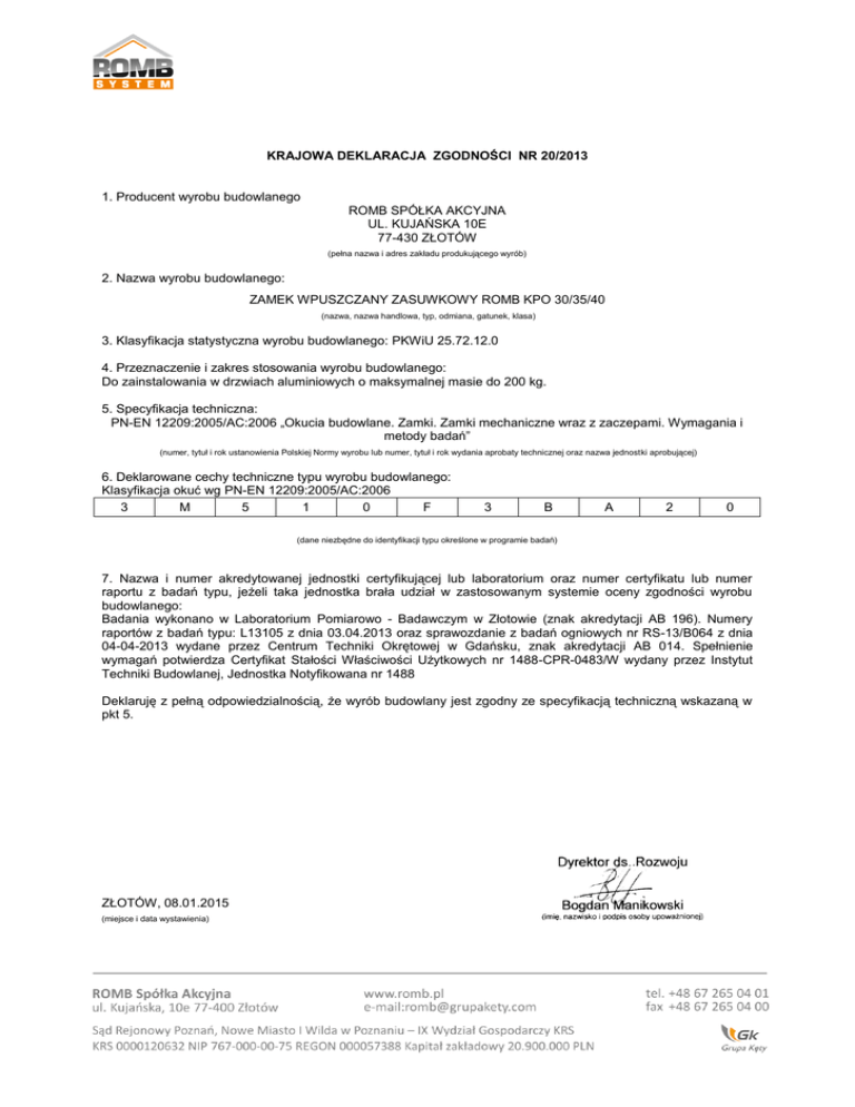 KRAJOWA DEKLARACJA ZGODNOŚCI NR 20/2013 1. Producent wyrobu budowlanego ROMB SPÓŁKA AKCYJNA UL. KUJAŃSKA 10E 77-430 ZŁOTÓW (pełna nazwa i adres zakładu produkującego wyrób) 2. Nazwa wyrobu budowlanego: ZAMEK WPUSZCZANY ZASUWKOWY ROMB KPO 30/35/40 (nazwa, nazwa handlowa, typ, odmiana, gatunek, klasa) 3. Klasyfikacja statystyczna wyrobu budowlanego: PKWiU 25.72.12.0 4. Przeznaczenie i zakres stosowania wyrobu budowlanego: Do zainstalowania w drzwiach aluminiowych o maksymalnej masie do 200 kg. 5. Specyfikacja techniczna: PN-EN 12209:2005/AC:2006 „Okucia budowlane. Zamki. Zamki mechaniczne wraz z zaczepami. Wymagania i metody badań” (numer, tytuł i rok ustanowienia Polskiej Normy wyrobu lub numer, tytuł i rok wydania aprobaty technicznej oraz nazwa jednostki aprobującej) 6. Deklarowane cechy techniczne typu wyrobu budowlanego: Klasyfikacja okuć wg PN-EN 12209:2005/AC:2006 3 M 5 1 0 F 3 B A 2 0 (dane niezbędne do identyfikacji typu określone w programie badań) 7. Nazwa i numer akredytowanej jednostki certyfikującej lub laboratorium oraz numer certyfikatu lub numer raportu z badań typu, jeżeli taka jednostka brała udział w zastosowanym systemie oceny zgodności wyrobu budowlanego: Badania wykonano w Laboratorium Pomiarowo - Badawczym w Złotowie (znak akredytacji AB 196). Numery raportów z badań typu: L13105 z dnia 03.04.2013 oraz sprawozdanie z badań ogniowych nr RS-13/B064 z dnia 04-04-2013 wydane przez Centrum Techniki Okrętowej w Gdańsku, znak akredytacji AB 014. Spełnienie wymagań potwierdza Certyfikat Stałości Właściwości Użytkowych nr 1488-CPR-0483/W wydany przez Instytut Techniki Budowlanej, Jednostka Notyfikowana nr 1488 Deklaruję z pełną odpowiedzialnością, że wyrób budowlany jest zgodny ze specyfikacją techniczną wskazaną w pkt 5. ZŁOTÓW, 08.01.2015 (miejsce i data wystawienia)