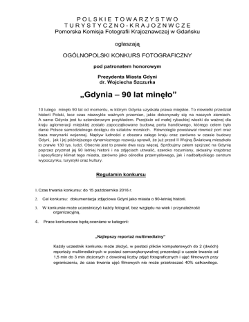 POLSKIE TOWARZYSTWO TURYSTYCZNO-KRAJOZNWCZE Pomorska Komisja Fotografii Krajoznawczej w Gdańsku ogłaszają OGÓLNOPOLSKI KONKURS FOTOGRAFICZNY pod patronatem honorowym Prezydenta Miasta Gdyni dr. Wojciecha Szczurka „Gdynia – 90 lat minęło” 10 lutego minęło 90 lat od momentu, w którym Gdynia uzyskała prawa miejskie. To niewielki przedział historii Polski, lecz czas niezwykle ważnych przemian, jakie dokonywały się na naszych ziemiach. A sama Gdynia jest tu sztandarowym przykładem. Przejście od małej rybackiej wioski do ważnej dla kraju aglomeracji miejskiej zostało zapoczątkowane budową portu handlowego, którego celem było danie Polsce samodzielnego dostępu do szlaków morskich. Równolegle powstawał również port oraz baza marynarki wojennej. Napływ ludności z obszaru całego kraju oraz zarówno w czasie budowy Gdyni, jak i jej późniejszego dynamicznego rozwoju sprawił, że już przed II Wojną Światową mieszkało to prawie 130 tys. ludzi. Obecnie jest to prawie dwa razy więcej. Spróbujmy zatem spojrzeć na Gdynię poprzez pryzmat jej 90 letniej historii i na zdjęciach utrwalić, szeroko rozumiany, aktualny krajobraz i specyficzny klimat tego miasta, zarówno jako ośrodka przemysłowego, jak i nadbałtyckiego centrum wypoczynku, turystyki oraz kultury. Regulamin konkursu 1. Czas trwania konkursu: do 15 października 2016 r. 2. Cel konkursu: dokumentacja zdjęciowa Gdyni jako miasta o 90-letniej historii. 3. W konkursie może uczestniczyć każdy fotograf, bez względu na wiek i przynależność organizacyjną. 4. Prace konkursowe będą oceniane w kategorii: „Najlepszy reportaż multimedialny” Każdy uczestnik konkursu może złożyć, w postaci plików komputerowych do 2 (dwóch) reportaży multimedialnych w postaci samowykonywalnej prezentacji o czasie trwania od 1,5 min do 3 min złożonych z dowolnej liczby zdjęć fotograficznych i ujęć filmowych przy ograniczeniu, że czas trwania ujęć filmowych nie może przekraczać 40% całkowitego. 5. -2Pliki dostarczone jako prace konkursowe muszą być oznaczone zgodnie z poniższym schematem (nazwa pliku):”: NRM_godło_kolejny_numer.xxx gdzie: NRM – kod kategorii ” Najlepszy reportaż multimedialny” godło – unikalna nazwa złożona wyłącznie z cyfr oraz liter (bez polskich znaków) o maksymalnej długości 8 znaków kolejny_ numer – oznaczenie kolejną cyfrą (od 1 do 2) kolejnego reportażu w zestawie danego autora xxx – rozszerzenie pliku Przykłady: NRM_moja_gdynia_1.avi / .wmv / .mjpg / .mov / .mp4 / .mpg2 / .mpg4 / …….. NRM_moja_gdynia_2.ppt / .pps / ………… Uwaga: Reportaż multimedialny biorący udział w konkursie w kategorii „Najlepszy reportaż multimedialny” musi być zapisany w pojedynczym pliku i mieć formę prezentacji z opcją automatycznego przełączania obrazów (np. opartej na wykorzystaniu programu Microsoft Power Point lub powszechnie dostępnych jego odpowiedników) lub klipu filmowego w jakości, co najmniej, DVD Maksymalna rozdzielczość plików zawierających materiał filmowy 1920x1080 /25p przy maksymalnej przepływności 24Mb/s. 6. Zgłoszenie do konkursu w kategorii „Najlepszy reportaż multimedialny” materiału prezentacyjnego, którego autor w celu udźwiękowienia wykorzystuje utwory innych twórców jest traktowane przez organizatorów konkursu jako potwierdzenie posiadania przez autora fotoreportażu prawa do wykorzystania cytowanego utworu muzycznego w przypadku publicznej prezentacji reportażu. 7. Pliki z reportażami należy przesłać pocztą elektroniczną do dnia 15 października 2016r. na adres: [email protected] . W tym samym terminie w oddzielnej przesyłce, należy przesłać w postaci pliku PDF skan wydrukowanego, wypełnionego i podpisanego formularza zgłoszeniowego. Szablon formularza zgłoszeniowego w kategorii „Najlepszy reportaż multimedialny” stanowi załącznik nr 1 do niniejszego regulaminu. 8. Wyniki konkursu zostaną ogłoszone w terminie do 15 listopada 2016 r. na stronie internetowej PTTK : www.gdynia.pttk.pl oraz www.pttk-gdansk.pl 9. Organizatorzy przewidują następujące nagrody: • nagrody za zajęcie pierwszych trzech miejsc w każdej z ww. kategorii • wyróżnienia za zajęcie miejsca od czwartego do szóstego w każdej z ww. kategorii 10. Kwalifikacji do kategorii oraz przyznania nagród i wyróżnień dokonuje Jury, złożone ze znanych fotografów i instruktorów krajoznawstwa. Jego skład zostanie przedstawiony na www.pttk-gdansk.pl do dnia 31 maja 2016r. stronach www.gdynia.pttk.pl oraz Organizatorzy dopuszczają zmiany w składzie Jury w trakcie trwania konkursu. O ewentualnych zmianach w składzie Jury uczestnicy zostaną odpowiednim komunikatem zamieszczonym na ww. stronach internetowych. Wyniki konkursu ogłoszone i protokolarnie potwierdzone przez jury są ostateczne. -3- 11. Jury konkursu prawo nie przyjąć do konkursowej oceny zdjęcia i reportaże, które nie będą spełniać wymogów tematycznych dla poszczególnych kategorii konkursu oraz ogólnie przyjętych warunków poprawności technicznej lub które będą zawierać istotne błędy merytoryczne uniemożliwiające ich publiczną prezentację. 12. Nagrodzone prace będą eksponowane na wystawach, których lokalizacje oraz terminy zostaną odpowiednio wcześniej przedstawione na stronach www.gdynia.pttk.pl oraz www.pttk-gdansk.pl 13. Uczestnik konkursu zgłaszając swoje prace wyraża zgodę na bezpłatne zamieszczanie jego prac na stronach internetowych PTTK i wydawnictwach PTTK oraz kronice Pomorskiej KFK. Wszystkie prace zgłoszone po konkursie przechodzą na własność organizatora i będą włączone do zbiorów Pomorskiej KFK . 14. Udział w konkursie nie ogranicza praw Uczestnika w komercyjnym wykorzystaniu przez niego swoich prac. 15. Informacji dotyczących konkursu udziela członkowie Komitetu organizacyjnego: lub telefon 501 446 410 - sprawy organizacyjne: e-mail: [email protected] lub telefon 797 124 058 