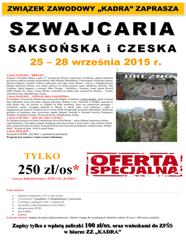 ZWIĄZEK ZAWODOWY „KADRA” ZAPRASZA SZWAJCARIA SAKSOŃSKA i CZESKA 25 – 28 września 2015 r. 1 dzień 25.09.2015 - DREZNO Wyjazd z Jastrzębia Zdroju o godz. 500, przejazd do Drezna, rozpoczęcie zwiedzania, objazd autokarem po mieście, podczas którego przejeżdżamy obok Szklanej Manufaktury Volkswagena, Wielkiego Ogrodu, Muzeum Higieny, dzielnice willowe, pałacyków nad Łabą, Nowe Miasto z wizytą w Najpiękniejszym Sklepie Mlecznym Świata, czas wolny, przerwa na obiad, przejście przez zabytkową starówkę, Plac Teatralny, Opera Sempera z zewnątrz, Pałac Zwinger – dziedzińce i fontanny, rynek miasta, Kościół NMP, Katedra Św Trójcy, Tarasy Bruhla z panorama na dolinę Łaby, przejazd do Hreńska – Czechy, zakwaterowanie, obiadokolacja, nocleg. 2 dzień 26.09.2015 - SZWAJCARIA SAKSOŃSKA Po śniadaniu, przejazd do zabytkowego miasteczka Stolpen, zwiedzanie Zamku Stolpen, gdzie więziona była najbardziej znana faworytka Augusta Mocnego, Hrabina Cosel. Zameczek w Stolpen zasłynął nie tylko dzięki niej, ale również ze względu na skałę bazaltową, która jest narodowym geotypem – zwiedzanie zamku. Następnie przejazd na Basztę w zakolu Łaby, czyli najstarszy i jeden z najpiękniejszych punktów widokowych na terenie Parku Narodowego Szwajcarii Saksońskiej. Możliwość przejścia na kamienny most zawieszony między skałami. Przejazd w kierunku twierdzy Konigstein. Wspólne zwiedzanie twierdzy. Powrót do hotelu, obiadokolacja, nocleg. 3 dzień 27.09.2015 - SZWAJCARIA CZESKA Po śniadaniu przejście do Parku Narodowego Praveickiej Bramy – spływ łódkami malowniczą doliną rzeki Kamienicy. Ten piękny zakątek, skomponowany przez naturę z wody, lasów i skał, obejrzeć można tylko, przemieszczając się łodzią. Przejazd do Rezerwatu Przyrody pochodzenia wulkanicznego „Pańska Skała” Wyjazd ok godz. 18.00 w stronę Polski 4 dzień 28.09.2015 Przyjazd na KWK „Jas-Mos” w godzinach porannych. Program jest ramowy i może zostać zmieniony. TYLKO 250 zł/os* * cena po dofinansowaniu z ZFŚS i ZZ „KADRA” Cena zawiera: transport autokarem LUX w obie strony wyżywienie: 2 śniadania i 2 obiadokolacje (1 uroczysta) 2 noclegi w pokojach 2 lub 3 osobowych rejs łodzią, rzeką Kamienicą Cichy Parów ubezpieczenie NNW, przewodnik podatek Cena nie zawiera: dopłaty do pokoi jednoosobowych, biletów wstępu do zwiedzanych obiektów (około 30 euro i 100 koron czeskich) Z Zaappiissyy ttyyllkkoo zz w wppłłaattąą zzaalliicczzkkii 100 zł/os.. oorraazz w wnniioosskkaam mii ddoo Z ZF FŚŚSS w w bbiiuurrzzee Z ZZ Z „„K KA AD DR RA A””