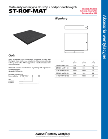 Mata antywibracyjna do stóp i podpor dachowych ST-ROF-MAT Pobierz Wentyle Pobierz AlnorCAM Zamawiaj w B2B Akcesoria wentylacyjne B g Wymiary A Opis Maty antywibracyjne ST-ROF-MAT stosowane są jako podkład pod stopy dachowe, urządzenia. Skutecznie redukują wibracje oraz hałas. Chronią podłoże przed uszkodzeniami mechanicznymi. Materiał: kauczuk butadienowo-styrenowy SBR odporny na działanie wilgoci Gęstość: 500kg/m3 Przykład oznaczenia Kod produktu: ST-ROF-MAT - 2 - 50 kod A [mm] B [mm] g [mm] ST-ROF-MAT-1-33 330 330 10 ST-ROF-MAT-1-50 500 500 10 ST-ROF-MAT-1-100 1000 1000 10 ST-ROF-MAT-2-50 500 500 20 ST-ROF-MAT-2-100 1000 1000 20 typ grubość wymiar http://www.alnor.com.pl/index/produkty-pl/akcesoria-wentylacyjne/ ALNOR® systemy wentylacji jest prawnie chronionym znakiem i technicznym patentem. Prawo do zmian zastrzeżone.
