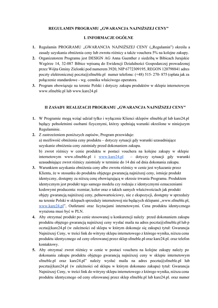REGULAMIN PROGRAMU „GWARANCJA NAJNIŻSZEJ CENY” I. INFORMACJE OGÓLNE 1. Regulamin PROGRAMU „GWARANCJA NAJNIŻSZEJ CENY („Regulamin”) określa a zasady uzyskania obniżenia ceny lub zwrotu różnicy a także vouchera 5% na kolejne zakupy. 2. Organizatorem Programu jest DESIGN AG Anna Guenther z siedzibą w Bibicach Jurajskie Wzgórze 14, 32087 Bibice wpisaną do Ewidencji Działalności Gospodarczej prowadzonej przez Wójta Gminy Zielonki pod numerem 3920, NIP 6772309195, REGON 120798841 adres poczty elektronicznej [email protected] numer telefonu: (+48) 515 270 875 (opłata jak za połączenie standardowe wg. cennika właściwego operatora. 3. Program obowiązuje na terenie Polski i dotyczy zakupu produktów w sklepie internetowym www.sfmeble.pl lub www.kare24.pl II ZASADY REALIZACJI PROGRAMU „GWARANCJA NAJNIŻSZEJ CENY” 1. W Programie mogą wziąć udział tylko i wyłącznie Klienci sklepów sfmeble.pl lub kare24.pl będący pełnoletnimi osobami fizycznymi, którzy spełniają warunki określone w niniejszym Regulaminie. 2. Z zastrzeżeniem poniższych zapisów, Program przewiduje: a) możliwość obniżenia ceny produktu – dotyczy sytuacji gdy warunki uzasadniające uzyskanie obniżenia ceny zaistniały przed dokonaniem zakupu. b) zwrot różnicy w cenie produktu w postaci vouchera na kolejne zakupy w sklepie internetowym www.sfmeble.pl i www.kare24.pl – dotyczy sytuacji gdy warunki uzasadniające zwrot różnicy zaistniały w terminie do 14 dni od dnia dokonania zakupu. 3. Warunkiem uzyskania obniżenia ceny albo zwrotu różnicy w cenie jest wykazanie przez Klienta, że w stosunku do produktu objętego gwarancją najniższej ceny, istnieje produkt identyczny, dostępny za niższą cenę obowiązującą w okresie trwania Programu. Produktem identycznym jest produkt tego samego modelu czy rodzaju z identycznymi oznaczeniami kodowymi producenta: rozmiar, kolor oraz o takich samych właściwościach jak produkt objęty gwarancją najniższej ceny, pełnowartościowy, nie z ekspozycji, dostępny w sprzedaży na terenie Polski w sklepach sprzedaży internetowej nie będących sklepami „www.sfmeble.pl, www.kare24.pl ”, Outletami oraz licytacjami internetowymi. Cena produktu identycznego wyrażona musi być w PLN. 4. Aby otrzymać produkt po cenie stosowanej u konkurencji należy przed dokonaniem zakupu produktu objętego gwarancją najniższej ceny wysłać maila na adres [email protected] lub p [email protected] (w zależności od sklepu w którym dokonuje się zakupu) tytuł: Gwarancja Najniższej Ceny, w treści link do witryny sklepu internetowego z którego wynika, niższa cena produktu identycznego od ceny oferowanej przez sklep sfmeble.pl oraz kare24.pl. oraz telefon kontaktowy. 5. Aby otrzymać zwrot różnicy w cenie w postaci vouchera na kolejne zakupy należy po dokonaniu zakupu produktu objętego gwarancją najniższej ceny w sklepie internetowym sfmeble.pl oraz kare24.pl” należy wysłać maila na adres [email protected] lub [email protected] (w zależności od sklepu w którym dokonano zakupu) tytuł: Gwarancja Najniższej Ceny, w treści link do witryny sklepu internetowego z którego wynika, niższa cena produktu identycznego od ceny oferowanej przez sklep sfmeble.pl lub kare24.pl. oraz numer 6. 7. 8. 9. 10. 1. 2. 3. 4. zamówienia potwierdzającymi dokonanie zakupu produktu objętego gwarancją najniższej ceny w sklepie „sfmeble.pl lub kare24.pl a także numer kontaktowy. Organizator programu zastrzega sobie możliwość weryfikacji informacji określonych w pkt. II ust. 4 i 5 niniejszego Regulaminu. Wiadomości mailowe niekompletne nie zostaną uwzględnione. W razie stwierdzenia, iż przedstawione przez Klienta informacje nie spełniają wymogów określonych w pkt. II ust. 4 i 5 niniejszego Regulaminu lub też nie spełniają wymogu autentyczności i aktualności Organizator ma prawo odmówić obniżenia ceny lub zwrotu różnicy w postaci vouchera na kolejne zakupy. W przypadku powzięcia uzasadnionych wątpliwości, że cena produktu identycznego wynikająca z określonych w pkt. II ust. 4 i 5 niniejszego Regulaminu została celowo zaniżona lub znacznie odbiega od ceny produktu oferowanego w sklepie „sfmeble.pl lub kare24.pl” (jest niższa od ceny zakupu towarów od producenta) Organizator ma prawo odmówić obniżenia ceny lub zwrotu różnicy w cenie. Każdy Klient może wziąć udział w Programie wiele razy, jednakże każdorazowo musi spełnić warunki zawarte w niniejszym Regulaminie. Program gwarancji najniższej ceny nie ma zastosowania do produktów identycznych objętych przeceną z uwagi na pogorszenie ich jakości lub ekspozycyjnych a także oferowanych w ramach sprzedaży detalicznej. W ramach niniejszego Programu gwarancją najniższej ceny objęte są towary będące w stałej ofercie sklepu „sfmeble.pl lub kare24.pl. Ponadto produkt musi być możliwy do zamówienia u producenta. Gwarancja Najniższej Ceny” nie może być łączona z innymi ofertami lub promocjami. III. REKLAMACJA Prawo do składania reklamacji dotyczących przebiegu Programu „Gwarancja Najniższej ceny” przysługuje każdemu Klientowi. Reklamacja powinna zawierać dane osoby wnoszącej reklamację (tj. imię, nazwisko i adres korespondencyjny), powód reklamacji z określeniem żądania reklamacyjnego, a także informację, że dotyczy PROGRAMU „GWARANCJA NAJNIŻSZEJ CENY”. Reklamacja powinna zostać złożona na adres pocztowy: ul. Warszawska 9, 32086 Węgrzce lub drogą elektroniczną na adres: [email protected] nie później niż w terminie 14 (czternastu) dni roboczych od wysłania zgłoszenia zgodnie z pkt. II ust 4 i 5 Regulaminu. Organizator rozpatruje reklamacje w terminie nie później niż 14 (czternastu) dni roboczych od dnia jej otrzymania. Organizator poinformuje Klienta o sposobie rozpatrzenia reklamacji na adres podany w reklamacji przesłanej drogą korespondencyjną lub na adres poczty elektronicznej wskazany w reklamacji 