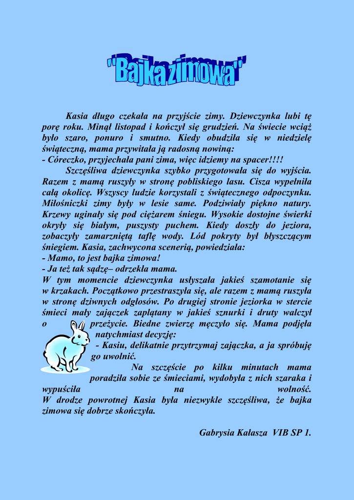 Kasia długo czekała na przyjście zimy. Dziewczynka lubi tę porę roku. Minął listopad i kończył się grudzień. Na świecie wciąż było szaro, ponuro i smutno. Kiedy obudziła się w niedzielę świąteczną, mama przywitała ją radosną nowiną: - Córeczko, przyjechała pani zima, więc idziemy na spacer!!!! Szczęśliwa dziewczynka szybko przygotowała się do wyjścia. Razem z mamą ruszyły w stronę pobliskiego lasu. Cisza wypełniła całą okolicę. Wszyscy ludzie korzystali z świątecznego odpoczynku. Miłośniczki zimy były w lesie same. Podziwiały piękno natury. Krzewy uginały się pod ciężarem śniegu. Wysokie dostojne świerki okryły się białym, puszysty puchem. Kiedy doszły do jeziora, zobaczyły zamarzniętą taflę wody. Lód pokryty był błyszczącym śniegiem. Kasia, zachwycona scenerią, powiedziała: - Mamo, to jest bajka zimowa! - Ja też tak sądzę– odrzekła mama. W tym momencie dziewczynka usłyszała jakieś szamotanie się w krzakach. Początkowo przestraszyła się, ale razem z mamą ruszyła w stronę dziwnych odgłosów. Po drugiej stronie jeziorka w stercie śmieci mały zajączek zaplątany w jakieś sznurki i druty walczył o przeżycie. Biedne zwierzę męczyło się. Mama podjęła natychmiast decyzję: - Kasiu, delikatnie przytrzymaj zajączka, a ja spróbuję go uwolnić. Na szczęście po kilku minutach mama poradziła sobie ze śmieciami, wydobyła z nich szaraka i wypuściła na wolność. W drodze powrotnej Kasia była niezwykle szczęśliwa, że bajka zimowa się dobrze skończyła. Gabrysia Kałasza VIB SP 1.