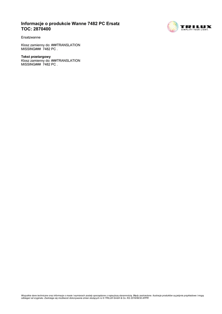 Informacje o produkcie Wanne 7482 PC Ersatz TOC: 2870400 Ersatzwanne Klosz zamienny do: ###TRANSLATION MISSING### 7482 PC . Tekst przetargowy Klosz zamienny do: ###TRANSLATION MISSING### 7482 PC . Wszystkie dane techniczne oraz informacje o masie i wymiarach zostały sporządzone z najwyższą starannością. Błędy zastrzeżone. Ilustracje produktów są jedynie przykładowe i mogą odbiegać od oryginału. Zastrzega się możliwość dokonywania zmian służących ro © TRILUX GmbH & Co. KG 2016/06/30 APPR