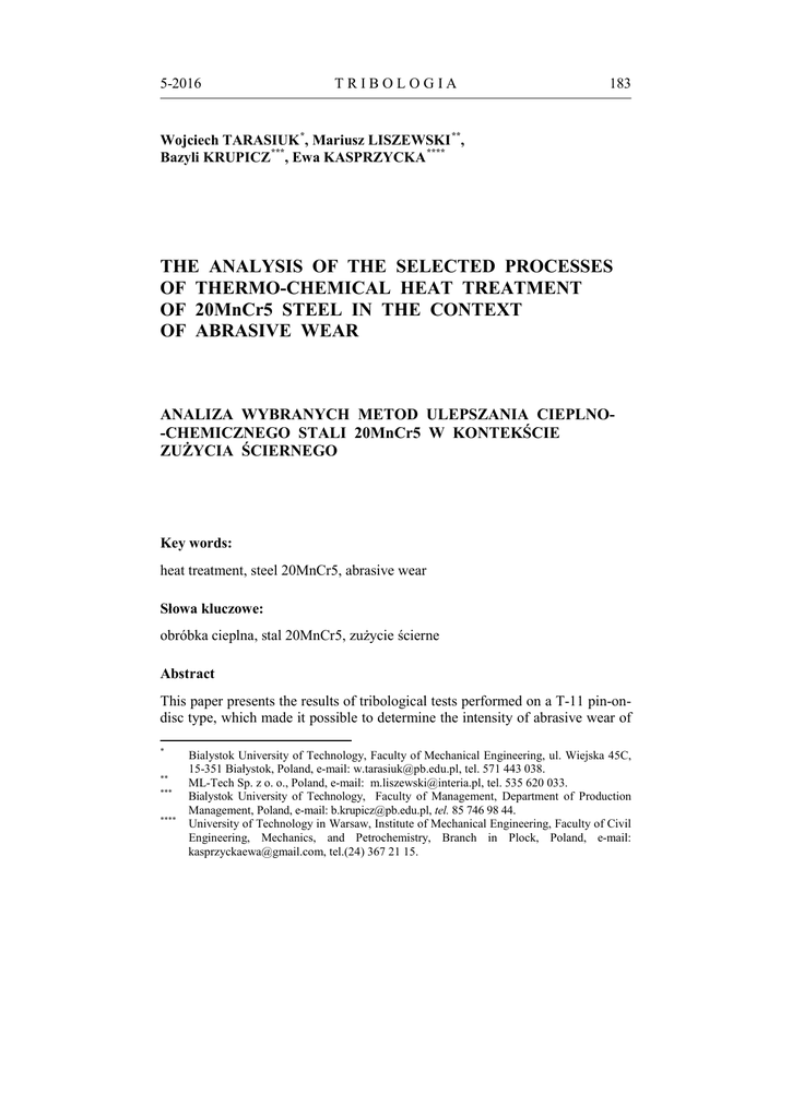 5-2016 TRIBOLOGIA 183 Wojciech TARASIUK *, Mariusz LISZEWSKI **, Bazyli KRUPICZ***, Ewa KASPRZYCKA **** THE ANALYSIS OF THE SELECTED PROCESSES OF THERMO-CHEMICAL HEAT TREATMENT OF 20MnCr5 STEEL IN THE CONTEXT OF ABRASIVE WEAR ANALIZA WYBRANYCH METOD ULEPSZANIA CIEPLNO-CHEMICZNEGO STALI 20MnCr5 W KONTEKŚCIE ZUŻYCIA ŚCIERNEGO Key words: heat treatment, steel 20MnCr5, abrasive wear Słowa kluczowe: obróbka cieplna, stal 20MnCr5, zużycie ścierne Abstract This paper presents the results of tribological tests performed on a T-11 pin-ondisc type, which made it possible to determine the intensity of abrasive wear of * ** *** **** Bialystok University of Technology, Faculty of Mechanical Engineering, ul. Wiejska 45C, 15-351 Białystok, Poland, e-mail: [email protected], tel. 571 443 038. ML-Tech Sp. z o. o., Poland, e-mail: [email protected], tel. 535 620 033. Bialystok University of Technology, Faculty of Management, Department of Production Management, Poland, e-mail: [email protected], tel. 85 746 98 44. University of Technology in Warsaw, Institute of Mechanical Engineering, Faculty of Civil Engineering, Mechanics, and Petrochemistry, Branch in Plock, Poland, e-mail: [email protected], tel.(24) 367 21 15. 184 TRIBOLOGIA 5-2016 steel 20MnCr5 subjected to selected thermo-chemical heat treatments. The tested steel, after the hardening and tempering process, is characterized by high endurance parameters and is used on heavily loaded machine parts. It is frequently used for elements subjected to intense abrasion. The analysis involved the following: carburizing, boronizing, and various methods of diffusion chromizing. For large loads, it is advisable to apply boronizing or carburizing with hardening. Chrome plating entails a very thin layer of increased hardness, which is characterised by a low abrasive wear resistance at high loads. INTRODUCTION Resistance to abrasive wear is a crucial parameter in the process of selecting materials for machine parts. Hardness is an indicator for resistance to abrasive wear for steel. However, methods involving a plastic deformation of the surface layer do not always improve wear resistance [L. 1, 2]. This can occur, for instance, in the production of silicate bricks that are made in the process of densifying a calcium-sand mixture. The conditions of mixture densification (high pressure, dry friction) cause intensive wear of matrixes (or their sheeting). Due to high tensions achieved with desirable methods improving hardness, the sheetings constantly feature possibly high hardness without plastic deformation. This can be achieved by applying, e.g., heat or thermo-chemical heat treatment, welding, and alloying [L. 3, 4, 8]. The type of the proper treatment must correspond to a specific type of steel or the desired technological process. RESEARCH PROCEDURE The tested material and types of heat-chemical treatment The research involved 20MnCr5 Chrome Manganese alloy steel intended for carburizing. In an improved state, it is characterised by a significant resistance to abrasive wear [L. 4–6]. It can be used for large-intersection elements, including the plates of matrixes of silicate products. Its applied parameters can also be significantly improved through thermo-chemical heat treatment. The analysis of literature [L. 5–12] and the experiments performed at the Institute of Precision Mechanics in Warsaw lead to the following types of thermo-chemical heat treatment of steel 20MnCr5: Carburizing, Boronizing, Vacuum chromizing, and Powder pack chromizing. 5-2016 TRIBOLOGIA 185 Each sample, regardless of the type of thermo-chemical heat treatment, was subjected to normalising annealing and tempering. Carburizing and tempering lead to the creation of a hard surface layer of high resistance to abrasive wear. The time of carburizing (6 h) was selected in such a manner so as to obtain the surface layer of high hardness over 2 mm deep. In this process, which was applied to large-dimension elements [L. 2], the endurance properties of the core change to a minor or to no extent. In the case of samples for tribological studies, the process of carburizing caused carbon saturation in the total volume. High hardness and micro-hardness values shall occur throughout the total thickness of the sample. Boronizing is another applied method of thermo-chemical heat treatment. The hardness of boride layers resulting from this process can be higher than carburized and nitrogenized layers [L. 6, 7]. FeB borides may reach the hardness of 1800 – 2350 µHV, and Fe2B borides – 1400 – 1800 µHV [L. 7]. High hardness of the resulting layers features good resistance to abrasion without lubrication [L. 7]. The study also involved two methods of diffusion chromizing: vacuum and powder. They both lead to the creation of surface layers of small thickness and hardness reaching 1600 – 1800 µHV [L. 11, 12]. The selected methods were conducted on steel plates 4 mm thick. Table 1 presents the summary of parameters of the performed thermo-chemical heat treatments of steel 20MnCr5 samples. Table 1. Parameters of the thermo-chemical heat treatment of 20MnCr5 steel Tabela 1. Parametry obróbki cieplno-chemicznej próbek ze stali 20MnCr5 Sample marking 1 20MnCr5 2 3 4 Performed processes carburizing hardening tempering powder boronizing hardening tempering vacuum chromizing hardening annealing tempering powder pack chromizing hardening tempering Parameters of the sample Temperature [°C] 930 900 200 950 900 200 1110 900 700 200 950 900 200 Time [h] 6 0.5 2 6 0.5 2 8 0.5 0.33 2 8 0.5 2 TRIBOLOGIA 186 5-2016 Research method and conditions The usefulness of steel 20MnCr5 upon the chosen thermo-chemical heat treatment for working at high loads was determined based on the results of friction tests. The samples used in the research had a shape of an intersection approximate to a square. The reason for applying such a shape was the technology of performing specific thermo-chemical heat treatments, wh