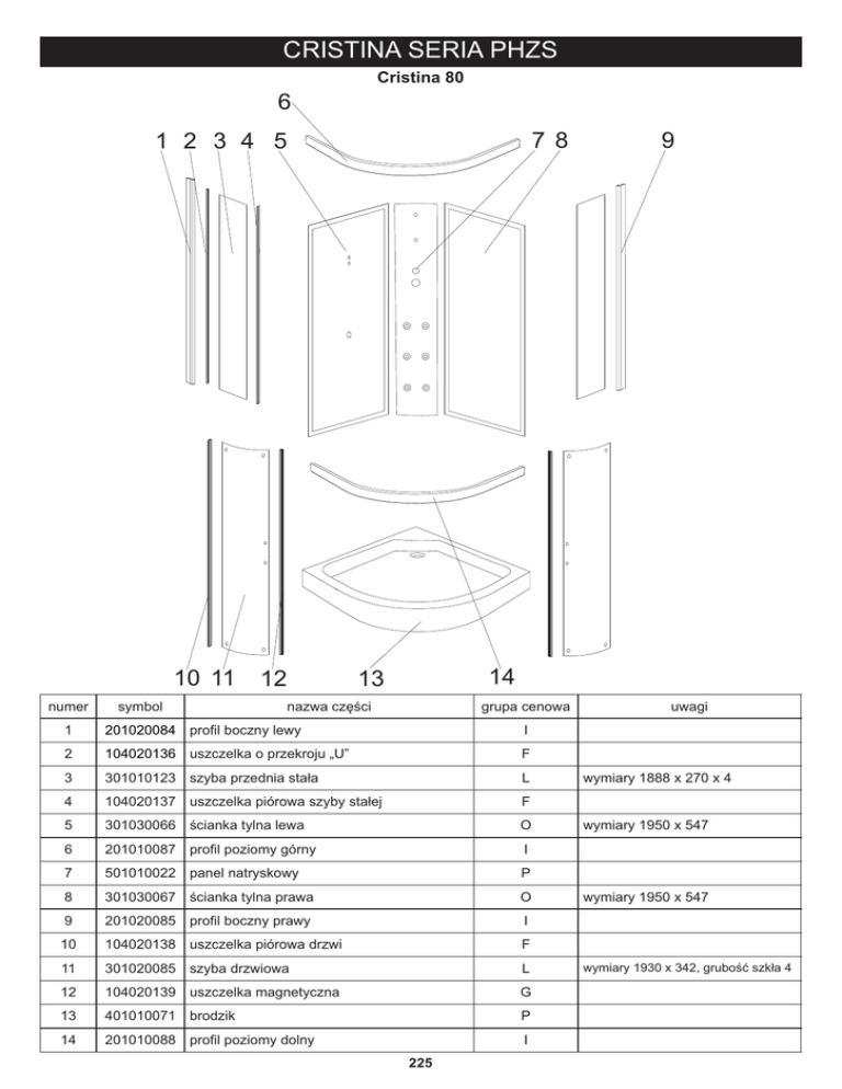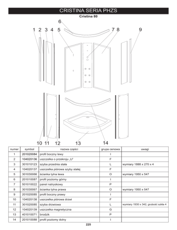CRISTINA SERIA PHZS Cristina 80 6 7 8 1 2 3 4 5 10 11 numer symbol 12 9 14 13 nazwa części grupa cenowa 1 201020084 profil boczny lewy I 2 104020136 uszczelka o przekroju „U” F 3 301010123 szyba przednia stała L 4 104020137 uszczelka piórowa szyby stałej F 5 301030066 ścianka tylna lewa O 6 201010087 profil poziomy górny I 7 501010022 panel natryskowy P 8 301030067 ścianka tylna prawa O 9 201020085 profil boczny prawy I 10 104020138 uszczelka piórowa drzwi F 11 301020085 szyba drzwiowa L 12 104020139 uszczelka magnetyczna G 13 401010071 brodzik P 14 201010088 profil poziomy dolny I 225 uwagi wymiary 1888 x 270 x 4 wymiary 1950 x 547 wymiary 1950 x 547 wymiary 1930 x 342, grubość szkła 4 Cristina 90 6 7 8 1 2 3 4 5 10 11 numer symbol 12 9 14 13 nazwa części grupa cenowa 1 201020084 profil boczny lewy I 2 104020136 uszczelka o przekroju „U” F 3 301010124 szyba przednia stała L 4 104020137 uszczelka piórowa szyby stałej F 5 301030068 ścianka tylna lewa O 6 201010089 profil poziomy górny I 7 501010022 panel natryskowy P 8 301030069 ścianka tylna prawa O 9 201020085 profil boczny prawy I 10 104020138 uszczelka piórowa drzwi F 11 301020086 szyba drzwiowa L 12 104020139 uszczelka magnetyczna G 13 401010072 brodzik P 14 201010090 profil poziomy dolny I 226 uwagi wymiary 1888 x 310 x 4 wymiary 1950 x 642 wymiary 1950 x 642 wymiary 1930 x 372, grubość szkła 4 Cristina - akcesoria 1 2 3 4 5 6 7 8 9 10 11 12 13 14 15 16 17 18 19 20 numer symbol nazwa części grupa cenowa uwagi 1 501020024 korpus panelu natryskowego N wymaga potwierdzenia dostępności 2 106010004 bateria kompletna M rozstaw 100 3 103010001 głowica mieszacza - 40 mm G 4 103020009 głowica przełącznika funkcji G 5 101030026 uchwyt mieszacza E 6 101030025 uchwyt przełącznika funkcji E 7 102020016 rozeta mieszacza C 8 102020019 rozeta przełącznika funkcji C 9 102040013 osłona głowicy C 10 105010013 dysza masażowa przelotowa D 11 105010014 dysza masażowa końcowa D 12 102030045 wąż połączeniowy deszczownicy D długość 30 cm 13 102030046 wąż połączeniowy zestawu natryskowego D długość 60 cm 14 102030040 wąż połączeniowy dysz masażowych F długość 170 cm 15 102060001 opaska zaciskowa B 16 102050006 kolanko węża - tworzywo B 17 502010006 nakładka panelu natryskowego D 18 702010012 rolka górna E średnica kółka 22 19 702010013 rolka dolna E średnica kółka 22 20 702010003 odbojnik B 227 średnica 34, wysokość 75 (78) gniazdo na kwadrat Cristina - akcesoria 1 2 3 4 5 6 7 8 9 10 11 12 13 14 15 16 17 18 19 20 numer symbol nazwa części grupa cenowa 1 702020006 uchwyt drzwi F 2 105050005 drenaż H 3 105010015 słuchawka natryskowa G 4 105020004 wąż natryskowy E 5 105030006 drążek natryskowy kompletny I 6 105030007 uchwyt słuchawki E 7 105030008 uchwyt drążka dolny E 8 105030009 uchwyt drążka górny E 9 105030011 I 10 105010016 deszczownica I 11 105030012 przegub deszczownicy C 12 701010006 uchwyt ścienny B 13 701010003 zestaw montażowy drążka natrysku B 14 701010007 zestaw wkrętów do montażu kabiny F 15 702020007 uchwyt szyby stałej A 16 701020002 nakrętka 1/2" z kołnierzem - tworzywo A 17 104020086 uszczelka 1/2" A ramię deszczownicy 18 19 20 228 uwagi rozstaw otworów 145 1/2" x 1/2" L1500 średnica 145 Cristina - zestawy części symbol nazwa części grupa cenowa uwagi 901010221 paczka 1/4 Cristina 80 T brodzik, profile poziome, akcesoria, zestaw montażowy 901010222 paczka 2/4 Cristina 80 S ścianki tylne 901010223 paczka 3/4 Cristina 80 R panel natryskowy, drążek słuchawki i uchwyt deszczownicy 901010224 paczka 4/4 Cristina 80 S szyby stałe przednie, szyby drzwi, profile pionowe, uszczelki 901010225 paczka 1/4 Cristina 90 T brodzik, profile poziome, akcesoria, zestaw montażowy 901010226 paczka 2/4 Cristina 90 S ścianki tylne 901010223 paczka 3/4 Cristina 90 R panel natryskowy, drążek słuchawki i uchwyt deszczownicy 901010227 paczka 4/4 Cristina 90 S szyby stałe przednie, szyby drzwi, profile pionowe, uszczelki 902010035 zestaw montażowy O kompletny zestaw z paczki 1/4 229