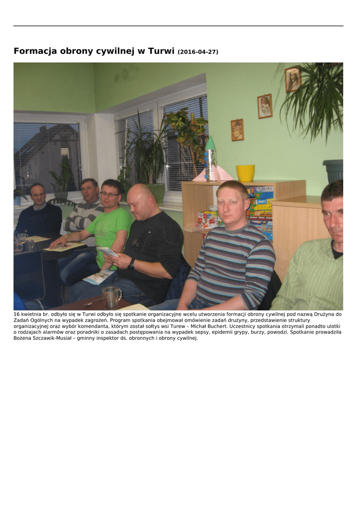 Formacja obrony cywilnej w Turwi (2016-04-27) 16 kwietnia br. odbyło się w Turwi odbyło się spotkanie organizacyjne wcelu utworzenia formacji obrony cywilnej pod nazwą Drużyna do Zadań Ogólnych na wypadek zagrożeń. Program spotkania obejmował omówienie zadań drużyny, przedstawienie struktury organizacyjnej oraz wybór komendanta, którym został sołtys wsi Turew – Michał Buchert. Uczestnicy spotkania otrzymali ponadto ulotki o rodzajach alarmów oraz poradniki o zasadach postępowania na wypadek sepsy, epidemii grypy, burzy, powodzi. Spotkanie prowadziła Bożena Szczawik-Musiał – gminny inspektor ds. obronnych i obrony cywilnej. Powered by TCPDF (www.tcpdf.org)