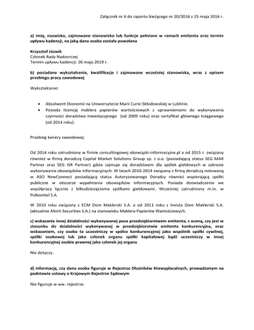 Załącznik nr 4 do raportu bieżącego nr 20/2016 z 25 maja 2016 r. a) imię, nazwisko, zajmowane stanowisko lub funkcje pełnione w ramach emitenta oraz termin upływu kadencji, na jaką dana osoba została powołana Krzysztof Józwik Członek Rady Nadzorczej Termin upływu kadencji: 26 maja 2019 r. b) posiadane wykształcenie, kwalifikacje i zajmowane wcześniej stanowiska, wraz z opisem przebiegu pracy zawodowej Wykształcenie: Absolwent Ekonomii na Uniwersytecie Marii Curie-Skłodowskiej w Lublinie. Posiada licencję maklera papierów wartościowych z uprawnieniami do wykonywania czynności doradztwa inwestycyjnego (od 2009 roku) oraz certyfikat głównego księgowego (od 2014 roku). Przebieg kariery zawodowej: Od 2014 roku zatrudniony w firmie consultingowej obowiązki-informacyjne.pl a od 2015 r. związany również w firmą doradczą Capital Market Solutions Group sp. z o.o. (posiadającą status SEG MAR Partner oraz SEG ISR Partner) gdzie zajmuje się doradztwem dla spółek giełdowych w zakresie wykonywania obowiązków informacyjnych. W latach 2010-2014 związany z firmą doradczą notowaną w ASO NewConnect posiadającą status Autoryzowanego Doradcy również wspierającą spółki publiczne w obszarze wypełniania obowiązków informacyjnych. Posiada doświadczenie we współpracy łącznie z kilkudziesięcioma spółkami giełdowymi. Wcześniej zatrudniony m.in. w Polkomtel S.A. W 2010 roku związany z ECM Dom Maklerski S.A. a od 2011 roku z Invista Dom Maklerski S.A. (aktualnie Aforti Securities S.A.) na stanowisku Maklera Papierów Wartościowych. c) wskazanie innej działalności wykonywanej poza przedsiębiorstwem emitenta, z oceną, czy jest w stosunku do działalności wykonywanej w przedsiębiorstwie emitenta konkurencyjna, oraz wskazaniem, czy osoba ta uczestniczy w spółce konkurencyjnej jako wspólnik spółki cywilnej, spółki osobowej lub jako członek organu spółki kapitałowej bądź uczestniczy w innej konkurencyjnej osobie prawnej jako członek jej organu Nie dotyczy. d) informację, czy dana osoba figuruje w Rejestrze Dłużników Niewypłacalnych, prowadzonym na podstawie ustawy o Krajowym Rejestrze Sądowym Nie figuruje w ww. rejestrze.