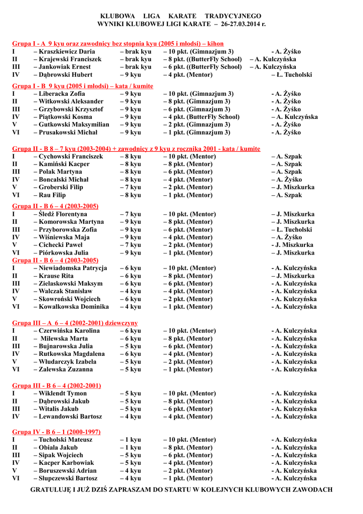 KLUBOWA LIGA KARATE TRADYCYJNEGO WYNIKI KLUBOWEJ LIGI KARATE – 26-27.03.2014 r. Grupa I - A 9 kyu oraz zawodnicy bez stopnia kyu (2005 i młodsi) – kihon I – Kraszkiewicz Daria – brak kyu – 10 pkt. (Gimnazjum 3) II – Krajewski Franciszek – brak kyu – 8 pkt. ((ButterFly School) III – Jankowiak Ernest – brak kyu – 6 pkt. ((ButterFly School) IV – Dąbrowski Hubert – 9 kyu – 4 pkt. (Mentor) Grupa I - B 9 kyu (2005 i młodsi) – kata / kumite I – Liberacka Zofia – 9 kyu II – Witkowski Aleksander – 9 kyu III – Grzybowski Krzysztof – 9 kyu IV – Piątkowski Kosma – 9 kyu V – Gutkowski Maksymilian – 9 kyu VI – Prusakowski Michał – 9 kyu - A. Żyśko – A. Kulczyńska – A. Kulczyńska – Ł. Tucholski – 10 pkt. (Gimnazjum 3) – 8 pkt. (Gimnazjum 3) – 6 pkt. (Gimnazjum 3) – 4 pkt. (ButterFly School) – 2 pkt. (Gimnazjum 3) – 1 pkt. (Gimnazjum 3) Grupa II - B 8 – 7 kyu (2003-2004) + zawodnicy z 9 kyu z rocznika 2001 - kata / kumite I – Cychowski Franciszek – 8 kyu – 10 pkt. (Mentor) II – Kamiński Kacper – 8 kyu – 8 pkt. (Mentor) III – Polak Martyna – 8 kyu – 6 pkt. (Mentor) IV – Boncalski Michał – 8 kyu – 4 pkt. (Mentor) V – Groberski Filip – 7 kyu – 2 pkt. (Mentor) VI – Rau Filip – 8 kyu – 1 pkt. (Mentor) Grupa II - B 6 – 4 (2003-2005) I – Śledź Florentyna II – Komorowska Martyna III – Przyborowska Zofia IV – Wiśniewska Maja V – Cichecki Paweł VI – Piórkowska Julia Grupa II - B 6 – 4 (2003-2005) I – Niewiadomska Patrycja II – Krause Rita III – Zielaskowski Maksym IV – Walczak Stanisław V – Skowroński Wojciech VI – Kowalkowska Dominika - A. Żyśko - A. Żyśko - A. Żyśko – A. Kulczyńska - A. Żyśko - A. Żyśko – A. Szpak – A. Szpak – A. Szpak – A. Żyśko – J. Miszkurka – A. Szpak – 7 kyu – 9 kyu – 9 kyu – 9 kyu – 7 kyu – 9 kyu – 10 pkt. (Mentor) – 8 pkt. (Mentor) – 6 pkt. (Mentor) – 4 pkt. (Mentor) – 2 pkt. (Mentor) – 1 pkt. (Mentor) – J. Miszkurka – J. Miszkurka – Ł. Tucholski – A. Żyśko - J. Miszkurka – J. Miszkurka – 6 kyu – 6 kyu – 6 kyu – 4 kyu – 6 kyu – 4 kyu – 10 pkt. (Mentor) – 8 pkt. (Mentor) – 6 pkt. (Mentor) – 4 pkt. (Mentor) – 2 pkt. (Mentor) – 1 pkt. (Mentor) - A. Kulczyńska – J. Miszkurka - A. Kulczyńska - A. Kulczyńska - A. Kulczyńska - A. Kulczyńska Grupa III – A 6 – 4 (2002-2001) dziewczyny I – Czerwińska Karolina – 6 kyu II – Milewska Marta – 6 kyu III – Bujnarowska Julia – 5 kyu IV – Rutkowska Magdalena – 6 kyu V – Włudarczyk Izabela – 5 kyu VI – Zalewska Zuzanna – 5 kyu – 10 pkt. (Mentor) – 8 pkt. (Mentor) – 6 pkt. (Mentor) – 4 pkt. (Mentor) – 2 pkt. (Mentor) – 1 pkt. (Mentor) - A. Kulczyńska - A. Kulczyńska - A. Kulczyńska - A. Kulczyńska - A. Kulczyńska - A. Kulczyńska Grupa III - B 6 – 4 (2002-2001) I – Wiklendt Tymon II – Dąbrowski Jakub III – Witalis Jakub IV – Lewandowski Bartosz – 5 kyu – 5 kyu – 5 kyu – 4 kyu – 10 pkt. (Mentor) – 8 pkt. (Mentor) – 6 pkt. (Mentor) – 4 pkt. (Mentor) - A. Kulczyńska - A. Kulczyńska - A. Kulczyńska - A. Kulczyńska Grupa IV - B 6 – 1 (2000-1997) I – Tucholski Mateusz II – Obiala Jakub III – Sipak Wojciech IV – Kacper Karbowiak V – Boruszewski Adrian VI – Słupczewski Bartosz – 1 kyu – 1 kyu – 5 kyu – 5 kyu – 4 kyu – 4 kyu – 10 pkt. (Mentor) – 8 pkt. (Mentor) – 6 pkt. (Mentor) – 4 pkt. (Mentor) – 2 pkt. (Mentor) – 1 pkt. (Mentor) - A. Kulczyńska - A. Kulczyńska - A. Kulczyńska - A. Kulczyńska - A. Kulczyńska - A. Kulczyńska GRATULUJĘ I JUŻ DZIŚ ZAPRASZAM DO STARTU W KOLEJNYCH KLUBOWYCH ZAWODACH