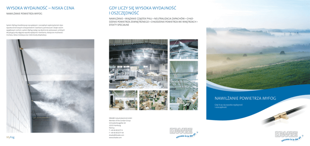 WYSOKA WYDAJNOŚĆ – NISKA CENA NAWILŻANIE POWIETRZA MYFOG System MyFog charakteryzuje się wydajnym i oszczędnym wykorzystaniem dysz wysokociśnieniowych w bezpośrednim nawilżaniu pomieszczeń. Dzięki swoim wyjątkowym cechom, system MyFog nadaje się idealnie do zastosowań, w których decydującą rolę odgrywa wysoka wydajność nawilżania, elastyczne możliwości montażu, łatwa instalacja oraz niskie koszty eksploatacji. GDY LICZY SIĘ WYSOKA WYDAJNOŚĆ I OSZCZĘDNOŚĆ NAWILŻANIE • WIĄZANIE CZĄSTEK PYŁU • NEUTRALIZACJA ZAPACHÓW • CHŁODZENIE POWIETRZA ZEWNĘTRZNEGO • CHŁODZENIE POWIETRZA WE WNĘTRZACH • EFEKTY SPECJALNE NAWILŻANIE POWIETRZA MYFOG Gdy liczy się wysoka wydajność i oszczędność MyFog DRAABE Industrietechnik GmbH Member of the Condair Group Schnackenburgallee 18 22525 Hamburg Niemcy T +49 40 853277-0 F +49 40 853277-44 [email protected] www.draabe.com KORZYŚCI POMPA WYSOKOCIŚNIENIOWA MYFOG SYSTEM NAWILŻANIE POWIETRZA MYFOG NAWILŻANIE POWIETRZA MYFOG NAWILŻANIE POWIETRZA MYFOG Wiązki z dyszami MyFog można mocować do stalowych linek lub do przytwierdzonych do ściany kanałów kablowych. Pompa wysokociśnieniowa MyFog stanowi siłę napędową całej instalacji: Wytwarza ciśnienie robocze 70 bar, które pozwala rozpylać mikroskopijną mgłę przez dysze MyFog. Dzięki zastosowaniu innowacyjnych rozwiązań w pompie wysokociśnieniowej MyFog, cały system pracuje wyjątkowo oszczędnie i przyjaźnie. Wysoki poziom higieny Funkcja automatycznego włączania cyklu płukania całej instalacji chroni przed zanieczyszczeniem instalacji bakteriami podczas przerwy w pracy. Dezynfekcja bakteryjna UV (opcja) oraz mikrofiltr zapewniają dodatkową ochronę przed mikroorganizmami i zanieczyszczeniami gromadzącymi się w wodzie do nawilżaczy. Efektywność energetyczna Pompy wysokociśnieniowe MyFog o wydajności 1000 l/h nadają się idealnie do zastosowań wymagających szczególnie intensywnego nawilżania. Bardzo niskie zużycie prądu zapewnia przy tym wyjątkowo niskie koszty eksploatacji oraz dużą oszczędność. Zawór elektromagnetyczny Strefa 1 Łatwa instalacja Elastyczne wiązki dysz montuje się łatwo na dostępnym wyposażeniu. Elastyczne rozmieszczenie Ruchomy system nachylania dysz pozwala skierować strumień rozpylanej cieczy w żądane miejsce. Wysoka wydajność – niskie koszty Sterowana częstotliwościowo pompa wysokociśnieniowa zapewnia wyjątkowo ekonomiczne i bezobsługowe nawilżanie powietrza. Zasilanie elektryczne Łatwa konserwacja Pompa wysokociśnieniowa MyFog jest wykonana z wysokogatunkowej stali nierdzewnej. Pompa nie musi być smarowana olejem, gdyż pracuje w środowisku wodnym. Pozwala to uniknąć konieczności konserwacji i wydłuża trwałość pompy. Pompy wysokociśnieniowe są oferowane z gwarancją 5000 roboczogodzin bez konserwacji w pierwszych dwóch latach działania. Dysze DRAABE MyFog Odpływ HumSpot Dokładnie w punkt! DRAABE HumSpot steruje i nadzoruje proces nawilżania poszczególnych stref (np. w różnych pomieszczeniach, obszarach roboczych). Prosta struktura menu i podświetlony kolorowy wyświetlacz zapewniają wysoki komfort obsługi. Dane techniczne Jeden otwór w dyszy o średnicy 200µ wytwarza mikrodrobną mgłę z cząsteczek o wielkości 15 mikronów (według Sauter). Specjalny niekapiący zawór gwarantuje instalację bez kapania. MyFog Strefa 2 Dopływ wody Bezolejowa pompa wysokociśnieniowa MyFog Regulowany system nachylania dysz do ustawiania kąta rozpylania. Zawór elektromagnetyczny DRAABE HumSpot Precyzyjne sterowanie Cyfrowy system sterowania zapewnia wyjątkowo punktualne uruchamianie nawilżania powietrza, gdy nastąpi spadek wilgotności poniżej zadanej wartości. Elastyczne, odporne na działanie promieni UV węże wysokociśnieniowe pozwalają na łatwe i stosunkowo niedrogie wykonanie instalacji. Odpływ Odpływ Funkcje: Wydajny system dysz wysokociśnieniowych Mikroskopijne nawilżanie bez konieczności używania drogiego w wytwarzaniu sprężonego powietrza (koszty energii, konserwacja sprężarki itp.). Dysze DRAABE MyFog Moduł pompy MyFog M MyFog L MyFog XL Wydajność (maks.) 265 l/h 440 l/h 1000 l/h Pobór mocy 0,75 kW 1,5 kW 3,0 kW Napięcie 400V 3~ Wydajność dysz (maks.) 4,3 l/h Ciśnienie robocze 70 bar Wymiary (SxGxW) 660 x 500 x 1300 mm Ciężar 53 kg 63 kg 81 kg MyFog Funkcje: • Wyjątkowo punktualne uruchamianie nawilżania powietrza, gdy nastąpi spadek wilgotności poniżej zadanej wartości. • Wysoka precyzja pomiaru dzięki zastosowaniu cyfrowej, pojemnościowej techniki pomiaru wilgotności • Nieprzerwane wskazanie stanu wilgotności względnej i temperatury pomieszczenia HumSpot