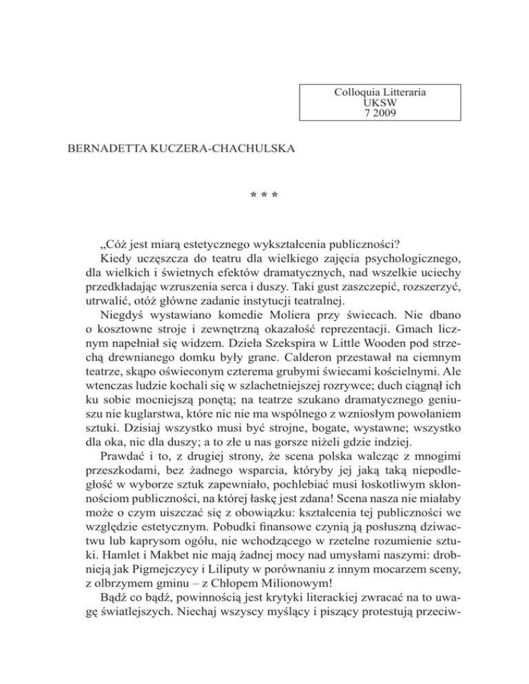 Colloquia Litteraria UKSW 7 2009 Bernadetta Kuczera-Chachulska *** „Cóż jest miarą estetycznego wykształcenia publiczności? Kiedy uczęszcza do teatru dla wielkiego zajęcia psychologicznego, dla wielkich i świetnych efektów dramatycznych, nad wszelkie uciechy przedkładając wzruszenia serca i duszy. Taki gust zaszczepić, rozszerzyć, utrwalić, otóż główne zadanie instytucji teatralnej. Niegdyś wystawiano komedie Moliera przy świecach. Nie dbano o kosztowne stroje i zewnętrzną okazałość reprezentacji. Gmach licznym napełniał się widzem. Dzieła Szekspira w Little Wooden pod strzechą drewnianego domku były grane. Calderon przestawał na ciemnym teatrze, skąpo oświeconym czterema grubymi świecami kościelnymi. Ale wtenczas ludzie kochali się w szlachetniejszej rozrywce; duch ciągnął ich ku sobie mocniejszą ponętą; na teatrze szukano dramatycznego geniuszu nie kuglarstwa, które nic nie ma wspólnego z wzniosłym powołaniem sztuki. Dzisiaj wszystko musi być strojne, bogate, wystawne; wszystko dla oka, nic dla duszy; a to złe u nas gorsze niżeli gdzie indziej. Prawdać i to, z drugiej strony, że scena polska walcząc z mnogimi przeszkodami, bez żadnego wsparcia, któryby jej jaką taką niepodległość w wyborze sztuk zapewniało, pochlebiać musi łoskotliwym skłonnościom publiczności, na której łaskę jest zdana! Scena nasza nie miałaby może o czym uiszczać się z obowiązku: kształcenia tej publiczności we względzie estetycznym. Pobudki finansowe czynią ją posłuszną dziwactwu lub kaprysom ogółu, nie wchodzącego w rzetelne rozumienie sztuki. Hamlet i Makbet nie mają żadnej mocy nad umysłami naszymi: drobnieją jak Pigmejczycy i Liliputy w porównaniu z innym mocarzem sceny, z olbrzymem gminu – z Chłopem Milionowym! Bądź co bądź, powinnością jest krytyki literackiej zwracać na to uwagę światlejszych. Niechaj wszyscy myślący i piszący protestują przeciw- Colloquia Litteraria ko publicznemu gustowi! Nigdy większy wandalizm nie zagrażał scenie. Ludzie odwykli od wrażeń! Zgasło światło geniuszu. Wszystko zależy na garderobie i dekoracjach. Płacz i smutek nikogo nie wzruszą; to jedno chyba posłuży nam za wymówkę, że tak się i za granicą dzieje”. Maurycy Mochnacki, Szekspir, „Kurier Polski”, 6 lipca 1830 r. Słowa Maurycego Mochnackiego, zapisane – bez mała – dwa wieki temu, odnosiły się do bardzo określonego momentu rozwoju sztuki scenicznej. Pomijając specjalny, właściwy tamtym czasom kontekst polityczny, społeczny, kulturowy, dość zwrócić uwagę na szeroko rozumianą „scenerię estetyczną”: charakter oczekiwań publiczności i „komunikatu teatralnego”, będącego rezultatem ówczesnych wydarzeń i projektu ówczesnej krytyki. Wydaje się, że „wzruszenia serca i duszy”, „łoskotliwe skłonności publiczności” czy inne formuły używane przez znakomitego dziewiętnastowiecznego pisarza nie dają się przełożyć na wysublimowany (?) i przede wszystkim odmieniony przez dziesięciolecia ważnych teatralnych doświadczeń obraz sceny nam współczesnej; nieprzekładalny jest również pesymizm krytyka dziewiętnastowiecznego. Czy jednak (i mimo wszystko) tych kilka myśli „co nie nowe” nie daje możliwości, nie tworzy perspektywy takiego widzenia teatru początku XXI wieku, które otwiera najbardziej zasadnicze pytania o sens sztuki scenicznej i jej miejsce w naszej kulturze? 6