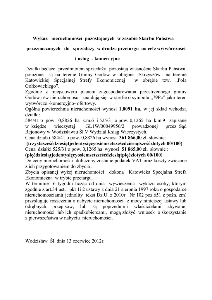 Wykaz nieruchomości pozostających w zasobie Skarbu Państwa przeznaczonych do sprzedaży w drodze przetargu na cele wytwórczości i usług - komercyjne Działki będące przedmiotem sprzedaży pozostają własnością Skarbu Państwa, położone są na terenie Gminy Godów w obrębie Skrzyszów na terenie Katowickiej Specjalnej Strefy Ekonomicznej w obrębie tzw. „Pola Gołkowickiego”. Zgodnie z miejscowym planem zagospodarowania przestrzennego gminy Godów n/w nieruchomości znajdują się w strefie o symbolu „79Pc” jako teren wytwórczo -komercyjno- ofertowy. Ogólna powierzchnia nieruchomości wynosi 1,0091 ha, w jej skład wchodzą działki: 584/41 o pow. 0,8826 ha k.m.6 i 525/31 o pow. 0,1265 ha k.m.9 zapisane w księdze wieczystej GL1W/00049956/2 prowadzonej przez Sąd Rejonowy w Wodzisławiu Śl.V Wydział Ksiąg Wieczystych. Cena działki 584/41 o pow. 0,8826 ha wynosi 361 866,00 zł. słownie: (trzystasześćdziesiątjedentysięcyosiemsetsześcdziesiątsześćzłotych 00/100) Cena działki 525/31 o pow. 0,1265 ha wynosi 51 865,00 zł. słownie : (pięćdziesiątjedentysięcyosiemsetsześćdziesiątpięćzłotych 00/100) Do ceny nieruchomości doliczony zostanie podatek VAT oraz koszty związane z ich przygotowaniem do zbycia . Zbycia opisanej wyżej nieruchomości dokona Katowicka Specjalna Strefa Ekonomiczna w trybie przetargu. W terminie 6 tygodni licząc od dnia wywieszenia wykazu osoby, którym zgodnie z art.34 ust.1 pkt 1i 2 ustawy z dnia 21 sierpnia 1997 roku o gospodarce nieruchomościami( jednolity tekst Dz.U. z 2010r. Nr 102 poz.651 z poźn. zm) przysługuje roszczenia o nabycie nieruchomości z mocy niniejszej ustawy lub odrębnych przepisów, lub są poprzednimi właścicielami zbywanej nieruchomości lub ich spadkobiercami, mogą złożyć wniosek o skorzystanie z pierwszeństwa w nabyciu nieruchomości. Wodzisław Śl. dnia 13 czerwiec 2012r.