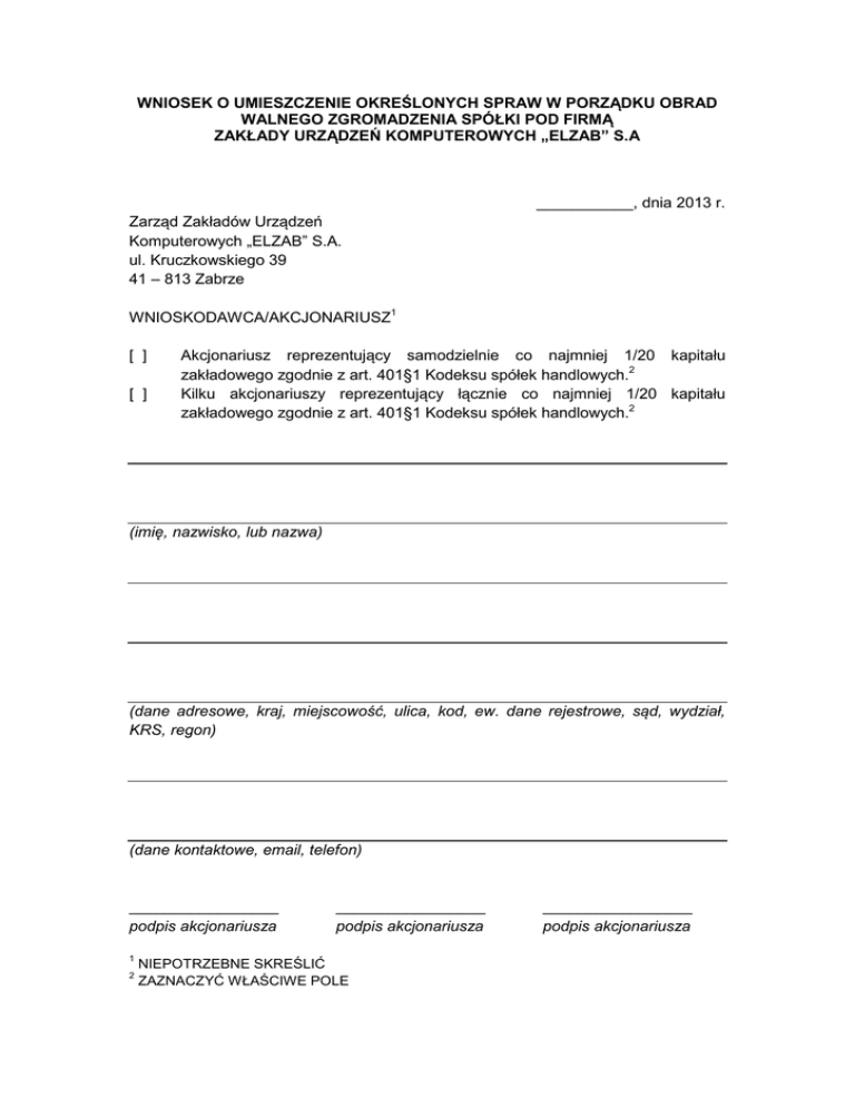 WNIOSEK O UMIESZCZENIE OKREŚLONYCH SPRAW W PORZĄDKU OBRAD WALNEGO ZGROMADZENIA SPÓŁKI POD FIRMĄ ZAKŁADY URZĄDZEŃ KOMPUTEROWYCH „ELZAB” S.A ___________, dnia 2013 r. Zarząd Zakładów Urządzeń Komputerowych „ELZAB” S.A. ul. Kruczkowskiego 39 41 – 813 Zabrze WNIOSKODAWCA/AKCJONARIUSZ1 [ ] [ ] Akcjonariusz reprezentujący samodzielnie co najmniej 1/20 kapitału zakładowego zgodnie z art. 401§1 Kodeksu spółek handlowych.2 Kilku akcjonariuszy reprezentujący łącznie co najmniej 1/20 kapitału zakładowego zgodnie z art. 401§1 Kodeksu spółek handlowych.2 (imię, nazwisko, lub nazwa) (dane adresowe, kraj, miejscowość, ulica, kod, ew. dane rejestrowe, sąd, wydział, KRS, regon) (dane kontaktowe, email, telefon) _________________ podpis akcjonariusza 1 2 _________________ podpis akcjonariusza NIEPOTRZEBNE SKREŚLIĆ ZAZNACZYĆ WŁAŚCIWE POLE _________________ podpis akcjonariusza WAŻNE INFORMACJE DLA AKCJONARIUSZY SPÓŁKI POD FIRMĄ ZAKŁADY URZĄDZEŃ KOMPUTEROWYCH „ELZAB” S.A W przypadku akcjonariusza lub akcjonariuszy, których sposób reprezentacji wymaga przedłożenia właściwych dokumentów zgodnie z zasadami ich reprezentacji, wymagane jest załączenie do powyższego żądania oryginałów lub kopii dokumentów, w postaci właściwej dla sposobu, w jaki zostało złożone żądanie (oryginał w wersji papierowej lub kopia w postaci skanu dokumentu w formacie PDF). Żądanie w formie pisemnej wraz z kompletem załączników, powinno być złożone za potwierdzeniem złożenia w siedzibie Spółki lub wysłane do Spółki, za potwierdzeniem wysłania i potwierdzeniem odbioru, na adres: ul. Kruczkowskiego 39, 41 – 813 Zabrze, lub wysłane Spółce w przypadku formy elektronicznej na adres e-mail: [email protected] Spółka może podjąć proporcjonalne do celu działania służące identyfikacji akcjonariusza lub akcjonariuszy i weryfikacji ważności przesłanych dokumentów. Akcjonariusz lub akcjonariusze mogą składać wniosek przez pełnomocnika. Pełnomocnictwo powinno być sporządzone w formie pisemnej lub udzielone w postaci elektronicznej. W przypadku udzielenia pełnomocnictwa w postaci elektronicznej akcjonariusz informuje o tym fakcie Spółkę za pośrednictwem poczty elektronicznej Spółki za pomocą prawidłowo wypełnionego i podpisanego właściwego formularza pobranego ze strony internetowej Spółki www.elzab.com.pl. Pełnomocnictwo i załączniki do pełnomocnictwa powinny być dostarczone do spółki (dokument w wersji papierowej lub jego kopia), a w przypadku pełnomocnictwa udzielonego w formie elektronicznej dokument i załączniki, w szczególności zawiadomienie o udzieleniu pełnomocnictwa w postaci elektronicznej, powinny zostać zeskanowane do formatu PDF i wpłynąć do Spółki na adres poczty elektronicznej e-mail: [email protected] W celu identyfikacji akcjonariusza udzielającego pełnomocnictwa, do pełnomocnictwa powinna zostać załączona: (i) w przypadku akcjonariusza będącego osobą fizyczną - kopia dowodu osobistego, paszportu lub innego urzędowego dokumentu potwierdzającego tożsamość akcjonariusza; albo (ii) w przypadku akcjonariusza innego niż osoba fizyczna - kopia odpisu z właściwego rejestru lub innego dokumentu potwierdzającego upoważnienie osoby fizycznej (lub osób fizycznych) do reprezentowania akcjonariusza na Zgromadzeniu (np. nieprzerwany ciąg pełnomocnictw). W przypadku braku aktualnego wyciągu z odpowiedniego rejestru, Spółka: (i) wezwie takiego akcjonariusza do przesłania stosownego dokumentu w wyznaczonym przez Spółkę terminie; (ii) w przypadku bezskutecznego upływu wyznaczonego przez Spółkę terminu, o którym mowa powyżej, pełnomocnik takiego akcjonariusza nie zostanie dopuszczony do udziału w Zgromadzeniu. 2 W przypadku wątpliwości co do prawdziwości kopii wyżej wymienionych dokumentów, Zarząd Spółki zastrzega sobie prawo do żądania od pełnomocnika okazania przy sporządzaniu listy obecności: (i) w przypadku akcjonariusza będącego osobą fizyczną - kopii potwierdzonej za zgodność z oryginałem przez notariusza lub inny podmiot uprawniony do potwierdzania za zgodność z oryginałem kopii dowodu osobistego, paszportu lub innego urzędowego dokumentu potwierdzającego tożsamość akcjonariusza; albo (ii) w przypadku akcjonariusza innego niż osoba fizyczna - oryginału lub kopii potwierdzonej za zgodność z oryginałem przez notariusza lub inny podmiot uprawniony do potwierdzania za zgodność z oryginałem odpisu z właściwego rejestru lub innego dokumentu potwierdzającego upoważnienie osoby fizycznej (lub osób fizycznych) do reprezentowania pełnomocnika na Zgromadzeniu (np. nieprzerwany ciąg pełnomocnictw). W celu identyfikacji pełnomocnika, Zarząd Spółki zastrzega sobie prawo do żądania od pełnomocnika okazania przy sporządzaniu listy obecności: (i) w przypadku pełnomocnika będącego osobą fizyczną - dowodu osobistego, paszportu lub innego urzędowego dokumentu potwierdzającego tożsamość pełnomocnika akcjonariusza; albo (ii) w przypadku pełnomocnika innego niż osoba fizyczna - oryginału lub kopii potwierdzonej za zgodność z oryginałem przez notariusza lub inny podmiot uprawniony do potwierdzania za zgodność z oryginałem odpisu z właściwego rejestru lub innego dokumentu potwierdzającego upoważnienie osoby fizycznej (osób fizycznych) do reprezentowania pełnomocnika na Zgromadzeniu (np. nieprzerwany ciąg pełnomocnictw). W celu weryfikacji pełnomocnictwa udzielonego w postaci elektronicznej, Zarząd Spółki zastrzega sobie prawo do: (i) wystąpienia do akcjonariusza lub pełnomocnika telefonicznie lub na podany adres poczty elektronicznej z wnioskiem o potwierdzenie udzielonego pełnomocnictwa, (ii) podjęcia innych działań w celu potwierdzenia udzielonego pełnomocnictwa. Akcjonariusz lub akcjonariusze zgłaszający swoje projekty uchwał dotyczące spraw wprowadzonych do porządku obrad Zgromadzen