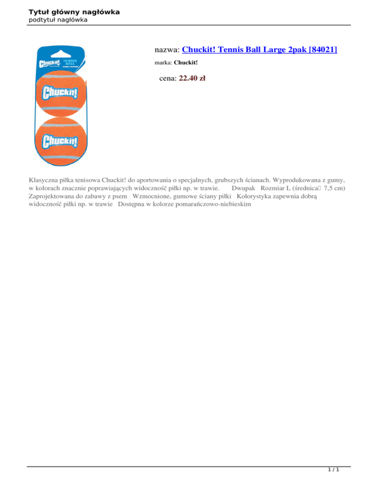 Tytuł główny nagłówka podtytuł nagłówka nazwa: Chuckit! Tennis Ball Large 2pak [84021] marka: Chuckit! cena: 22.40 zł Klasyczna piłka tenisowa Chuckit! do aportowania o specjalnych, grubszych ścianach. Wyprodukowana z gumy, w kolorach znacznie poprawiających widoczność piłki np. w trawie. Dwupak Rozmiar L (średnica 7,5 cm) Zaprojektowana do zabawy z psem Wzmocnione, gumowe ściany piłki Kolorystyka zapewnia dobrą widoczność piłki np. w trawie Dostępna w kolorze pomarańczowo-niebieskim 1/1