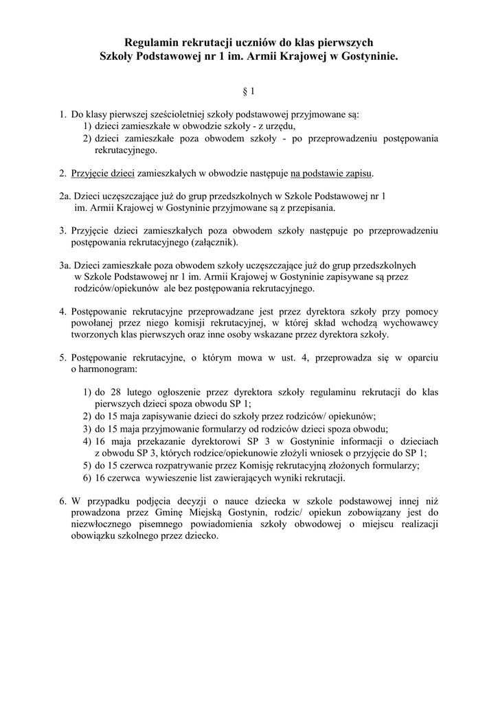 Regulamin rekrutacji uczniów do klas pierwszych Szkoły Podstawowej nr 1 im. Armii Krajowej w Gostyninie. §1 1. Do klasy pierwszej sześcioletniej szkoły podstawowej przyjmowane są: 1) dzieci zamieszkałe w obwodzie szkoły - z urzędu, 2) dzieci zamieszkałe poza obwodem szkoły - po przeprowadzeniu postępowania rekrutacyjnego. 2. Przyjęcie dzieci zamieszkałych w obwodzie następuje na podstawie zapisu. 2a. Dzieci uczęszczające już do grup przedszkolnych w Szkole Podstawowej nr 1 im. Armii Krajowej w Gostyninie przyjmowane są z przepisania. 3. Przyjęcie dzieci zamieszkałych poza obwodem szkoły następuje po przeprowadzeniu postępowania rekrutacyjnego (załącznik). 3a. Dzieci zamieszkałe poza obwodem szkoły uczęszczające już do grup przedszkolnych w Szkole Podstawowej nr 1 im. Armii Krajowej w Gostyninie zapisywane są przez rodziców/opiekunów ale bez postępowania rekrutacyjnego. 4. Postępowanie rekrutacyjne przeprowadzane jest przez dyrektora szkoły przy pomocy powołanej przez niego komisji rekrutacyjnej, w której skład wchodzą wychowawcy tworzonych klas pierwszych oraz inne osoby wskazane przez dyrektora szkoły. 5. Postępowanie rekrutacyjne, o którym mowa w ust. 4, przeprowadza się w oparciu o harmonogram: 1) do 28 lutego ogłoszenie przez dyrektora szkoły regulaminu rekrutacji do klas pierwszych dzieci spoza obwodu SP 1; 2) do 15 maja zapisywanie dzieci do szkoły przez rodziców/ opiekunów; 3) do 15 maja przyjmowanie formularzy od rodziców dzieci spoza obwodu; 4) 16 maja przekazanie dyrektorowi SP 3 w Gostyninie informacji o dzieciach z obwodu SP 3, których rodzice/opiekunowie złożyli wniosek o przyjęcie do SP 1; 5) do 15 czerwca rozpatrywanie przez Komisję rekrutacyjną złożonych formularzy; 6) 16 czerwca wywieszenie list zawierających wyniki rekrutacji. 6. W przypadku podjęcia decyzji o nauce dziecka w szkole podstawowej innej niż prowadzona przez Gminę Miejską Gostynin, rodzic/ opiekun zobowiązany jest do niezwłocznego pisemnego powiadomienia szkoły obwodowej o miejscu realizacji obowiązku szkolnego przez dziecko. §2 Kryteria postępowania rekrutacyjnego. Lp. 1 2 3 4 5 6 Kryterium Kandydat uczęszczał do oddziału przedszkolnego lub klasy I w SP 1 Rodzeństwo kandydata realizuje obowiązek szkolny w SP 1 Jest mieszkańcem Gostynina Rodzeństwo kandydata realizuje obowiązek szkolny w gostynińskim gimnazjum Co najmniej jeden z rodziców pracuje w Gostyninie Rodzeństwo lub jedno z rodziców są absolwentami SP 1 liczba pkt. 10 10 7 5 3 1 §3 1. Do zadań Komisji rekrutacyjnej należy w szczególności: 1) ustalenie wyników postępowania rekrutacyjnego; 2) ustalenie listy kandydatów przyjętych i nieprzyjętych; 3) sporządzenie protokołu z postępowania rekrutacyjnego; 4) przydział uczniów do poszczególnych klas pierwszych. 2. Zasady obowiązujące przy podziale uczniów do poszczególnych klas: 1) podziału dokonuje się według roku i miesiąca urodzenia, poczynając od uczniów najmłodszych; 2) przestrzega się zasadę koedukacyjności – równomierny podział na dziewczynki i chłopców w klasie; 3) w miarę możliwości uwzględnia się indywidualne prośby rodziców (prawnych opiekunów), np. umieszczenie rodzeństwa w jednej klasie. 4) klasy liczą do 25 uczniów, w przypadku oddziałów z osobami o specjalnych potrzebach edukacyjnych lub z niepełnosprawnością do 22 uczniów. §4 Wyniki przeprowadzonego postępowania rekrutacyjnego dyrektor szkoły podaje do publicznej wiadomości w formie listy kandydatów zakwalifikowanych i kandydatów niezakwalifikowanych, zawierającej imiona i nazwiska kandydatów oraz informację o zakwalifikowaniu albo niezakwalifikowaniu kandydata. §5 Dane osobowe kandydatów przyjętych zgromadzone w celach postępowania rekrutacyjnego są przechowywane nie dłużej niż do końca okresu, w którym uczeń uczęszcza do szkoły. §6 Dane osobowe kandydatów nieprzyjętych zgromadzone w celach postępowania rekrutacyjnego są przechowywane w szkole nie dłużej niż 7 dni po ogłoszeniu wyników postępowania rekrutacyjnego.