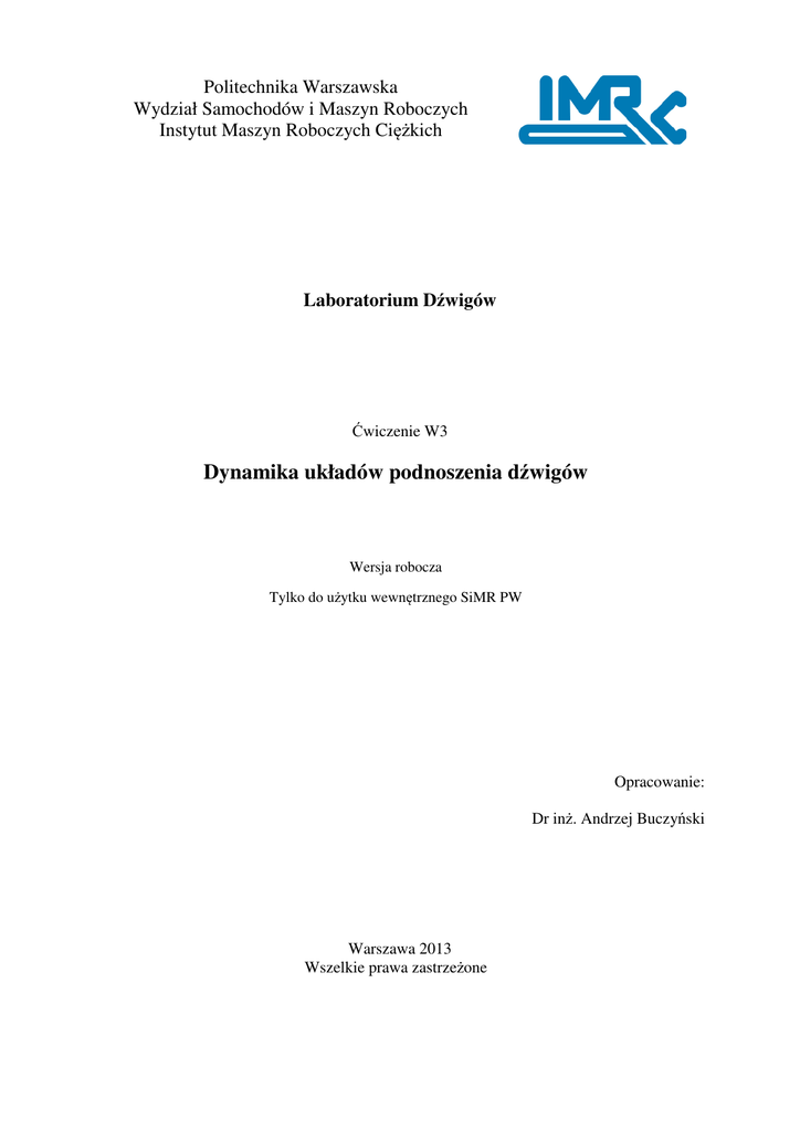 Politechnika Warszawska Wydział Samochodów i Maszyn Roboczych Instytut Maszyn Roboczych Ciężkich Laboratorium Dźwigów Ćwiczenie W3 Dynamika układów podnoszenia dźwigów Wersja robocza Tylko do użytku wewnętrznego SiMR PW Opracowanie: Dr inż. Andrzej Buczyński Warszawa 2013 Wszelkie prawa zastrzeżone 1. CEL ĆWICZENIA Celem ćwiczenia jest zapoznanie studentów z zagadnieniami obciążeń dynamicznych występujących podczas pracy dźwigu, ze szczególnym uwzględnieniem wpływu układu cięgnowego na przeciążenia obserwowane w kabinie urządzenia. Podczas ćwiczenia studenci dokonują oceny sił dynamicznych na podstawie przyjętego modelu teoretycznego oraz weryfikują uzyskane wartości poprzez pomiary sił w cięgnach mechanizmu podnoszenia. 2. WPROWADZENIE Dźwigi, zwane popularnie windami stanowią bardzo rozległą i szczególną grupę środków transportu bliskiego. Rozpatrując jedynie podobieństwa techniczne nic nie stałoby na przeszkodzie, aby zakwalifikować tą grupę maszyn do dźwignic. Jednak ze względu na pewne formalno – prawne uwarunkowania dźwigi są niezależną grupą środków transportu. Posiadają swój własny zasób aktów prawnych (dyrektywy, normy, zalecenia branżowe), przewiduje się tu nieco inne (zazwyczaj bardziej wymagające) zalecenia dotyczące bezpieczeństwa – także dlatego, że w tej grupie maszyn właściwie nie występuje (poza rzadkimi przypadkami w osobie „dźwigowego”) operator. Z dźwigów może korzystać niemal każdy (małe dzieci nie powinny tego robić bez opieki). Dźwigi dzieli się zasadniczo na dwa rodzaje: elektryczne - gdzie układ napędowy w postaci wciągarki z kołem ciernym lub rzadko obecnie z bębnem powoduje podnoszenie i opuszczanie kabiny za pośrednictwem cięgien nośnych (liny, pasy, łańcuchy) – z przełożeniem układu cięgnowego 1:1 lub 2:1. hydrauliczne – gdzie za unoszenie kabiny odpowiada siłownik i obsługujący go układ hydrauliczny. Tu możliwe jest bezpośrednie związanie siłownika z kabiną (centralne, boczne – przełożenia 1:1) bądź za pośrednictwem cięgien nośnych z możliwymi przełożeniami 2:1 i 4:2. Bardzo istotnym elementem projektowania dźwigów jest takie dobranie ich dynamiki, w rozumieniu oddziaływań na kabinę, która nie będzie źródłem negatywnych skutków fizjologicznych wywieranych na organizm ludzki. Przy czym należy tu pamiętać o dwóch rodzajach tych oddziaływań: przyśpieszeniach i opóźnieniach wynikających z procesu rozpędzania i hamowania kabiny w strefie przystanków oraz „przypadkowych” przyśpieszeniach i drganiach kabiny (we wszystkich zresztą kierunkach) wywoływanych na przykład takimi przyczynami jak: współpraca kabiny z prowadnicami, oparcie kabiny na podchwytach, oparcie się kabiny o zderzaki (dźwigi hydrauliczne), „twarda praca” zespołu napędowego. W jednym i drugim przypadku istotna jest praca układu cięgien nośnych. Podczas transportu ładunku na drodze h kabina musi być doprowadzona ze stanu spoczynku do ustalonej prędkości v ruchu roboczego, przemieszczana w ruchu ustalonym i zatrzymana w końcu drogi na poziomie przystanku docelowego. Czas jazdy kabiny tj może więc być przedstawiony jako suma: czasu rozruchu tr, gdy prędkość kabiny wzrasta od 0 do v zależnie od zmian przyspieszenia ar, jakie wywołuje moment rozruchowy silnika podczas wzrostu jego prędkości obrotowej; czasu ruchu ustalonego tu, w którym prędkość kabiny nie podlega zmianom; czasu hamowania th, gdy prędkość kabiny maleje od v do 0 w sposób wynikający ze zmian opóźnienia ah, jakie wprowadza moment hamujący układu wyciągu. 2 W przypadkach zachowania stałych wartości przyspieszenia ar i opóźnienia ah, prędkość ruchu kabiny w funkcji czasu może być przedstawiona w postaci prezentowanej na rys. 1. Pole wykresu prędkości odwzorowuje drogę h przebytą przez kabinę w jednym cyklu jazdy. v vmax vśr t tr tu th Rys. 1. – Wykres prędkości jazdy kabiny przy ar = const i ah = const: a) tu > 0, b) tu = 0 Zgodnie z przyjętymi założeniami drogę kabiny h można przedstawić w postaci: h= v ⋅ tr v ⋅ t h v ⋅ (t r + 2tu + t r ) v ⋅ (t j + t u ) + v ⋅ tu + = = 2 2 2 2 (1) gdzie tj = tr+tu+th. Prędkość średnia kabiny na drodze h jest więc wyznaczona zależnością: v śr = t h 1 = ⋅ v ⋅ 1 + u tj 2 tj , (2) z której wynika, że przy stałej prędkości v prędkość średnia staje się tym większa, im dłuższy jest czas ruchu ustalonego tu w odniesieniu do czasu jazdy tj kabiny. Przy zadanych wartościach ar = const i ah = const czasy ruchów nieustalonych są równe: tr = v/ar i th = v/ah, górną granicę prędkości jazdy kabiny wyraża zależność: v max = 2har ah a r + ah (3) Przy zadanych wartościach h, ar i ah prędkości większe od vmax nie mogą być osiągnięte, gdyż wymaga to rozpoczynania hamowania przy nieukończonym rozruchu, a więc zgodnie z rys. 1b właśnie przy prędkości vmax. Wynika stąd, że dla każdego dźwigu istnieje pewna najkrótsza droga jazdy kabiny, tym większa, im większa jest prędkość v ruchu ustalonego oraz im mniejsze są wartości przyspieszenia ar i opóźnienia ah. Podczas pracy urządzeń dźwigowych na mechanizm podnoszenia i tym samym na konstrukcję kabiny oprócz podstawowych obciążeń (siła ciężkości ładunku oraz elementów własnych) działają obciążenia (siły) dynamiczne. Ich źródłem są siły bezwładności wynikające z przyspieszenia lub opóźnienia ruchu masy ładunku i kabiny. Jeżeli podczas transportu ładunek podlega przyspieszeniu a, to zakres dodatkowych obciążeń wyznacza współczynnik dynamiczny, zdefiniowany w postaci następującej relacji: 3 ψ= g+a g −a (4) Współczynnik dynamiczny ψ przyjmuje różne wartości uwarunkowane poziomem przyspieszenia ar i opóźnienia ah. Przy czym współczynnik ten opisuje obie strony dźwigu (tzn. stronę kabiny i przeciwwagi). Przykładowo przy hamowani