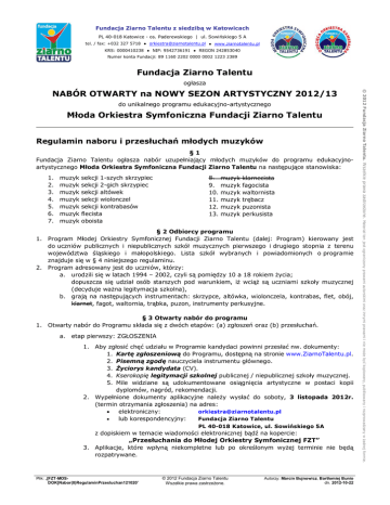 Fundacja Ziarno Talentu z siedzibą w Katowicach PL 40-018 Katowice - os. Paderewskiego | ul. Sowińskiego 5 A tel. / fax: +032 327 5718 ● [email protected] ● www.ziarnotalentu.pl KRS: 0000410238 ● NIP: 9542736191 ● REGON 242853040 Numer konta Fundacji: 89 1160 2202 0000 0002 1223 2389 Fundacja Ziarno Talentu ogłasza do unikalnego programu edukacyjno-artystycznego Młoda Orkiestra Symfoniczna Fundacji Ziarno Talentu Regulamin naboru i przesłuchań młodych muzyków §1 Fundacja Ziarno Talentu ogłasza nabór uzupełniający młodych muzyków do programu edukacyjnoartystycznego Młoda Orkiestra Symfoniczna Fundacji Ziarno Talentu na następujące stanowiska: 1. 2. 3. 4. 5. 6. 7. muzyk muzyk muzyk muzyk muzyk muzyk muzyk sekcji 1-szych skrzypiec sekcji 2-gich skrzypiec sekcji altówek sekcji wiolonczel sekcji kontrabasów flecista oboista 8. 9. 10. 11. 12. 13. muzyk muzyk muzyk muzyk muzyk muzyk klarnecista fagocista waltornista trębacz puzonista perkusista § 2 Odbiorcy programu 1. Program Młodej Orkiestry Symfonicznej Fundacji Ziarno Talentu (dalej: Program) kierowany jest do uczniów publicznych i niepublicznych szkół muzycznych pierwszego i drugiego stopnia z terenu województwa śląskiego i małopolskiego. Lista szkół wybranych i powiadomionych o programie znajduje się w § 4 niniejszego regulaminu. 2. Program adresowany jest do uczniów, którzy: a. urodzili się w latach 1994 – 2002, czyli są pomiędzy 10 a 18 rokiem życia; dopuszcza się udział osób starszych pod warunkiem, iż wciąż są uczniami szkoły muzycznej (decyduje ważna legitymacja szkolna), b. grają na następujących instrumentach: skrzypce, altówka, wiolonczela, kontrabas, flet, obój, klarnet, fagot, waltornia, trąbka, puzon, instrumenty perkusyjne. § 3 Otwarty nabór do programu 1. Otwarty nabór do Programu składa się z dwóch etapów: (a) zgłoszeń oraz (b) przesłuchań. a. etap pierwszy: ZGŁOSZENIA 1. Aby zgłosić chęć udziału w Programie kandydaci powinni przesłać nw. dokumenty: 1. Kartę zgłoszeniową do Programu, dostępną na stronie www.ZiarnoTalentu.pl. 2. Pisemną zgodę nauczyciela instrumentu głównego. 3. Życiorys kandydata (CV). 4. Kserokopię legitymacji szkolnej publicznej / niepublicznej szkoły muzycznej. 5. Mile widziane są udokumentowane osiągnięcia artystyczne w postaci kopii dyplomów, nagród, rekomendacji. 2. Wypełnione dokumenty aplikacyjne należy wysłać do soboty, 3 listopada 2012r. (termin otrzymania zgłoszenia) na adres: · elektroniczny: [email protected] · lub korespondencyjny: Fundacja Ziarno Talentu PL 40-018 Katowice, ul. Sowińskiego 5A z dopiskiem w temacie wiadomości elektronicznej bądź na kopercie: „Przesłuchania do Młodej Orkiestry Symfonicznej FZT” 3. Aplikacje, które wpłyną niekompletne lub po określonym wyżej terminie nie będą rozpatrywane. Plik: „[FZT-MOSDOK]Nabor(0)RegulaminPrzesluchan121020” © 2012 Fundacja Ziarno Talentu Wszelkie prawa zastrzeżone. Autorzy: Marcin Bujnowicz, Bartłomiej Bunio dn. 2012-10-22 © 2012 Fundacja Ziarno Talentu. Wszelkie prawa zastrzeżone. Materiał ten jest ograniczony prawami autorskimi oraz innymi prawami i nie może być kopiowany, publikowany i rozprowadzany w żadnej formie. NABÓR OTWARTY na NOWY SEZON ARTYSTYCZNY 2012/13 Rozwój osobisty i artystyczny dzięki Orkiestrze: „Gramy z pasją!” b. etap drugi: PRZESŁUCHANIA § 4 Informacje końcowe 1. Wzór „Karty zgłoszeniowej do programu edukacyjno-artystycznego – Młoda Orkiestra Symfoniczna Fundacji Ziarno Talentu” oraz repertuar orkiestrowy zawarty w dokumencie „Literatura orkiestrowa do przygotowania” są dostępne na stronie www.ZiarnoTalentu.pl. 2. Lista szkół i uczelni muzycznych, które zostały powiadomione o programie Młoda Orkiestra Symfoniczna Fundacji Ziarno Talentu: a. województwo śląskie: · Akademia Muzyczna (ul. Zacisze 3) KATOWICE · Państwowa Szkoła Muzyczna I i II stopnia (ul. Teatralna 16) · Zespół Państwowych Szkół Muzycznych (ul. Ułańska 7 B) · Prywatna Szkoła Muzyczna ARTIS (ul. Zawiszy Czarnego 8) · Prywatna Szkoła Muzyki Rozrywkowej Nice Noise (ul. Lompy 17) · Szkoła Muzyczna YAMAHA (ul. Sowińskiego 5A) BĘDZIN · Państwowa Szkoła Muzyczna I stopnia (ul. Sportowa 5) BIELSKO-BIAŁA · Państwowa Ogólnokształcąca Szkoła Muzyczna I i II Stopnia (ul. Wyspiańskiego 5 A) BYTOM · Ogólnokształcąca Szkoła Muzyczna I i II stopnia (ul. Moniuszki 17) CHORZÓW · Państwowa Szkoła Muzyczna I i II stopnia (ul. Dąbrowskiego 43) CIESZYN · Państwowa Szkoła Muzyczna (ul. Zamkowa 3) CZĘSTOCHOWA · Zespół Szkół Muzycznych (ul. Jasnogórska 17) DĄBROWA GÓRNICZA · Zespół Szkół Muzycznych (ul. Jakuba Dąbskiego 17) GLIWICE · Państwowa Szkoła Muzyczna I i II stopnia (ul. Wieczorka 6) JASTRZĘBIE ZDRÓJ · Państwowa Szkoła Muzyczna I i II stopnia (ul. Kościuszki 13 A) JAWORZNO · Państwowa Szkoła Muzyczna I stopnia (ul. Inwalidów Wojennych 2 A) LUBLINIEC · Państwowa Szkoła Muzyczna im. Janiny Garści (Pl. Konrada Mańki 9) RACIBÓRZ · Państwowa Szkoła Muzyczna I stopnia (ul. Ogrodowa 7) RUDA ŚLĄSKA · Państwowa Szkoła Muzyczna I-go stopnia (ul. Niedurnego 36) Plik: „[FZT-MOS-DOK]Nabor(0)RegulaminPrzesluchan121020” strona 2 z 3 Autorzy: Marcin Bujnowicz, Bartłomiej Bunio dn. 2012-10-22 © 2012 Fundacja Ziarno Talentu. Wszelkie prawa zastrzeżone. Materiał ten jest ograniczony prawami autorskimi oraz innymi prawami i nie może być kopiowany, publikowany i rozprowadzany w żadnej formie. 1. Przesłuchania kandydatów na członków Młodej Orkiestry Symfonicznej Fundacji Ziarno Talentu odbędą się w dniach 6-7 listopada 2012 roku w Katowicach – Os. Paderewskiego, ul. Sowińskiego 5A, budynek Szkoły Muzycznej YAMAHA. 2. Na przesłuchania zaproszeni zostaną kandydaci spełniający wymogi formalne zawarte w § 2 oraz § 3 pkt. 1 ust. a) – etap pierwszy: ZGŁOSZENIA – niniejszego regulaminu. 3. Lista osób zakwalifikowany