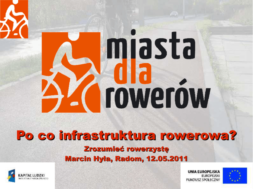 Po co infrastruktura rowerowa? Zrozumieć rowerzystę Marcin Hyła, Radom, 12.05.2011 Po co infrastruktura rowerowa Rower stał się nieodłącznym elementem krajobrazu wielkomiejskiego Zachodu Berlin: 15% podróży na rowerze Amsterdam: 35% podróży na rowerze Kopenhaga: 40% podróży na rowerze Silny wzrost ruchu rowerowego w miastach „nierowerowych”, w tym miastach – gigantach (Paryż, Londyn, Nowy Jork). Po co infrastruktura rowerowa Amsterdam Po co infrastruktura rowerowa Kopenhaga Po co infrastruktura rowerowa Dlaczego rower? Bo nie emituje hałasu ani zanieczyszczeń Bo nie zajmuje miejsca Bo jest tani i powszechnie dostępny Bo jest najefektywniejszym energetycznie urządzeniem skonstruowanym przez człowieka Pieszy: około 100W = 4 km/godz. Rowerzysta: około 100W = 16 km/godz. Po co infrastruktura rowerowa Szesnastokrotna różnica: 3,14 km2 a >50 km2 Po co infrastruktura rowerowa Rower jako element polityki miasta Niczego nie można nakazać Można zwiększyć (albo zmniejszyć!) wolność wyboru Większy wybór = wyższa jakość życia Ułatwienia dla rowerzystów zwiększają swobodę wyboru i umożliwiają racjonalne decyzje każdemu mieszkańcowi Ułatwienie wymaga zrozumienia rowerzysty Po co infrastruktura rowerowa Zrozumieć rowerzystę Jest zarazem kierującym i silnikiem pojazdu Nie ma strefy zgniotu Jest immamentnie niestabilny Jest narażony na czynniki atmosferyczne Pole widzenia inne niż pieszego czy kierowcy Po co infrastruktura rowerowa Zrozumieć rowerzystę i jego dynamikę Rowerzysta „statyczny”, nieruchomy występuje jedynie na skrzyżowaniach z podporządkowaniem lub z sygnalizacją świetlną oraz na parkingach rowerowych Rowerzysta jest bytem dynamicznym: porusza się, i to w specyficzny sposób. Na przykład jadąc pod górę rowerzysta często zajmuje więcej miejsca (silniejszy nacisk na pedały wymusza większe wężykowanie) Po co infrastruktura rowerowa Infrastruktura czy dekoracja teatralna? Po co infrastruktura rowerowa Skrajnia i promień łuku mają uzasadnienie! Po co infrastruktura rowerowa Rowerzysta obok drogi rowerowej... Po co infrastruktura rowerowa … bo opory toczenia mają znaczenie! Po co infrastruktura rowerowa Rowerzysta dysponuje maks. 250W energii Intuicyjnie oszczędza energię Minimalizuje hamowanie, zatrzymywanie się, pokonywanie nierównej nawierzchni, podjazdy – każdy dodatkowy wydatek energetyczny Przyśpieszenie i prędkość maksymalna – zupełnie inne, niż samochodów! Infrastruktura rowerowa powinna uwzględniać ograniczenia i możliwości, jakie ma rowerzysta Po co infrastruktura rowerowa Droga rowerowa: minimalizacja oporów toczenia Po co infrastruktura rowerowa Lewoskręt rowerzysty Ze względu na prędkość i przyśpieszenie, skręt w lewo jest dla rowerzysty trudny i niebezpieczny Lewoskręt to ok. 21% przyczyn wypadków powodowanych przez rowerzystę i 30% ofiar śmiertelnych Trudność w sygnalizowaniu zamiaru skrętu (nieciągłość sygnału) i oceny sytuacji z tyłu Duża różnica prędkości! Po co infrastruktura rowerowa Lewoskręt: czasem banalny, ale czasem... Po co infrastruktura rowerowa ...najtrudniejszy i b. niebezpieczny manewr! Po co infrastruktura rowerowa Przestrzeń dla rowerzysty (skrajnia) Rowerzysta zachowuje się dynamicznie – nigdy nie jedzie po idealnie prostej linii, „wężykuje” Rowerzysta potrzebuje wolnego miejsca aby unikać kolizji (potrzeba także „psychologiczna”) Inna przestrzeń na poziomie niwelety, inna na poziomie pedałów i kierownicy Po co infrastruktura rowerowa Skrajnia rowerzysty i jego pasa ruchu Po co infrastruktura rowerowa Skrajnia dwukierunkowej drogi rowerowej Po co infrastruktura rowerowa Niewłaściwe i niebezpieczne rozwiązanie: dwóch rowerzystów się nie może swobodnie wyminąć Po co infrastruktura rowerowa Rowerzyści mogą się wyminąć, ale słupek przeszkodowy jest na wysokości kierownicy Po co infrastruktura rowerowa Pole widzenia rowerzysty Inne niż kierowcy samochodu lub pieszego Rowerzysta odruchowo koncentruje wzrok na drodze 5-15 m przed rowerem Przeszkoda na jezdni która nie jest groźna dla samochodu, może spowodować upadek rowerzysty Wymagane przepisami oświetlenie roweru nie jest w stanie oświetlić niczego poza obszarem ok. 3-5 m przed rowerem Po co infrastruktura rowerowa Gdzie tu jest drogowskaz dla rowerzysty? Po co infrastruktura rowerowa 10 m po lewej, 3 m nad jezdnią Po co infrastruktura rowerowa Zawodowcy robią to tak Po co infrastruktura rowerowa Infrastruktura rowerowa Myślimy „drogi dla rowerów” i to jest błąd Istnieje znacznie więcej sposobów na ułatwianie ruchu rowerowego niż tylko budowa „dróg rowerowych” Kluczem jest wiedza i lepsze zarządzanie Zobaczmy zatem, jak robią to inni i skąd czerpać know-how Po co infrastruktura rowerowa Analiza porównawcza Berlin Drogi samochodowe: Kraków 5242 km 1200 km 820 km – 15 % długości sieci 90 km – 7,5 % długości drogowej sieci drogowej Drogi rowerowe: W tym kontrapasy: 200 km ok. 5 km Ulice uspokojonego 3700 km, 70% długości sieci ok. 80-120 km, <10% ruchu (<30 km/h): drogowej długości sieci drogowej Łącznie przyjazna 4520 km, 85% długości sieci 210 km, ok. 15% długości dla rowerzystów drogowej sieci drogowej infrastruktura: Podróże na rowerze: Ponad 10% ok. 1-2% Po co infrastruktura rowerowa Po co tutaj droga dla rowerów? Po co infrastruktura rowerowa Hierarchia działań Ograniczanie ruchu samochodowego (zwłaszcza ciężkiego) Uspokajanie ruchu samochodowego (strefy tempo 30, strefy zamieszkania) Przebudowa skrzyżowań (małe ronda, lewoskręty!) Realokacja przestrzeni na jezdni Wydzielone drogi rowerowe dopiero jeśli w/w rozwiązania są niemożliwe lub nieskuteczne Po co infrastruktura rowerowa Ograniczanie ruchu (Kraków) Po co infrastruktura rowerowa Uspokajanie ruchu (Gandawa, Belgia) Po co infrastruktura rowerowa Strefa tempo 30 – Amsterdam Po co infrastruktura rowerowa Strefa tempo 30 – Am