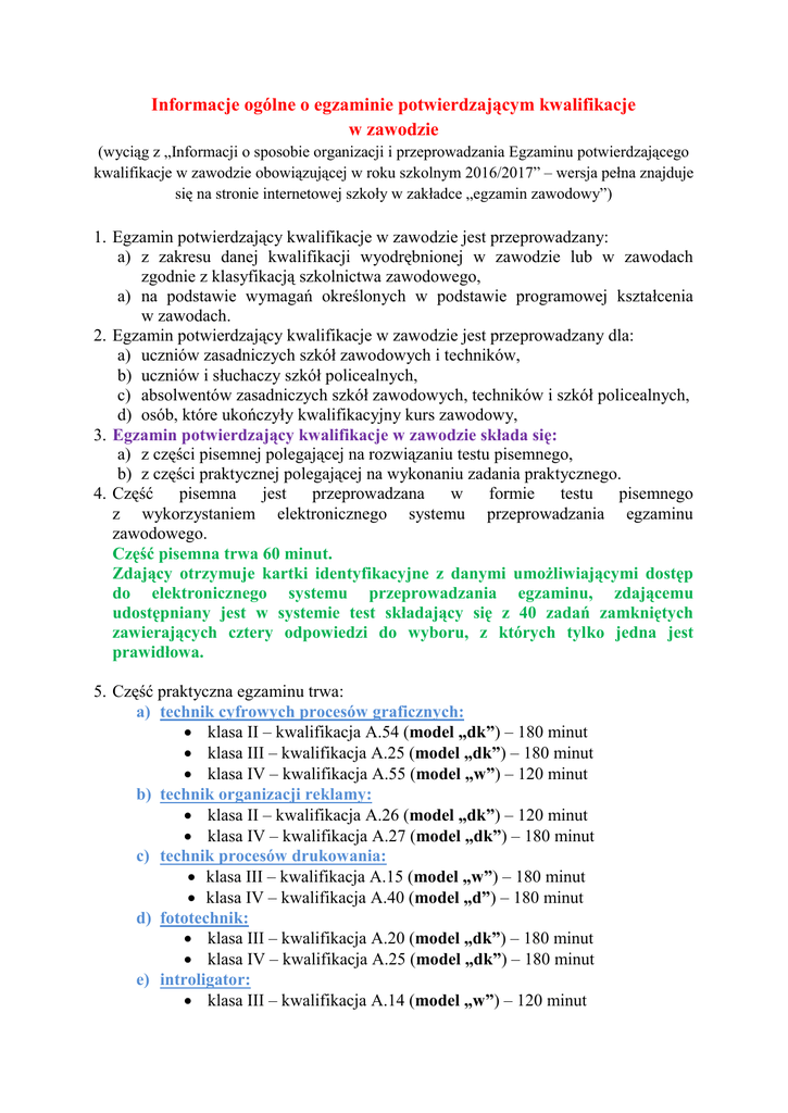 Informacje ogólne o egzaminie potwierdzającym kwalifikacje w zawodzie (wyciąg z „Informacji o sposobie organizacji i przeprowadzania Egzaminu potwierdzającego kwalifikacje w zawodzie obowiązującej w roku szkolnym 2016/2017” – wersja pełna znajduje się na stronie internetowej szkoły w zakładce „egzamin zawodowy”) 1. Egzamin potwierdzający kwalifikacje w zawodzie jest przeprowadzany: a) z zakresu danej kwalifikacji wyodrębnionej w zawodzie lub w zawodach zgodnie z klasyfikacją szkolnictwa zawodowego, a) na podstawie wymagań określonych w podstawie programowej kształcenia w zawodach. 2. Egzamin potwierdzający kwalifikacje w zawodzie jest przeprowadzany dla: a) uczniów zasadniczych szkół zawodowych i techników, b) uczniów i słuchaczy szkół policealnych, c) absolwentów zasadniczych szkół zawodowych, techników i szkół policealnych, d) osób, które ukończyły kwalifikacyjny kurs zawodowy, 3. Egzamin potwierdzający kwalifikacje w zawodzie składa się: a) z części pisemnej polegającej na rozwiązaniu testu pisemnego, b) z części praktycznej polegającej na wykonaniu zadania praktycznego. 4. Część pisemna jest przeprowadzana w formie testu pisemnego z wykorzystaniem elektronicznego systemu przeprowadzania egzaminu zawodowego. Część pisemna trwa 60 minut. Zdający otrzymuje kartki identyfikacyjne z danymi umożliwiającymi dostęp do elektronicznego systemu przeprowadzania egzaminu, zdającemu udostępniany jest w systemie test składający się z 40 zadań zamkniętych zawierających cztery odpowiedzi do wyboru, z których tylko jedna jest prawidłowa. 5. Część praktyczna egzaminu trwa: a) technik cyfrowych procesów graficznych: klasa II – kwalifikacja A.54 (model „dk”) – 180 minut klasa III – kwalifikacja A.25 (model „dk”) – 180 minut klasa IV – kwalifikacja A.55 (model „w”) – 120 minut b) technik organizacji reklamy: klasa II – kwalifikacja A.26 (model „dk”) – 120 minut klasa IV – kwalifikacja A.27 (model „dk”) – 180 minut c) technik procesów drukowania: klasa III – kwalifikacja A.15 (model „w”) – 180 minut klasa IV – kwalifikacja A.40 (model „d”) – 180 minut d) fototechnik: klasa III – kwalifikacja A.20 (model „dk”) – 180 minut klasa IV – kwalifikacja A.25 (model „dk”) – 180 minut e) introligator: klasa III – kwalifikacja A.14 (model „w”) – 120 minut f) drukarz: klasa III – kwalifikacja A.15 (model „w”) – 180 minut g) fotograf: klasa III – kwalifikacja A.20 (model „dk”) – 180 minut 6. Część praktyczna egzaminu jest przeprowadzana według modelu (formy): a) w – gdy rezultatem końcowym jest wyrób lub usługa, b) d – gdy jedynym rezultatem końcowym jest dokumentacja, c) dk – gdy jedynym rezultatem końcowym jest dokumentacja uzyskana z wykorzystaniem komputera. 7. Zdający zdał egzamin potwierdzający kwalifikacje w zawodzie, jeżeli uzyskał: z części pisemnej – co najmniej 50% punktów możliwych do uzyskania oraz z części praktycznej – co najmniej 75% punktów możliwych do uzyskania. 8. Zdający, który zdał egzamin potwierdzający kwalifikacje w zawodzie, otrzymuje świadectwo potwierdzające kwalifikację w zawodzie wydane przez okręgową komisję egzaminacyjną. 9. Zdający, który nie zdał egzaminu potwierdzającego kwalifikacje w zawodzie, otrzymuje informację o wynikach tego egzaminu opracowaną przez okręgową komisję egzaminacyjną. 10. Warunki uzyskania dyplomu potwierdzającego kwalifikacje zawodowe Osoba, która posiada: a) świadectwa potwierdzające wszystkie kwalifikacje wyodrębnione w danym zawodzie, zgodnie z klasyfikacją zawodów szkolnictwa zawodowego, oraz b) świadectwo ukończenia szkoły ponadgimnazjalnej albo dotychczasowej szkoły ponadpodstawowej lub zaświadczenie o zdaniu egzaminów eksternistycznych z zakresu wymagań określonych w podstawie programowej kształcenia ogólnego dla zasadniczej szkoły zawodowej − może otrzymać dyplom potwierdzający kwalifikacje zawodowe. Informatory o egzaminach dla zawodów znajdują się na stronie internetowej szkoły w zakładce „EGZAMIN ZAWODOWY”