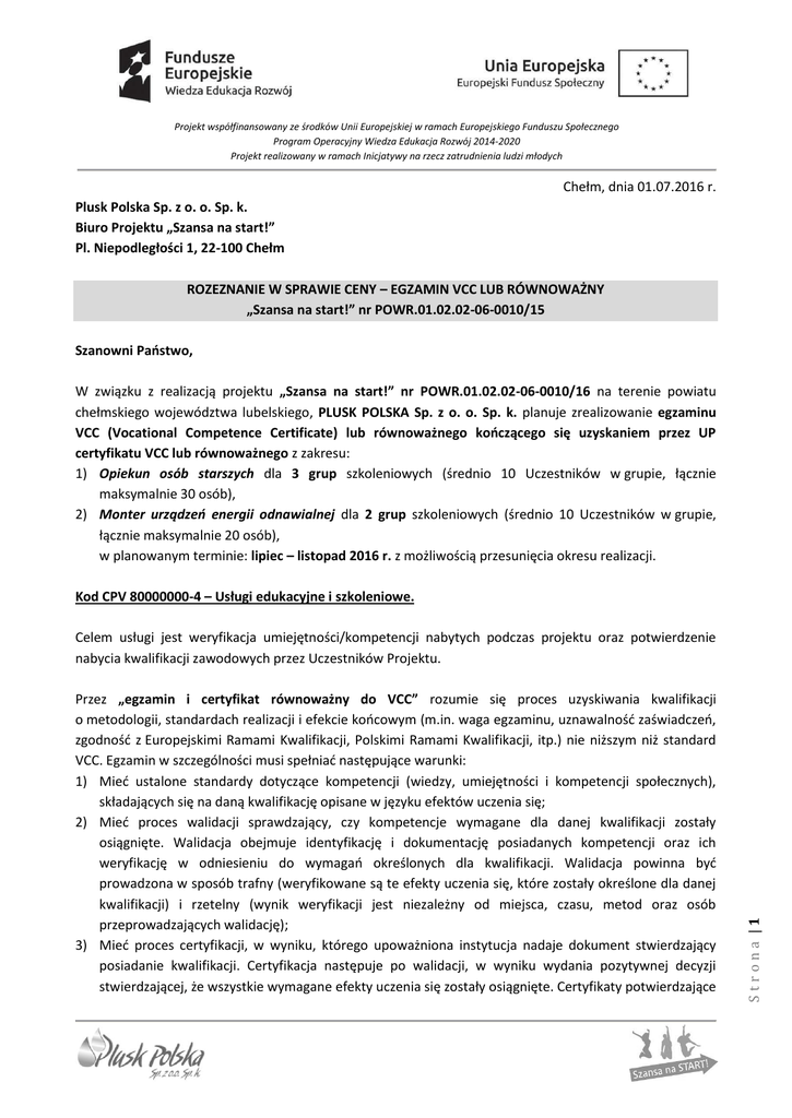 Projekt współfinansowany ze środków Unii Europejskiej w ramach Europejskiego Funduszu Społecznego Program Operacyjny Wiedza Edukacja Rozwój 2014-2020 Projekt realizowany w ramach Inicjatywy na rzecz zatrudnienia ludzi młodych Chełm, dnia 01.07.2016 r. Plusk Polska Sp. z o. o. Sp. k. Biuro Projektu „Szansa na start!” Pl. Niepodległości 1, 22-100 Chełm ROZEZNANIE W SPRAWIE CENY – EGZAMIN VCC LUB RÓWNOWAŻNY „Szansa na start!” nr POWR.01.02.02-06-0010/15 Szanowni Państwo, W związku z realizacją projektu „Szansa na start!” nr POWR.01.02.02-06-0010/16 na terenie powiatu chełmskiego województwa lubelskiego, PLUSK POLSKA Sp. z o. o. Sp. k. planuje zrealizowanie egzaminu VCC (Vocational Competence Certificate) lub równoważnego kończącego się uzyskaniem przez UP certyfikatu VCC lub równoważnego z zakresu: 1) Opiekun osób starszych dla 3 grup szkoleniowych (średnio 10 Uczestników w grupie, łącznie maksymalnie 30 osób), 2) Monter urządzeń energii odnawialnej dla 2 grup szkoleniowych (średnio 10 Uczestników w grupie, łącznie maksymalnie 20 osób), w planowanym terminie: lipiec – listopad 2016 r. z możliwością przesunięcia okresu realizacji. Kod CPV 80000000-4 – Usługi edukacyjne i szkoleniowe. Przez „egzamin i certyfikat równoważny do VCC” rozumie się proces uzyskiwania kwalifikacji o metodologii, standardach realizacji i efekcie końcowym (m.in. waga egzaminu, uznawalność zaświadczeń, zgodność z Europejskimi Ramami Kwalifikacji, Polskimi Ramami Kwalifikacji, itp.) nie niższym niż standard VCC. Egzamin w szczególności musi spełniać następujące warunki: 1) Mieć ustalone standardy dotyczące kompetencji (wiedzy, umiejętności i kompetencji społecznych), składających się na daną kwalifikację opisane w języku efektów uczenia się; 2) Mieć proces walidacji sprawdzający, czy kompetencje wymagane dla danej kwalifikacji zostały osiągnięte. Walidacja obejmuje identyfikację i dokumentację posiadanych kompetencji oraz ich weryfikację w odniesieniu do wymagań określonych dla kwalifikacji. Walidacja powinna być prowadzona w sposób trafny (weryfikowane są te efekty uczenia się, które zostały określone dla danej kwalifikacji) i rzetelny (wynik weryfikacji jest niezależny od miejsca, czasu, metod oraz osób przeprowadzających walidację); 3) Mieć proces certyfikacji, w wyniku, którego upoważniona instytucja nadaje dokument stwierdzający posiadanie kwalifikacji. Certyfikacja następuje po walidacji, w wyniku wydania pozytywnej decyzji stwierdzającej, że wszystkie wymagane efekty uczenia się zostały osiągnięte. Certyfikaty potwierdzające Strona |1 Celem usługi jest weryfikacja umiejętności/kompetencji nabytych podczas projektu oraz potwierdzenie nabycia kwalifikacji zawodowych przez Uczestników Projektu. Projekt współfinansowany ze środków Unii Europejskiej w ramach Europejskiego Funduszu Społecznego Program Operacyjny Wiedza Edukacja Rozwój 2014-2020 Projekt realizowany w ramach Inicjatywy na rzecz zatrudnienia ludzi młodych uzyskanie kwalifikacji powinny być rozpoznawalne i uznawane w danym środowisku, sektorze lub branży. Instytucje certyfikujące mogą samodzielnie przeprowadzać walidację (w takiej sytuacji procesy walidacji i certyfikacji muszą być odpowiednio rozdzielone i niezależne), bądź przekazywać ją do instytucji walidujących, np. centrów egzaminacyjnych. Zakres usługi obejmuje m.in.: Przeprowadzenie dla wskazanych Uczestników Projektu wskazanych egzaminów (teoretycznych oraz praktycznych) zakończonych wydaniem certyfikatu VCC lub równoważnego potwierdzającego nabycie kwalifikacji, w tym: a) Wynagrodzenie egzaminatora i/lub innej osoby niezbędnej do przeprowadzenia egzaminu, b) Koszt zapewnienia sali egzaminacyjnej (pomieszczenia o odpowiedniej kubaturze w stosunku do liczby uczestników egzaminu, spełniającego wymogi obowiązujących przepisów BHP), wyposażonej w sposób umożliwiający przeprowadzenie części teoretycznej i praktycznej egzaminu zawodowego, c) Przygotowanie niezbędnych materiałów egzaminacyjnych, d) Prowadzenie dokumentacji egzaminów zawierającej m.in. dziennik obecności na egzaminie, e) Wydanie certyfikatów potwierdzających nabycie kwalifikacji, f) Przygotowanie listy odbioru certyfikatów, rejestru oraz zestawienia wyników. W związku z powyższym będziemy poszukiwali 1 podmiotu, który będzie w stanie przeprowadzić całościowo ww. usługę w wyznaczonym terminie. DANE KONTAKTOWE Plusk Polska Sp. z o.o. Sp. k.: Adres Biura Projektu „Szansa na start!”: Pl. Niepodległości 1, 22-100 Chełm, E-mail: [email protected], tel.: 512026506, fax.: 134350194. INFORMACJE DODATKOWE Deklarujemy nawiązanie współpracy na podstawie umowy o świadczenie usług, w której znajdą się dodatkowo zapisy w zakresie: - obowiązku realizacji usługi z należytą starannością i wysokimi standardami, - możliwości zmiany liczby przeprowadzonych egzaminów, - obowiązku archiwizacji dokumentów realizacji Umowy zgodnie z wytycznymi Spółki, - obowiązku poddania się kontroli/audytowi realizacji Umowy zgodnie z wytycznymi Spółki, Strona |2 Informujemy, iż niniejsza procedura ma charakter tylko i wyłącznie informacyjny i nie zobowiązuje PLUSK POLSKA Sp. z o.o. Sp. k. do zawarcia umowy na określonych warunkach i z określonym podmiotem oraz nie wywołuje żadnych innych skutków formalno-prawnych. Niniejsza procedura nie rodzi roszczenia o zawarcie umowy. Projekt współfinansowany ze środków Unii Europejskiej w ramach Europejskiego Funduszu Społecznego Program Operacyjny Wiedza Edukacja Rozwój 2014-2020 Projekt realizowany w ramach Inicjatywy na rzecz zatrudnienia ludzi młodych - obowiązku zapłaty na rzecz Spółki kar umownych w przypadku m.in. realizacji Umowy bez należytej staranności, nieprzestrzegania harmonogramów realizacji Umowy itp., - możliwości dochodzenia na rzecz Spółki odszkodowania przenoszącego w