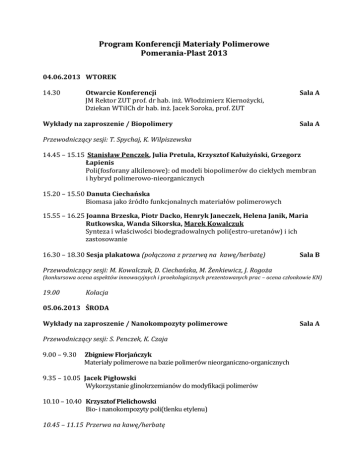 Program Konferencji Materiały Polimerowe Pomerania-Plast 2013 04.06.2013 WTOREK 14.30 Otwarcie Konferencji JM Rektor ZUT prof. dr hab. inż. Włodzimierz Kiernożycki, Dziekan WTiICh dr hab. inż. Jacek Soroka, prof. ZUT Wykłady na zaproszenie / Biopolimery Sala A Sala A Przewodniczący sesji: T. Spychaj, K. Wilpiszewska 14.45 – 15.15 Stanisław Penczek, Julia Pretula, Krzysztof Kałużyński, Grzegorz Łapienis Poli(fosforany alkilenowe): od modeli biopolimerów do ciekłych membran i hybryd polimerowo-nieorganicznych 15.20 – 15.50 Danuta Ciechańska Biomasa jako źródło funkcjonalnych materiałów polimerowych 15.55 – 16.25 Joanna Brzeska, Piotr Dacko, Henryk Janeczek, Helena Janik, Maria Rutkowska, Wanda Sikorska, Marek Kowalczuk Synteza i właściwości biodegradowalnych poli(estro-uretanów) i ich zastosowanie 16.30 – 18.30 Sesja plakatowa (połączona z przerwą na kawę/herbatę) Sala B Przewodniczący sesji: M. Kowalczuk, D. Ciechańska, M. Żenkiewicz, J. Rogoża (konkursowa ocena aspektów innowacyjnych i proekologicznych prezentowanych prac – ocena członkowie KN) 19.00 Kolacja 05.06.2013 ŚRODA Wykłady na zaproszenie / Nanokompozyty polimerowe Przewodniczący sesji: S. Penczek, K. Czaja 9.00 – 9.30 Zbigniew Florjańczyk Materiały polimerowe na bazie polimerów nieorganiczno-organicznych 9.35 – 10.05 Jacek Pigłowski Wykorzystanie glinokrzemianów do modyfikacji polimerów 10.10 – 10.40 Krzysztof Pielichowski Bio- i nanokompozyty poli(tlenku etylenu) 10.45 – 11.15 Przerwa na kawę/herbatę Sala A I Nanokompozytowe materiały polimerowe: otrzymywanie, charakterystyka i zastosowanie Sala A Przewodniczący sesji: A. Gałęski, Z. Czech Komunikaty sekcyjne 11.15 – 11.30 Jarosław Janicki, Marta Gorczowska, Czesław Ślusarczyk, Ryszard Fryczkowski Nanostruktura włókien kompozytowych polimer-grafen 11.30 – 11.45 Anna Szymczyk, Sandra Paszkiewicz, Zbigniew Rosłaniec Nanokompozyty polimerowe z udziałem grafenu 11.45 – 12.00 Agnieszka Abramowicz, Maria Obłój-Muzaj, Janusz Kozakiewicz Kompozyty PVC z hybrydowym nanonapełniaczem 12.00 – 12.15 Krzysztof Kowalczyk, Kinga Łuczka, Barbara Grzmil, Tadeusz Spychaj Poliuretanowe farby antykorozyjne z fosforanami nanocząstkowymi + 10 min dyskusja Komunikaty młodych 12.25 – 12.35 Milena Zawadowska, Stefan F. Awietjan, Ewelina Ciecierska Wpływ modyfikacji CNTs na ich uporządkowanie w matrycy polimerowej w polu elektromagnetycznym 12.35 – 12.45 Anna Szczurek, Michał Barcikowski, Justyna Krzak-Roś Warstwy, otrzymywane metodą zol-żel, pełniące funkcje proadhezyjne dla układu włókno-żywica epoksydowa w materiałach kompozytowych 12.45 – 12.55 Ryszard Pilawka, Jagoda Kowalska, Zbigniew Czech Wpływ dodatku 1-podstawionych pochodnych imidazolowych na proces sieciowania kompozycji epoksydowo-izocyjanianowych + 5 min dyskusja 13.00 Obiad II Elastomery: otrzymywanie i zastosowanie Sala B Przewodniczący sesji: G. Rokicki, Z. Rosłaniec Komunikaty sekcyjne 11.15 – 11.30 Agata Domańska, Anna Boczkowska, Zbigniew Jaegermann, Małgorzata Grądzka-Dahlke Poliuretany z krystalicznych prepolimerów odporne na zużycie ścierne 11.30 – 11.45 Aleksander Prociak, Piotr Rojek Elastyczne pianki poliuretanowe z udziałem polioli z oleju rzepakowego 11.45 – 12.00 Agnieszka Kołodziejczak-Radzimska, Teofil Jesionowski, Magdalena Maciejewska, Marian Zaborski Zastosowanie tlenku cynku modyfikowanego kwasem maleinowym w mieszankach elastomerowych 12.00 – 12.15 Jędrzej Skrobot, Mirosława El Fray Nowe elastomerowe sieci polimerowe otrzymane na drodze fotopolimeryzacji pochodnych kwasów tłuszczowych + 10 min dyskusja Komunikaty młodych 12.25 – 12.35 Paulina Dmowska, Władysław M. Rzymski, Kinga Bociong Sieciowanie i właściwości mieszanin kauczuku chloroprenowego i częściowo uwodornionego kauczuku butadienowo-akrylonitrylowego 12.35 – 12.45 Magdalena Mazurek, Izabela Steinborn-Rogulska, Gabriel Rokicki Badania nad syntezą i właściwościami biodegradowalnych poli(estrowęglano-uretanów) 12.45 – 12.55 Małgorzata Nachman, Konrad Kwiatkowski Struktura multiblokowych elastomerów uretanowych w zależności od temperatury wygrzewania + 5 min dyskusja 13.00 Obiad Wykłady na zaproszenie / Kompozyty polimerowe Sala A Przewodniczący sesji: J. Pigłowski, K. Pielichowski 14.30 – 15.00 Andrzej K. Błędzki, Adam Jaszkiewicz, Maik Feldmann, Magdalena Urbaniak Włókna celulozowe zastępują włókna szklane 15.05 – 15.35 Andrzej Gałęski, Ewa Piórkowska Kompozyty i nanokompozyty na bazie polilaktydu 15.45 – 16.15 Przerwa na kawę/herbatę III Nanokompozytowe materiały polimerowe: otrzymywanie, charakterystyka i zastosowanie Sala A Przewodniczący sesji: H. Galina, W. Królikowski Komunikaty sekcyjne 16.15 – 16.30 Mariola Sądej-Bajerlein, Ewa Andrzejewska, Hubert Gojżewski, Ariadna Nowicka, Piotr Ziobrowski, Mirosław Szybowicz, Mirosław Drozdowski Fotoutwardzalne nanokompozyty poliakrylan/krzemionka: rola progu perkolacji 16.30 – 16.45 Mariusz Oleksy, Maciej Heneczkowski, Rafał Oliwa, Henryk Galina Hybrydowe kompozyty żywic chemoutwardzalnych 16.45 – 17.00 Lidia Tokarz, Sławomir Pawłowski, Janusz Stasiński, Sebastian Firlik Nanokompozyty polioksymetylenu o większej odporności termicznej 17.00 – 17.15 Bartłomiej Waśniewski, Monika Auguścik, Małgorzata Krzyżowska, Piotr Orłowski, Joanna Ryszkowska Wpływ rodzaju diizocyjanianu na właściwości poliwęglanouretanów na implanty stałe + 10 min dyskusja Komunikaty młodych Sala A 17.25 – 17.35 Joanna Barton, Krystyna Czaja, Jacek Lipok, Katarzyna Kleinert Biodegradacja i starzenie atmosferyczne termoplastycznych kompozytów polimerowych wytworzonych na bazie odnawialnych surowców roślinnych 17.35 – 17.45 Dariusz Sobków, Krystyna Czaja Badania starzenia atmosferycznego w warunkach naturalnych kompozytów polimerowo-drzewnych 17.45 – 17.55 Rafal Oliwa, Maciej Heneczkowski, Mariusz Oleksy, Henryk Galina Laminaty 