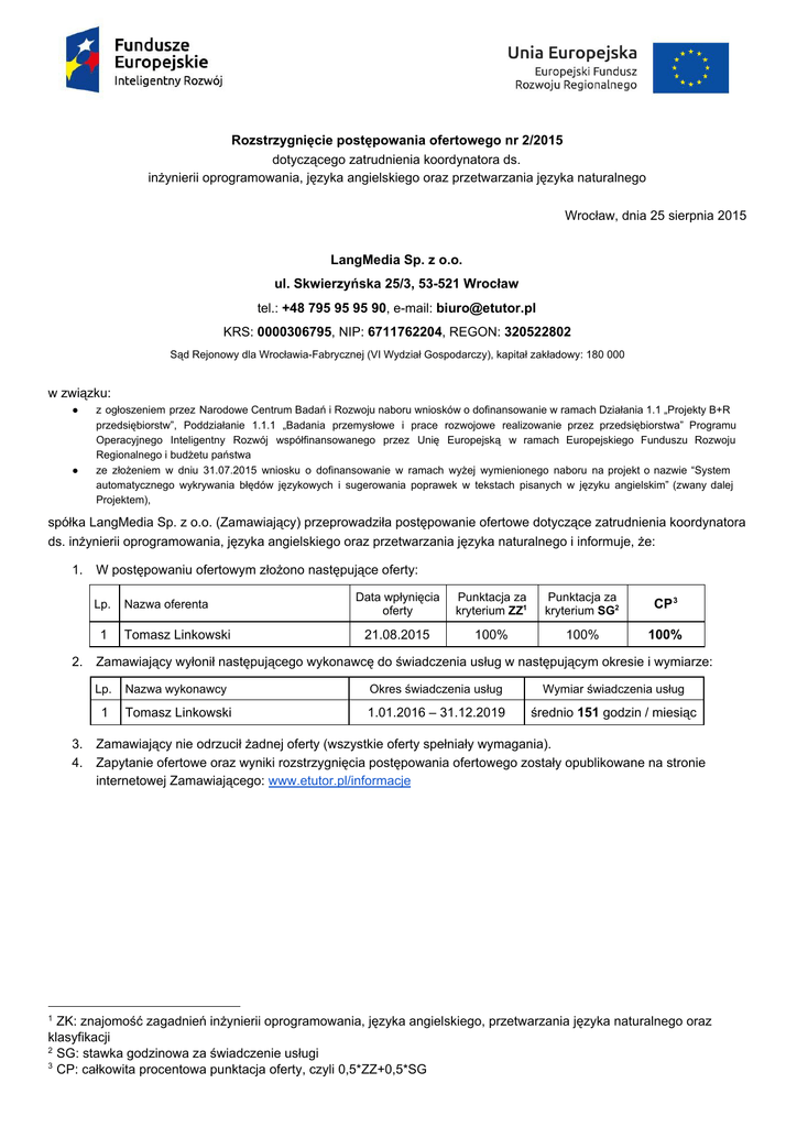 Rozstrzygnięcie postępowania ofertowego nr 2/2015 dotyczącego zatrudnienia koordynatora ds. inżynierii oprogramowania, języka angielskiego oraz przetwarzania języka naturalnego Wrocław, dnia 25 sierpnia 2015 LangMedia Sp. z o.o. ul. Skwierzyńska 25/3, 53521 Wrocław tel.: +48 795 95 95 90 , email: [email protected] KRS: 0000306795 , NIP: 6711762204 , REGON: 320522802 Sąd Rejonowy dla WrocławiaFabrycznej (VI Wydział Gospodarczy), kapitał zakładowy: 180 000 w związku: ● ● z ogłoszeniem przez Narodowe Centrum Badań i Rozwoju naboru wniosków o dofinansowanie w ramach Działania 1.1 „Projekty B+R przedsiębiorstw”, Poddziałanie 1.1.1 „Badania przemysłowe i prace rozwojowe realizowanie przez przedsiębiorstwa” Programu Operacyjnego Inteligentny Rozwój współfinansowanego przez Unię Europejską w ramach Europejskiego Funduszu Rozwoju Regionalnego i budżetu państwa ze złożeniem w dniu 31.07.2015 wniosku o dofinansowanie w ramach wyżej wymienionego naboru na projekt o nazwie “System automatycznego wykrywania błędów językowych i sugerowania poprawek w tekstach pisanych w języku angielskim” (zwany dalej Projektem), spółka LangMedia Sp. z o.o. (Zamawiający) przeprowadziła postępowanie ofertowe dotyczące zatrudnienia koordynatora ds. inżynierii oprogramowania, języka angielskiego oraz przetwarzania języka naturalnego i informuje, że: 1. W postępowaniu ofertowym złożono następujące oferty: Lp. Nazwa oferenta 1 2. Tomasz Linkowski Punktacja za kryterium ZZ1 Punktacja za kryterium SG2 CP 3 21.08.2015 100% 100% 100% Zamawiający wyłonił następującego wykonawcę do świadczenia usług w następującym okresie i wymiarze: Lp. Nazwa wykonawcy 1 3. 4. Data wpłynięcia oferty Tomasz Linkowski Okres świadczenia usług Wymiar świadczenia usług 1.01.2016 – 31.12.2019 średnio 151 godzin / miesiąc Zamawiający nie odrzucił żadnej oferty (wszystkie oferty spełniały wymagania). Zapytanie ofertowe oraz wyniki rozstrzygnięcia postępowania ofertowego zostały opublikowane na stronie internetowej Zamawiającego: www.etutor.pl/informacje 1 ZK: znajomość zagadnień inżynierii oprogramowania, języka angielskiego, przetwarzania języka naturalnego oraz klasyfikacji 2 SG: stawka godzinowa za świadczenie usługi 3 CP: całkowita procentowa punktacja oferty, czyli 0,5*ZZ+0,5*SG