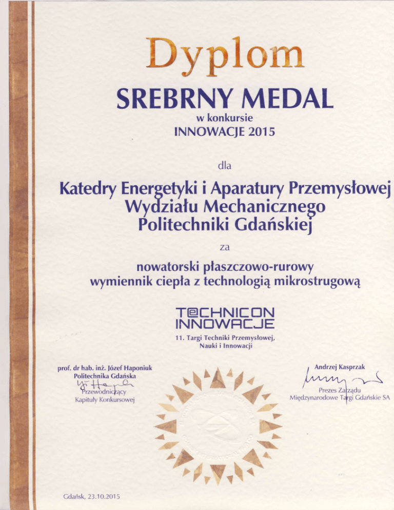 Dyplom SREBRNYMEDAL w konkursie TNNOWACJE 201s dla i Aparatu.ry Przemysłow Katedry EnergeĘki Mechan icznego Wydziału Politechniki Gdańskiei za plaszczowo-rurowy nowatorski mikrostrugową wymiennik ciep|az technologią TE!trHNItrtrN INNtrWHtrJE 1.l.TaĘi TechniłiPrzemys|owei Naukiilnnowacli P]of.dr hab.inż'JózefHaponiuk Po|itechnilaGdańska ','li\.^.Ł ?[+t-*'r-o-' rrzewoonIctący KapitulyKonkursowei AI 23.10'2015 cdańsk, AndrzeiKasprzak f .->._\ 'P&1/Ą1 PrezesZa|z4du Międfynarodowe Ttgi Cdańsłie5A ,Ę,,,.f :.Ń /