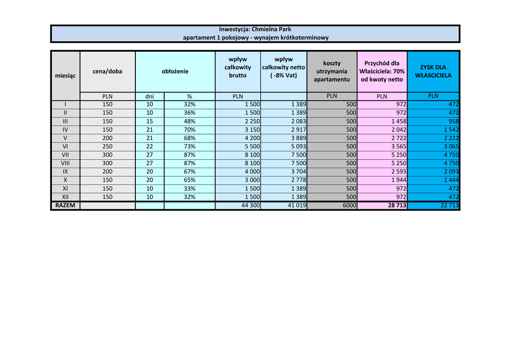 Inwestycja: Chmielna Park apartament 1 pokojowy - wynajem krótkoterminowy miesiąc I II III IV V VI VII VIII IX X XI XII RAZEM cena/doba PLN 150 150 150 150 200 250 300 300 200 150 150 150 obłożenie dni 10 10 15 21 21 22 27 27 20 20 10 10 % 32% 36% 48% 70% 68% 73% 87% 87% 67% 65% 33% 32% wpływ całkowity brutto PLN 1 500 1 500 2 250 3 150 4 200 5 500 8 100 8 100 4 000 3 000 1 500 1 500 44 300 wpływ całkowity netto ( -8% Vat) 1 389 1 389 2 083 2 917 3 889 5 093 7 500 7 500 3 704 2 778 1 389 1 389 41 019 koszty utrzymania apartamentu Przychód dla Właściciela: 70% od kwoty netto ZYSK DLA WŁASCICIELA PLN PLN PLN 500 500 500 500 500 500 500 500 500 500 500 500 6000 972 972 1 458 2 042 2 722 3 565 5 250 5 250 2 593 1 944 972 972 28 713 472 472 958 1 542 2 222 3 065 4 750 4 750 2 093 1 444 472 472 22 713 Inwestycja: Chmielna Park Apartament 1 pokojowy - wynajem długoterminowy + krótkoterminowy miesiąc I II III IV V VI VII VIII IX X XI XII RAZEM system wynajmu długoterminowy długoterminowy długoterminowy długoterminowy długoterminowy krótkoterminowy krótkoterminowy krótkoterminowy krótkoterminowy długoterminowy długoterminowy długoterminowy cena/doba PLN 0 0 0 0 0 250 300 300 200 0 0 0 wynajem długoterminowy czynsz/mc PLN 1600 1600 1600 1600 1600 0 0 0 0 wynagrodzenie dla Biura Nieruchomości 1600 1600 11200 obłożenie dni 0 0 0 0 0 22 27 27 20 0 0 0 % 0% 0% 0% 0% 0% 73% 87% 87% 67% 0% 0% 0% wpływ całkowity brutto wynajem krótkoterminowy PLN 0 0 0 0 0 5 500 8 100 8 100 4 000 0 0 0 25 700 wpływ całkowity netto ( -8% Vat) wynajem krótkoterminowy 0 0 0 0 0 5 093 7 500 7 500 3 704 0 0 0 23 796 Przychód dla Właściciela PLN Założenia: wynajem krótkoterminowy w miesiącach: czerwiec - wrzesień wynajem dugoterminowy w mieiącach: październik - maj czynsz dla Włascicela przy wynajmie długoterminowym: 1600 pln/mc, najemca długoterminowy pokrywa również koszty utrzymania apartamentu wynagrodzenie dla Biura Nieruchomości za znalezienie Najemcy długoterminowego: jednomiesięczny czynsz netto koszty ZYSK DLA utrzymania WŁASCICIELA apartamentu PLN 1 600 1 600 1 600 1 600 1 600 3 565 5 250 5 250 2 593 0 1 600 1 600 27 857 0 0 0 0 0 500 500 500 500 500 0 0 2500 PLN 1 600 1 600 1 600 1 600 1 600 3 065 4 750 4 750 2 093 -500 1 600 1 600 25 357