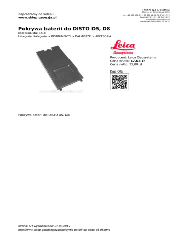 I-NET.PL Sp.J. o. GeoSklep Olsztyn, ul. Cementowa 3/301 Zapraszamy do sklepu www.sklep.geoezja.pl tel. +48 609 571 271, 89 670 11 00, 58 7 421 571 faks 89 670 11 11, 58 7421 871 e-mail [email protected] bezpłatna infolinia 800 70 30 31 Pokrywa baterii do DISTO D5, D8 kod produktu: 3218 kategoria: Kategorie > INSTRUMENTY > DALMIERZE > AKCESORIA Producent: Leica Geosystems Cena brutto: 67,65 zł Cena netto: 55,00 zł Kod QR: Pokrywa baterii do DISTO D5, D8 strona: 1/1 wydrukowano: 07-03-2017 http://www.sklep.geodezyjny.pl/pokrywa-baterii-do-disto-d5-d8.html
