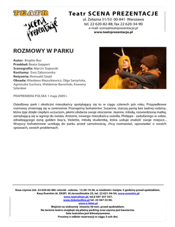 Teatr SCENA PREZENTACJE ul. Żelazna 51/53 00-841 Warszawa tel. 22 620-82-88, fax 22 620-34-90 e-mail: [email protected] www.teatrprezentacje.pl ROZMOWY W PARKU Autor: Brigitte Buc Przekład: Beata Geppert Scenografia: Marcin Stajewski Kostiumy: Ewa Zaborowska Reżyseria: Romuald Szejd Obsada: Wiesława Mazurkiewicz, Olga Sarzyńska, Agnieszka Suchora, Waldemar Barwiński, Ksawery Szlenkier PRAPREMIERA POLSKA 1 maja 2009 r. Osiedlowy park i okoliczni mieszkańcy spotykający się tu w ciągu czterech pór roku. Przypadkowe rozmowy zmieniają się w zwierzenia. Poznajemy bohaterów: Suzanne, starszą panią bez żadnej rodziny, która żyje dzięki ciepłym uczuciom, jakimi obdarza swoje otoczenie. Jeanne, młodą, rozwiedzioną matkę, zamykającą się w agresji do świata. Antoine, nowego mieszkańca osiedla, Philippe - zadufanego w sobie, zdradzającego żonę golden boy'a, Violette, młodą studentkę, która usiłuje znaleźć swoje miejsce... Wszyscy bohaterowie uciekają do parku przed samotnością, chcą rozmawiać, opowiadać o swoich sprawach, swoich problemach. Kasa czynna (tel. 22 620-82-88): wtorek –sobota: 12.30-19.30, w niedziele i święta: 3 godziny przed spektaklem. Kasy Eventim (d. ZASP) Al.Jerozolimskie 25, tel. 22 621-94-54, www.eventim.pl www.teatralium.pl, tel.0 507 357 357, www.ticketonline.pl tel. 22 567 22 00, www.e-bilet.pl Wejście na widownię otwarte 30 min. przed spektaklem. Na terenie teatru znajduje się płatny parking oraz czynna jest kawiarnia. Sala teatralna jest klimatyzowana. Prosimy o odbiór rezerwacji w ciągu 3-ech dni.
