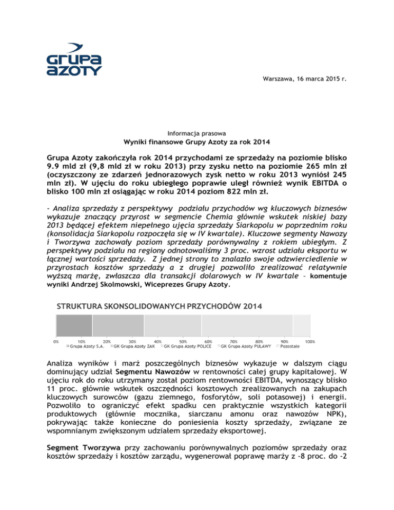 Warszawa, 16 marca 2015 r. Informacja prasowa Wyniki finansowe Grupy Azoty za rok 2014 Grupa Azoty zakończyła rok 2014 przychodami ze sprzedaży na poziomie blisko 9.9 mld zł (9,8 mld zł w roku 2013) przy zysku netto na poziomie 265 mln zł (oczyszczony ze zdarzeń jednorazowych zysk netto w roku 2013 wyniósł 245 mln zł). W ujęciu do roku ubiegłego poprawie uległ również wynik EBITDA o blisko 100 mln zł osiągając w roku 2014 poziom 822 mln zł. - Analiza sprzedaży z perspektywy podziału przychodów wg kluczowych biznesów wykazuje znaczący przyrost w segmencie Chemia głównie wskutek niskiej bazy 2013 będącej efektem niepełnego ujęcia sprzedaży Siarkopolu w poprzednim roku (konsolidacja Siarkopolu rozpoczęła się w IV kwartale). Kluczowe segmenty Nawozy i Tworzywa zachowały poziom sprzedaży porównywalny z rokiem ubiegłym. Z perspektywy podziału na regiony odnotowaliśmy 3 proc. wzrost udziału eksportu w łącznej wartości sprzedaży. Z jednej strony to znalazło swoje odzwierciedlenie w przyrostach kosztów sprzedaży a z drugiej pozwoliło zrealizować relatywnie wyższą marżę, zwłaszcza dla transakcji dolarowych w IV kwartale – komentuje wyniki Andrzej Skolmowski, Wiceprezes Grupy Azoty. Analiza wyników i marż poszczególnych biznesów wykazuje w dalszym ciągu dominujący udział Segmentu Nawozów w rentowności całej grupy kapitałowej. W ujęciu rok do roku utrzymany został poziom rentowności EBITDA, wynoszący blisko 11 proc. głównie wskutek oszczędności kosztowych zrealizowanych na zakupach kluczowych surowców (gazu ziemnego, fosforytów, soli potasowej) i energii. Pozwoliło to ograniczyć efekt spadku cen praktycznie wszystkich kategorii produktowych (głównie mocznika, siarczanu amonu oraz nawozów NPK), pokrywając także konieczne do poniesienia koszty sprzedaży, związane ze wspomnianym zwiększonym udziałem sprzedaży eksportowej. Segment Tworzywa przy zachowaniu porównywalnych poziomów sprzedaży oraz kosztów sprzedaży i kosztów zarządu, wygenerował poprawę marży z -8 proc. do -2 proc. Poprawa nastąpiła głównie wskutek maksymalizacji produkcji i wzrostu sprzedaży wolumenowej przy niższych kosztach surowców energetycznych. Segment Chemia pomimo realizacji wyższej sprzedaży (pełne ujęcie sprzedaży Siarkopolu) wykazał spadek marzy EBITDA do poziomu 45 mln zł z 71 mln zł w roku 2013. Główną przyczyną tego spadku było ujęcie w wyniku IV kwartału odpisu aktualizującego majątek w kędzierzyńskiej Spółce na kwotę 40 mln zł. Patrząc na oczyszczony wynik o ww. zdarzenie segment zanotował przyrost marży EBITDA głównie wskutek niższych kosztów surowcowych oraz lepszej koniunktury cenowej na rynku siarki granulowanej (przeznaczonej na eksport). Inwestycje Grupy Azoty w roku 2014 Łączne wydatki inwestycyjne poniesione przez Grupę Azoty w roku 2014 wyniosły 572 mln zł. Na inwestycje związane z rozwojem biznesu wydano 237 mln zł, na inwestycje związane z utrzymaniem biznesu 179 mln zł. W roku 2014 inwestycje mandatowe wyniosły 89 mln zł, a zakupy dóbr gotowych 66 mln zł. Struktura nakładów inwestycyjnych Grupy Azoty w 2014 roku W roku 2014 w tarnowskiej Spółce (Jednostka Dominująca) rozpoczęto realizację dwóch kluczowych inwestycji tj. projektu budowy nowej Wytwórni Poliamidów II 80 tys. ton/rok (łączne nakłady inwestycyjne wynoszą 320 mln zł) oraz projektu Instalacji Granulacji Mechanicznej (141 mln zł). Do najważniejszych inwestycji realizowanych w puławskiej Spółce należały zakończone instalacje: produkcji płynnych nawozów na bazie mocznika i siarczanu amonu (całkowite nakłady 69,5 mln zł) oraz stokaż amoniaku (108,5 mln zł). Ponadto realizowano instalację produkcji stałych nawozów na bazie mocznika i siarczanu amonu (w roku 2014 poniesiono nakłady 98 mln zł z 137,5 mln zł) oraz rozbudowywano sieć zbiorników do sprzedaży RSM. W Policach do najważniejszych inwestycji realizowanych w roku 2014 należały: modernizacja reaktorów syntezy amoniaku (w roku 2014 poniesiono nakłady w wys. 10,5 mln zł z 24 mln zł) rozbudowa instalacji odsiarczania gazów pokalcynacyjnych o dwa nowe reaktory (3,9 mln zł z 8,8 mln zł). Do ważniejszych inwestycji realizowanych w Grupie Azoty ZAK S.A. w 2014 roku należał I etap budowy „Nowej Elektrociepłowni” (w 2014 roku poniesiono nakłady 61 mln zł z 375 mln zł całkowitych nakładów). Wyniki skonsolidowane Grupy Azoty Puławy Puławska Spółka osiągnęła za rok 2014 r. zysk netto na poziomie 225 mln zł (305 mln zł w roku 2013) przy przychodach ze sprzedaży na poziomie blisko 3,7 mld zł wobec 3,8 mld zł w roku ubiegłym. Wyniki skonsolidowane Grupy Azoty Police Policka Spółka osiągnęła za rok 2014 r. zysk netto na poziomie 61 mln zł wobec 45 mln zł w roku ubiegłym przy przychodach ze sprzedaży na poziomie 2,4 mld zł (blisko 2,5 mld zł w roku 2013). * EBITDA i zysk netto za 4Q 2013 roku nie zawierają przekształcenia w wyniku ujęcia ostatecznego rozliczenia nabycia kontrolnego pakietu akcji spółki African Investment Group S.A. Wyniki skonsolidowane Grupy Azoty Zakłady Azotowe Kędzierzyn W ujęciu skonsolidowanym kędzierzyńska Spółka osiągnęła za rok 2014r. zysk netto na poziomie 111 mln zł (78 mln zł po odpisie aktualizacyjnym) wobec 85 mln zł w roku ubiegłym przy przychodach ze sprzedaży na poziomie blisko 2,1 mld zł (podobnie jak w roku ubiegłym). *Zdarzenie jednorazowe – odpis aktualizacyjny BKF 40 mln zł *** Grupa Azoty (jednostką dominującą jest Grupa Azoty S.A. z siedzibą w Tarnowie) to jedna z kluczowych grup kapitałowych branży nawozowo-chemicznej w Europie. Zajmuje drugą pozycję w UE w produkcji nawozów azotowych i wieloskładnikowych a takie produkty jak melamina, kaprolaktam, poliamid, alkohole OXO czy biel tytanowa mają również silną pozycję w sektorze chemicznym znajdując swoje zastosowanie w wielu gałęziach przemysłu. Grupa Az