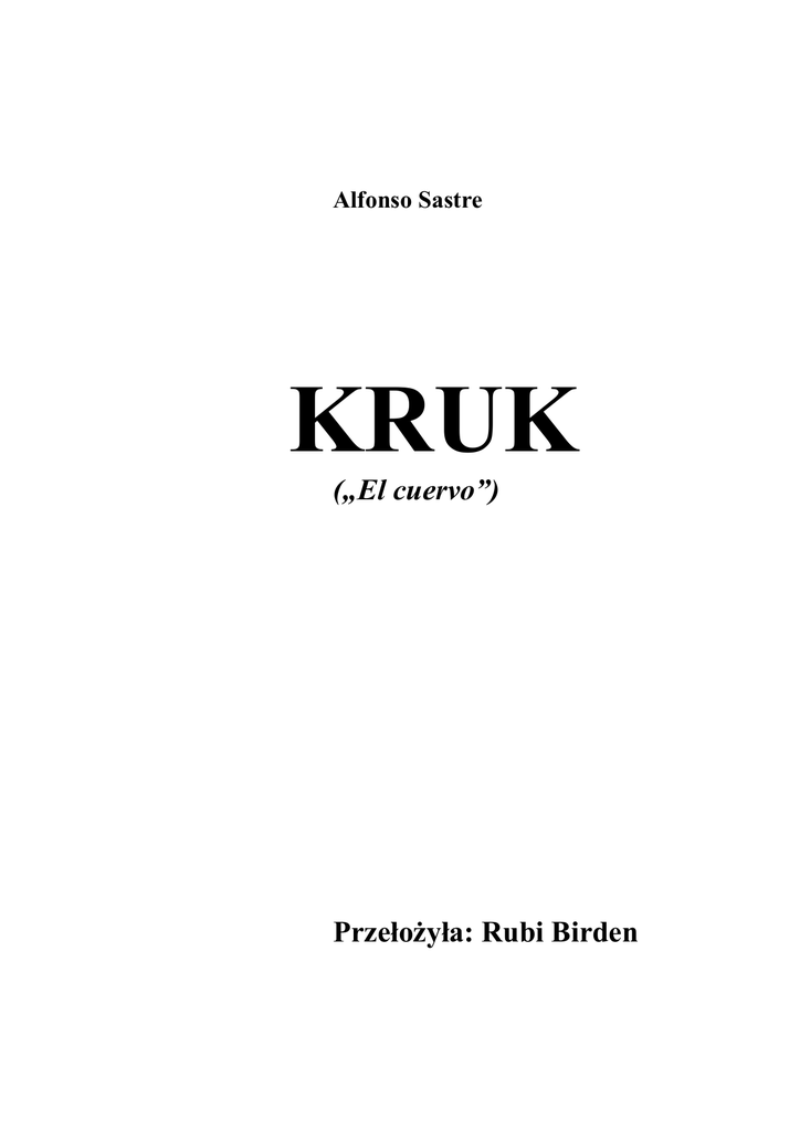 Alfonso Sastre KRUK („El cuervo”) Przełożyła: Rubi Birden OBSADA: JUAN – rzecz dzieje się w jego domu LUISA – stara służąca Juana PEDRO INES – jego żona ALBERTO LAURA – żona Juana Pokój tonie w półmroku. Kominek jest wygaszony. Cisza. Teraz słychać hałas przy drzwiach prowadzących do ogrodu, które są vis a vis okna. Ogród jest zasypany śniegiem. Zdaje się, że ktoś próbuje otworzyć drzwi. Nie udaje mu się. Słychać walenie w drzwi. Po chwili jeszcze raz, głośniejsze. Znowu zapada cisza. Ktoś, z ogrodu, popycha okno, które się otwiera. Przez okno do pokoju wchodzi mężczyzna. Zamyka okno, zasłania firanki. Rozgląda się dookoła, ledwo go widać w słabej poświacie. Porusza się tak, jakby czegoś szukał. Wpada na coś i robi hałas. Zatrzymuje się. Zapala zapałkę i podchodzi do konsoli, na której stoją świeczniki. Zapala kilka świeczek od jednej. Bierze lichtarz i stawia go na stoliku, który stoi na środku. Siada i siedzi bez ruchu. Słychać kroki. Mężczyzna nadal się nie rusza. Widać światło świecy w korytarzu. „Kto tam? Kto tam?” – słychać kobiecy głos. Kobieta wchodzi na scenę. To Luisa, stara służąca. Widzi mężczyznę, który wygląda tak, jakby sobie nie zdawał sprawy z jej obecności. LUISA: Proszę pana, to pan? (mężczyzna nie odpowiada) Proszę pana. (on nie odpowiada, Luisa się zbliża, mówi lekko drżącym głosem) Proszę pana! (mężczyzna się odwraca) O Boże! Ale się wystraszyłam. Wydawało mi się, że to nie pan. Tak tu ciemno… Jakiś czas temu wysiadło światło. Tak strasznie pada śnieg, że… JUAN: Łomotałem do drzwi. Jak mogłaś mnie nie słyszeć? LUISA: Łomotał pan? Nie słyszałam. W głębi domu… JUAN: Nie wziąłem kluczy. Musiałem wejść przez okno. LUISA: (zmieszana) Ależ, proszę pana… No tak, dzwonek nie działa… Mówi pan, że walił pan do drzwi? Nic nie słyszałam, nic a nic. Koniec świata! Proszę mi wybaczyć. JUAN: Nie przejmuj się. Ale byłoby miło, gdybyś napaliła w kominku, Luiso. Ogień zgasł i strasznie tu zimno. LUISA: Przepraszam pana. Nic mi dzisiaj nie wychodzi. W domu wszystko dziś się wali. Przepraszam. (próbuje przegarnąć popiół) Jestem trochę chora. Wie pan? Troszkę chora. Nie sądzę, żeby to było coś poważnego, ale kiepsko się czuję. JUAN: Poważnie, Luiso? Jesteś chora? LUISA: Tak, proszę pana. JUAN: Czemu mi wcześniej nie powiedziałaś? W takim razie musisz się położyć. Jutro wezwiemy lekarza. LUISA: Nie sądzę, żeby to było potrzebne, proszę pana. JUAN: Zostaw to. Sam rozpalę. LUISA: Nie w tym rzecz, proszę pana. Mam siłę i nic mnie nie boli. JUAN: W takim razie o co chodzi? LUISA: Wie pan, mam jakąś manię myślenia o wszystkim. Ciągle rozmyślam i zapominam o podstawowych rzeczach. Tylko tyle mi dolega. Nagle zaczynam się nad czymś zastanawiać, nad czymś kompletnie bez znaczenia. Wiem, że to nieważne, ale nie mogę przestać o tym myśleć, a potem to już nawet nie słyszę, co się do mnie mówi, ani nie wiem, co robię. Psiakość! Myślę dotąd, aż uda mi się dojść do wniosku, że w tej nieistotnej rzeczy nie ma nic złego i dopiero wtedy się uspokajam. Ale ile muszę się nakombinować, zanim do tego dojdę! JUAN: To wszystko z przemęczenia, Luiso. Musisz odpocząć. Dam ci urlop, należy ci się aż nadto. LUISA: Nie, dziękuję. Dokąd bym miała pójść? Poza tym domem nikt na mnie nie czeka. Nikt by się nie ucieszył z mojego przyjazdu. Nikogo nie znam. Ci, którzy byli moimi przyjaciółmi… i przyjaciółkami… nie żyją. JUAN: Luiso, musisz się stąd wyrwać. Siedzisz tu jak w zamknięciu już tyle czasu. To niezdrowe. LUISA: Nie… Bardzo mi tu dobrze… To mi przejdzie, zobaczy pan. Jeśli wyśle mnie pan na urlop, nie będę wiedziała, co ze sobą zrobić. Będę się snuć smutna, posiedzę w parku. Najdą mnie myśli o śmierci. Wolę poczekać, aż mi to przejdzie. Przecież to nie może być nic poważnego. To tylko głupie myśli, a przecież głupie myśli nigdy nie mają większego znaczenia. Źle to jest wtedy, kiedy ktoś zachoruje na płuca albo dostanie raka, wtedy jest faktycznie źle. Cała reszta to… JUAN: (obserwuje ją) Co się dzieje, Luiso? LUISA: Co, proszę pana? JUAN: Masz takie oczy, jakbyś wcześniej płakała. LUISA: Proszę się mną nie przejmować. Niech się pan mną nie przejmuje. JUAN: Czemu? LUISA: Słucham? Co czemu? JUAN: Czemu płakałaś? LUISA: Bo… To prawda, byłam dziś smutna. JUAN: (przygląda jej się uważnie) Właśnie dziś? LUISA: (opuszcza wzrok) Tak, proszę pana. No, bo… JUAN: (spinając się w sobie) Nic nie mów. Nie zaczynaj teraz o… tamtym. LUISA: (zdenerwowana) Nie, nie, proszę pana. Nie chciałam nic powiedzieć, zapewniam pana. JUAN: (z szeroko otwartymi oczyma) Luiso, nie powinnaś o tym myśleć. Nawet myśleć. LUISA: Tak, proszę pana. JUAN: (dziwnym głosem) Myślisz. LUISA: (przerażona) Proszę pana! JUAN: Myślisz o niej. LUISA: Nie! Przysięgam panu, że nie! JUAN: Tak? (przymyka oczy) To trudne nie myśleć o niej dzisiaj, prawda Luiso? LUISA: Tak, proszę pana. To naprawdę trudne. Był taki dzień, jak dzisiaj. Też od rana padał śnieg. JUAN: Tak… pamiętam… W ogrodzie taki sam śnieg… Było tak samo zimno… kiedy przyszedłem o tej porze, też się nie paliło w kominku. LUISA: Dziś mija dokładnie rok, proszę pana. JUAN: Tak. LUISA: Dlatego zrobiło mi się smutno. Siedziałam sama w moim pokoju i zaczęłam płakać… JUAN: Cieszę się, że tu jesteś, Luiso. Sam bym nie przeżył tej nocy. LUISA: Kiedy się siedzi w samotności, człowiekowi robi się czasem nieswojo… JUAN: (rozgląda się podejrzliwie wokół) Ta noc. LUISA: Jeśli mam być szczera, nie udało mi się zatrzeć w pamięci tamtej nocy. JUAN: Co takiego? LUISA: Bałam się. Tak, chwilę temu. Byłam w kuchni. Zestawiałam garnek z ognia i odrobina wody spadła na palnik. Woda zasyczała na rozż