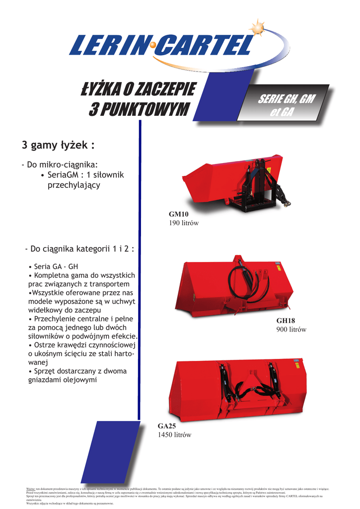 ŁYŻKA O ZACZEPIE 3 PUNKTOWYM SERIE GH, GM et GA 3 gamy łyżek : - Do mikro-ciągnika: •SeriaGM : 1 siłownik przechylający GM10 190 litrów - Do ciągnika kategorii 1 i 2 : • Seria GA - GH • Kompletna gama do wszystkich prac związanych z transportem •Wszystkie oferowane przez nas modele wyposażone są w uchwyt widełkowy do zaczepu • Przechylenie centralne i pełne za pomocą jednego lub dwóch siłowników o podwójnym efekcie. • Ostrze krawędzi czynnościowej o ukośnym ścięciu ze stali hartowanej • Sprzęt dostarczany z dwoma gniazdami olejowymi GH18 900 litrów GA25 1450 litrów Ważne: ten dokument przedstawia maszyny z ich opisami technicznymi w momencie publikacji dokumentu. Te ostatnie podane są jedynie jako umowne i ze względu na nieustanny rozwój produktów nie mogą być uznawane jako ostateczne i wiążące. Przed wszystkimi zamówieniami, zaleca się, konsultację z naszą firmą w celu zapoznania się z ewentualnie wniesionymi udoskonaleniami i nową specyfikacją techniczną sprzętu, którym są Państwo zainteresowani. Sprzęt ten przeznaczony jest dla profesjonalistów, którzy potrafią ocenić jego możliwości w stosunku do pracy jaką mają wykonać. Sprzedaż maszyn odbywa się według ogólnych zasad i warunków sprzedaży firmy CARTEL sformułowanych na zamówieniu. Wszystkie zdjęcia wchodzące w skład tego dokumentu są pozaumowne. ŁYŻKA O ZACZEPIE 3 PUNKTOWYM do ciągnika rolniczego kategorii 1 ŁYŻKA O ZACZEPIE 3 PUNKTOWYM do mikro-ciągnika Seria GM Charakterystyka Szerokość (m) Głębokość (m) Objetość (l) Ciężar (kg) Siłowniki o podwójnym efekcie Grubość balchy (mm) Charakterystyka Szerokość (m) Głębokość (m) Objetość (l) Ciężar (kg) Siłowniki o podwójnym efekcie Grubość balchy (mm) Seria GH GM10 1 0,92 190 110 GH12 GH15 GH18 GH20 1,2 1,5 1,8 2 1,05 1,05 1,05 1,05 600 750 900 1 000 260 290 315 330 1 1 1 1 4 4 4 4 ŁYŻKA O ZACZEPIE 3 PUNKTOWYM do ciągnika rolniczego kategorii 2 Seria GA 1 3 Charakterystyka Szerokość (m) Głębokość (m) Objetość (l) Ciężar (kg) Siłowniki o podwójnym efekcie Grubość balchy (mm) GA20 GA23 GA25 2 2,3 2,5 1,05 1,05 1,05 1 160 1 334 1 450 430 470 495 2 2 2 5 5 5 LERIN CARTEL - ZA du Cormelia • F.85500 Chambretaud • Tél : +332.51.61.50.50 - Fax : +332.51.91.50.00 Mail : [email protected] - Site web : www.groupe-cartel.fr Ważne: ten dokument przedstawia maszyny z ich opisami technicznymi w momencie publikacji dokumentu. Te ostatnie podane są jedynie jako umowne i ze względu na nieustanny rozwój produktów nie mogą być uznawane jako ostateczne i wiążące. Przed wszystkimi zamówieniami, zaleca się, konsultację z naszą firmą w celu zapoznania się z ewentualnie wniesionymi udoskonaleniami i nową specyfikacją techniczną sprzętu, którym są Państwo zainteresowani. Sprzęt ten przeznaczony jest dla profesjonalistów, którzy potrafią ocenić jego możliwości w stosunku do pracy jaką mają wykonać. Sprzedaż maszyn odbywa się według ogólnych zasad i warunków sprzedaży firmy CARTEL sformułowanych na zamówieniu. Wszystkie zdjęcia wchodzące w skład tego dokumentu są pozaumowne.