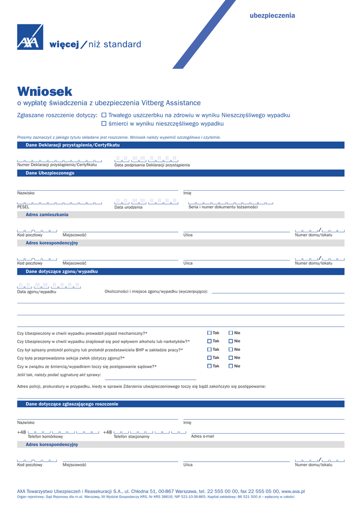 ubezpieczenia Wniosek o wypłatę świadczenia z ubezpieczenia Vitberg Assistance Zgłaszane roszczenie dotyczy: Trwałego uszczerbku na zdrowiu w wyniku Nieszczęśliwego wypadku śmierci w wyniku nieszczęśliwego wypadku Prosimy zaznaczyć z jakiego tytułu składane jest roszczenie. Wniosek należy wypełnić szczegółowo i czytelnie. Dane Deklaracji przystąpienia/Certyfikatu D D M M R R R R Numer Deklaracji przystąpienia/Certyfikatu Data podpisania Deklaracji przystąpienia Dane Ubezpieczonego Nazwisko Imię D D M M R R R R PESEL Seria i numer dokumentu tożsamości Data urodzenia Adres zamieszkania - Kod pocztowy Miejscowość Ulica Numer domu/lokalu Ulica Numer domu/lokalu Adres korespondencyjny - Kod pocztowy Miejscowość Dane dotyczące zgonu/wypadku D D M M R R R R Okoliczności i miejsce zgonu/wypadku (wyczerpująco): Data zgonu/wypadku Czy Ubezpieczony w chwili wypadku prowadził pojazd mechaniczny?* Tak Nie Czy Ubezpieczony w chwili wypadku znajdował się pod wpływem alkoholu lub narkotyków?* Tak Nie Czy był spisany protokół policyjny lub protokół przedstawiciela BHP w zakładzie pracy?* Tak Nie Czy była przeprowadzona sekcja zwłok (dotyczy zgonu)?* Tak Nie Czy w związku ze śmiercią/wypadkiem toczy się postępowanie sądowe?* Tak Nie Jeśli tak, należy podać sygnaturę akt sprawy: Adres policji, prokuratury w przypadku, kiedy w sprawie Zdarzenia ubezpieczeniowego toczy się bądź zakończyło się postępowanie: Dane dotyczące zgłaszającego roszczenie Nazwisko +48 Imię Telefon komórkowy +48 Telefon stacjonarny Adres e-mail Adres korespondencyjny - Kod pocztowy Miejscowość Ulica Numer domu/lokalu AXA Towarzystwo Ubezpieczeń i Reasekuracji S.A., ul. Chłodna 51, 00-867 Warszawa, tel. 22 555 00 00, fax 22 555 05 00, www.axa.pl Organ rejestrowy: Sąd Rejonowy dla m.st. Warszawy, XII Wydział Gospodarczy KRS, Nr KRS 38616; NIP 521-10-36-865; Kapitał zakładowy: 86 521 500 zł – wpłacony w całości Forma wypłaty świadczenia* Przelew bankowy Imię i nazwisko właściciela rachunku bankowego Numer rachunku bankowego Adres właściciela rachunku bankowego: - Kod pocztowy Miejscowość Ulica Numer domu/lokalu Miejscowość Ulica Numer domu/lokalu Przekaz pocztowy Adres: - Kod pocztowy Oświadczam, że na powyższe pytania odpowiedziałem(am) zgodnie z prawdą. D D Miejscowość M M R R R R Data Podpis zgłaszającego roszczenie Dokumenty wymagane do zgłoszenia roszczenia Prosimy przekazać do Towarzystwa oryginały lub kopie następujących dokumentów poświadczonych za zgodność z oryginałem przez odpowiednio notariusza, pracownika USC, pracownika Towarzystwa, pracownika Ubezpieczającego – Vitberg Jacek Sikora, Agenta – Andrzeja Józefowskiego prowadzącego działalność gospodarczą pod firmą Kancelaria Finansowo-Ubezpieczeniowa JN Andrzej Józefowski bądź – w przypadku dokumentacji medycznej – pracownika placówki medycznej, z której pochodzi dokumentacja. Dokumenty sporządzone w języku obcym, przed złożeniem Towarzystwu, powinny zostać przetłumaczone na język polski przez tłumacza przysięgłego. Prosimy zaznaczyć krzyżykiem załączane do wniosku kopie dokumentów. ŚMIERĆ UBEZPIECZONEGO W WYNIKU NIESZCZĘŚLIWEGO WYPADKU Do wniosku należy dołączyć: TRWAŁY USZCZERBEK NA ZDROWIU UBEZPIECZONEGO W WYNIKU NIESZCZĘŚLIWEGO WYPADKU Do wniosku należy dołączyć: opis okoliczności zdarzenia kopię opisu świadczenia pierwszej pomocy lub pomocy doraźnej (pogotowie ratunkowe, szpital) kopię protokołu opisującego okoliczności zdarzenia (protokołu powypadkowego sporządzonego przez Komisję BHP, notatki urzędowej z policji, protokołu oględzin miejsca zdarzenia w przypadku wypadku komunikacyjnego, informacji o sposobie zakończenia postępowania przygotowawczego, w przypadku gdy zostało wszczęte postępowanie przygotowawcze lub kopii postanowienia o umorzeniu postępowania) kopię dokumentacji medycznej, potwierdzającej wystąpienie zdarzenia ubezpieczeniowego, w tym: karty informacyjnej leczenia szpitalnego lub adresów placówek, w których Ubezpieczony był zarejestrowany, leczony w związku z zaistniałym zdarzeniem kopię dowodu osobistego lub innego dokumentu tożsamości Ubezpieczonego kopię odpisu skróconego aktu zgonu Ubezpieczonego kopię karty statystycznej do karty zgonu lub innej dokumentacji medycznej potwierdzającej przyczynę śmierci kopię opisu świadczenia pierwszej pomocy lub pomocy doraźnej (pogotowie ratunkowe, szpital itp.) kopię protokołu opisującego okoliczności zdarzenia (protokół policyjny), dokumentacji postępowania karnego, jeżeli takie zostało wszczęte (np. postępowanie prokuratury, wyrok sądu) kopię dokumentacji medycznej z przychodni, szpitala lub adresy placówek, w których Ubezpieczony był zarejestrowany i leczony w związku z zaistniałym zdarzeniem będącym przedmiotem zgłoszonego roszczenia kopię dowodu osobistego lub innego dokumentu tożsamości każdego z Uprawnionych do otrzymania świadczenia kopie odpisu postanowienia sądu o stwierdzeniu nabycia spadku lub notarialnego poświadczenia dziedziczenia – jeżeli Uprawniony jest spadkobiercą Ubezpieczonego Oświadczenie osoby zgłaszającej roszczenie Wyrażam zgodę na przetwarzanie moich danych przez AXA Towarzystwo Ubezpieczeń i Reasekuracji S.A., z siedzibą w Warszawie przy ul. Chłodnej 51 („Towarzystwo”), dla celów związanych z obsługą zgłoszonego roszczenia. Zostałem(am) poinformowany(a) o tym, że Towarzystwo jest administratorem moich danych osobowych oraz oświad- D D Miejscowość M M czam, że jestem świadomy(a), iż podanie moich danych osobowych jest dobrowolne, jednak niezbędne do rozpatrzenia mojego roszczenia, oraz że mam prawo dostępu do treści moich danych osobowych i prawo ich poprawiania oraz wniesienia żądania zaprzestania przetwarzania moich danych. R R R R Data Czytelny podpis osoby zgłaszającej roszczenie Oświadczenie Ubezpieczonego Ja niżej podpis