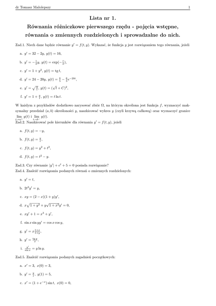dr Tomasz Małolepszy 1 Lista nr 1. Równania różniczkowe pierwszego rzędu - pojęcia wstępne, równania o zmiennych rozdzielonych i sprowadzalne do nich. Zad.1. Niech dane będzie równanie y 0 = f (t, y). Wykazać, że funkcja y jest rozwiązaniem tego równania, jeżeli a. y 0 = 32 − 2y, y(t) = 16, b. y 0 = − 21 y, y(t) = exp(− 2t ), c. y 0 = 1 + y 2 , y(t) = tg t, d. y 0 = 24 − 20y, y(t) = e. y 0 = py t, 6 5 − 65 e−20t , √ y(t) = ( t + C)2 , f. y 0 = 1 + yt , y(t) = t ln t. W każdym z przykładów dodatkowo narysować zbiór Ω, na którym określona jest funkcja f , wyznaczyć maksymalny przedział (a, b) określoności y, naszkicować wykres y (czyli krzywą całkową) oraz wyznaczyć granice lim y(t) i lim y(t). t→b− t→a+ Zad.2. Naszkicować pole kierunków dla równania y 0 = f (t, y), jeżeli a. f (t, y) = −y, b. f (t, y) = yt , c. f (t, y) = y 2 + t2 , d. f (t, y) = t2 − y. Zad.3. Czy równanie |y 0 | + et + 5 = 0 posiada rozwiązanie? Zad.4. Znaleźć rozwiązania podanych równań o zmiennych rozdzielonych: a. y 0 = t, b. 2t2 y 0 = y, c. xy = (2 − x)(1 + y)y 0 , p √ d. x 1 + y 2 + y 1 + x2 y 0 = 0, e. xy 0 + 1 = x3 + y 0 , f. sin x sin yy 0 = cos x cos y, g. y 0 = x 1+x 1+y , h. y 0 = i. y0 sin x tg y x , = y ln y. Zad.5. Znaleźć rozwiązania podanych zagadnień początkowych: a. x0 = 3, x(0) = 3, b. y 0 = yt , y(1) = 5, c. x0 = (1 + e−x ) sin t, x(0) = 0, 2 dr Tomasz Małolepszy d. y 0 = −y 2 et , y(0) = 1, e. txx0 = ln t, x(1) = 1. Wyznaczyć przedziały, na którym rozwiązania powyższych zagadnień są określone. Czy te rozwiązania są jedyne? Zad.6. Rozwiązać następujące równania jednorodne: a. xy 0 = x + y, b. (x + y)y 0 + y = 0, p c. xy 0 = y + x2 + y 2 , d. y 0 = y x + tg xy , e. (x2 − xy)y 0 + y 2 = 0. Zad.7. Znaleźć rozwiązania podanych zagadnień początkowych: a. y 0 = y 2 +ty t2 , y(1) = −1, b. ty 0 = y(ln yt + 1), y(1) = e, c. ty 0 = y + t exp( yt ), y(1) = 0. Wyznaczyć przedziały, na którym rozwiązania powyższych zagadnień są określone. Czy te rozwiązania są jedyne? Zad.8. Znaleźć rozwiązania następujących równań typu y 0 = f (ay + bx + c): a. y 0 = 5x − 3y + 7, b. y 0 = 1 2x+y−2 + 2x + y − 2, c. y 0 = (x + 2y + 3)2 , d. y 0 = (x − y)2 , e. 2x + 3y − 1 + (4x + 6y − 5)y 0 = 0, f. y 0 = (2x + y − 3)2 − 4x − 2y + 5.