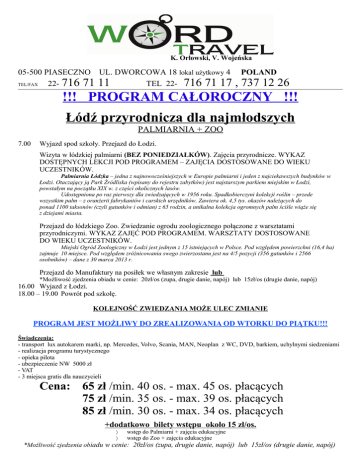 K. Orłowski, V. Wojeńska 05-500 PIASECZNO UL. DWORCOWA 18 lokal użytkowy 4 TEL/FAX 22- 716 71 11 TEL 22- 716 71 17 POLAND , 737 12 26 !!! PROGRAM CAŁOROCZNY !!! Łódź przyrodnicza dla najmłodszych PALMIARNIA + ZOO 7.00 Wyjazd spod szkoły. Przejazd do Łodzi. Wizyta w łódzkiej palmiarni (BEZ PONIEDZIAŁKÓW). Zajęcia przyrodnicze. WYKAZ DOSTĘPNYCH LEKCJI POD PROGRAMEM – ZAJĘCIA DOSTOSOWANE DO WIEKU UCZESTNIKÓW. Palmiarnia Łódzka – jedna z najnowocześniejszych w Europie palmiarni i jeden z najciekawszych budynków w Łodzi. Otaczający ją Park Źródliska (wpisany do rejestru zabytków) jest najstarszym parkiem miejskim w Łodzi, powstałym na początku XIX w. z części okolicznych lasów. Udostępniona po raz pierwszy dla zwiedzających w 1956 roku. Spadkobierczyni kolekcji roślin – przede wszystkim palm – z oranżerii fabrykantów i carskich urzędników. Zawiera ok. 4,5 tys. okazów należących do ponad 1100 taksonów (czyli gatunków i odmian) z 65 rodzin, a unikalna kolekcja ogromnych palm ściśle wiąże się z dziejami miasta. Przejazd do łódzkiego Zoo. Zwiedzanie ogrodu zoologicznego połączone z warsztatami przyrodniczymi. WYKAZ ZAJĘĆ POD PROGRAMEM. WARSZTATY DOSTOSOWANE DO WIEKU UCZESTNIKÓW. Miejski Ogród Zoologiczny w Łodzi jest jednym z 15 istniejących w Polsce. Pod względem powierzchni (16,4 ha) zajmuje 10 miejsce. Pod względem zróżnicowania swego zwierzostanu jest na 4/5 pozycji (356 gatunków i 2566 osobników) – dane z 30 marca 2013 r. Przejazd do Manufaktury na posiłek we własnym zakresie lub *Możliwość zjedzenia obiadu w cenie: 20zł/os (zupa, drugie danie, napój) lub 15zł/os (drugie danie, napój) 16.00 Wyjazd z Łodzi. 18.00 – 19.00 Powrót pod szkołę. KOLEJNOŚĆ ZWIEDZANIA MOŻE ULEC ZMIANIE PROGRAM JEST MOŻLIWY DO ZREALIZOWANIA OD WTORKU DO PIĄTKU!!! Świadczenia: - transport lux autokarem marki, np. Mercedes, Volvo, Scania, MAN, Neoplan z WC, DVD, barkiem, uchylnymi siedzeniami - realizacja programu turystycznego - opieka pilota - ubezpieczenie NW 5000 zł - VAT - 3 miejsca gratis dla nauczycieli Cena: 65 zł /min. 40 os. - max. 45 os. płacących 75 zł /min. 35 os. - max. 39 os. płacących 85 zł /min. 30 os. - max. 34 os. płacących +dodatkowo bilety wstępu około 15 zł/os. wstęp do Palmiarni + zajęcia edukacyjne wstęp do Zoo + zajęcia edukacyjne *Możliwość zjedzenia obiadu w cenie: 20zł/os (zupa, drugie danie, napój) lub 15zł/os (drugie danie, napój) Standardowy rozmiar naszych autokarów to 49 miejsc (do dyspozycji grupy wraz z opiekunami). Na Państwa życzenie możemy zarezerwować autokary 57-70 miejsc (w tym przypadku prosimy o kontakt z biurem w celu sprawdzenia kalkulacji na ponadstandardowy pojazd i jego dostępności w wybranym przez Państwa terminie). W celu podpisania umowy i rezerwacji konkretnego terminu prosimy o telefon do biura 022 716 71 11 lub 022 716 71 17 lub mail [email protected] Zaliczka konieczna do podpisania umowy 40zł/os. Ze względu na szczyt sezonu wycieczek szkolnych w miesiącach maj-czerwiec sugerujemy dokonanie rez. wstępnej na czas zebrania zaliczek! KWOTĘ NA BILETY WSTĘPU POTWIERDZAMY PRZED DOPŁATĄ ZGODNIE Z OBOWIĄZUJĄCYMI CENNIKAMI. Wyciąg z warunków uczestnictwa imprez turystycznych organizowanych przez B.P. Word Travel (pełna wersja warunków uczestnictwa dostępna jest u nauczyciela organizującego wycieczkę): 13. W przypadku rezygnacji lub nie uczestniczenia Uczestnika w wykupionej imprezie Organizator uprawniony jest do potrącenia RZECZYWIŚCIE PONIESIONYCH KOSZTÓW. 14. Zmiana uczestnika nie pociąga za sobą kosztów finansowych. 18. Uczestnik odpowiada za wszelkie szkody materialne wyrządzone w trakcie trwania imprezy (zniszczenia w hotelu, autokarze). 15. Jeżeli w programie jest wyjazd poza granicę Polski - uczestnik winien posiadać na miejscu zbiórki aktualnie obowiązujące dokumenty uprawniające do przekroczenia granic krajów objętych programem imprezy (wyłącznie dowód osobisty lub paszport ważny min. 6 m-cy od daty powrotu). 9 B. W przypadku chorób uznawanych za przewlekłe uczestnik winien na własny koszt wykupić dodatkowe ubezpieczenie ! (dotyczy wycieczek zagranicznych). Klient przez dokonanie wpłaty (całkowitej lub częściowej) akceptuje program wycieczki i warunki uczestnictwa. ZAJĘCIA PRZYRODNICZE W ŁÓDZKIEJ PALMIARNI Przedszkole Znane i nieznane egzotyczne rośliny jadalne - Temat realizowany na terenie Palmiarni. Celem zajęć jest zapoznanie dzieci z roślinami, których owoce, liście, kwiaty i inne elementy są przez człowieka wykorzystywane w żywieniu. W czasie spaceru po Palmiarni, dzieci mają za zadanie odszukać znane im owoce. Przy wszystkich prezentowanych podczas zajęć roślinach prowadzona jest krótka pogadanka. Pod koniec zajęć dzieci otrzymują karty pracy. Ich zadaniem jest pokolorowanie rysunków poznanych na zajęciach owoców. Zielona zima - Temat realizowany na terenie Palmiarni w czasie zimy. W czasie wędrówki po Palmiarni zwracana jest uwaga dzieci na to, że choć w Polsce zimą wegetacja zanika, to jednak w wielu miejscach na ziemi zjawisko to nie występuje. Wprowadzona zostaje tematyka strefowości klimatu i roślinności na Ziemi. Zwiedzanie Palmiarni z przewodnikiem - Temat realizowany na terenie Palmiarni. W trakcie wspólnego spaceru z przewodnikiem, dzieci poznają historię Palmiarni oraz najważniejsze elementy kolekcji roślin szklarniowych. Przewodnik prezentuje rośliny egzotyczne pochodzące z różnych części świata, rośliny w danym momencie kwitnące, owocujące, a także cechujące się swoistymi, często niezwykłymi przystosowaniami. Prezentowane są również przykłady zastosowań tych roślin przez człowieka. Szkoła podstawowa klasy I-III Osobliwości świata roślin - Temat realizowany na terenie Palmiarni. W czasie zajęć dzieci zapoznają się z najbardziej niezwykłymi roślinami znajdującymi się w kolekcji Palmiarni (m.in.: palma dakt